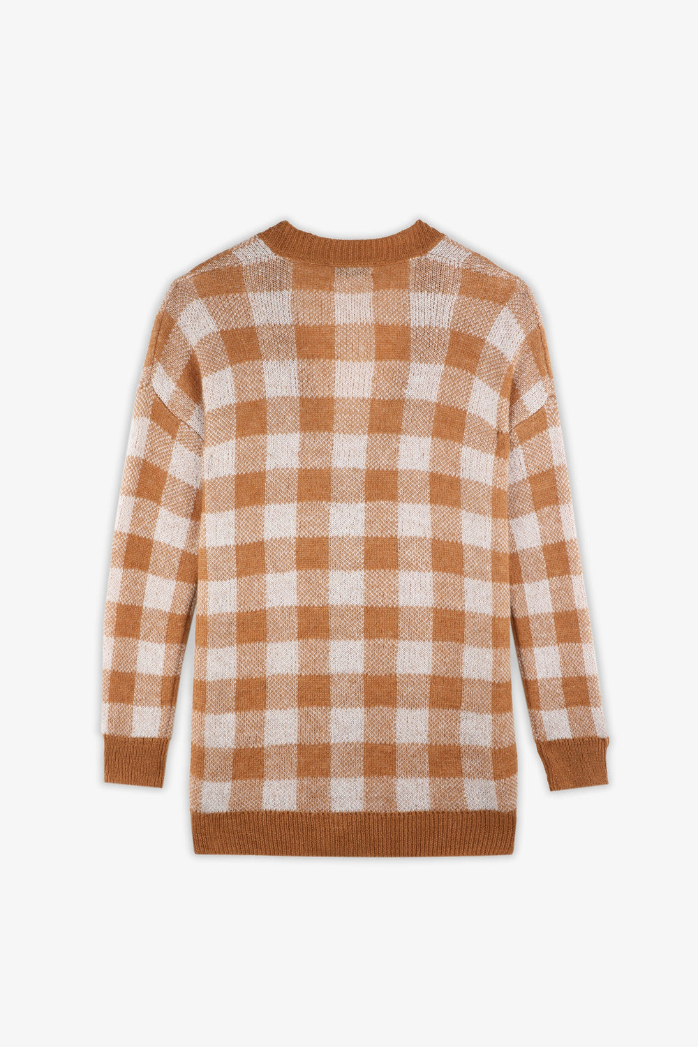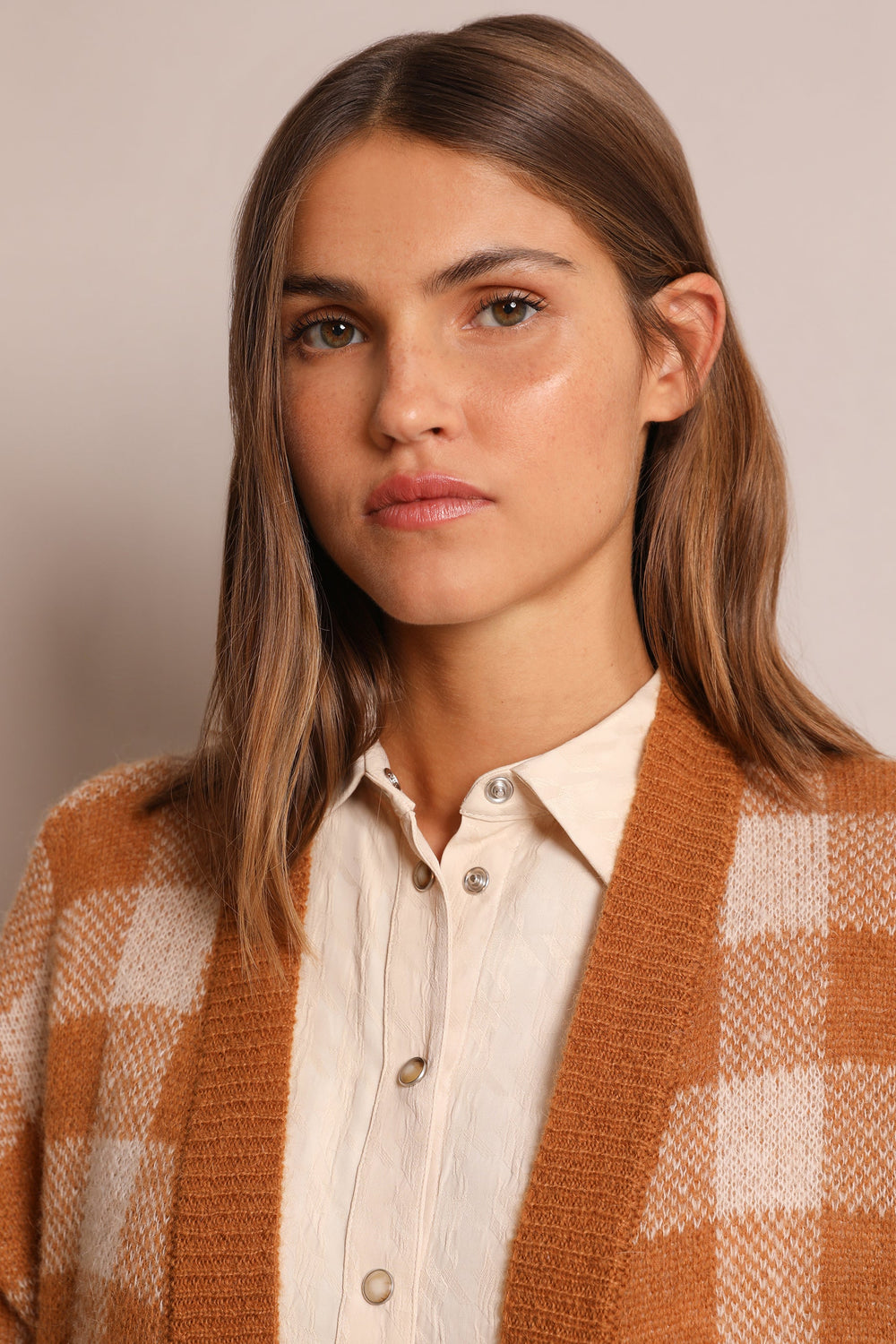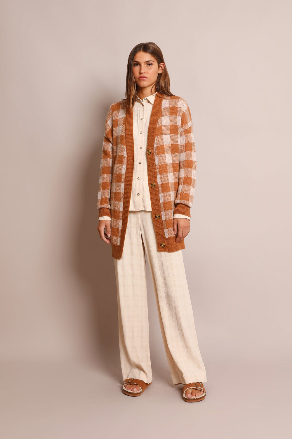 Cardigan de xadrez confecionado em mistura de lã e mohair. Corte Regular Fit, decote em V e fecho com botões. Manga comprida e aberturas laterais.