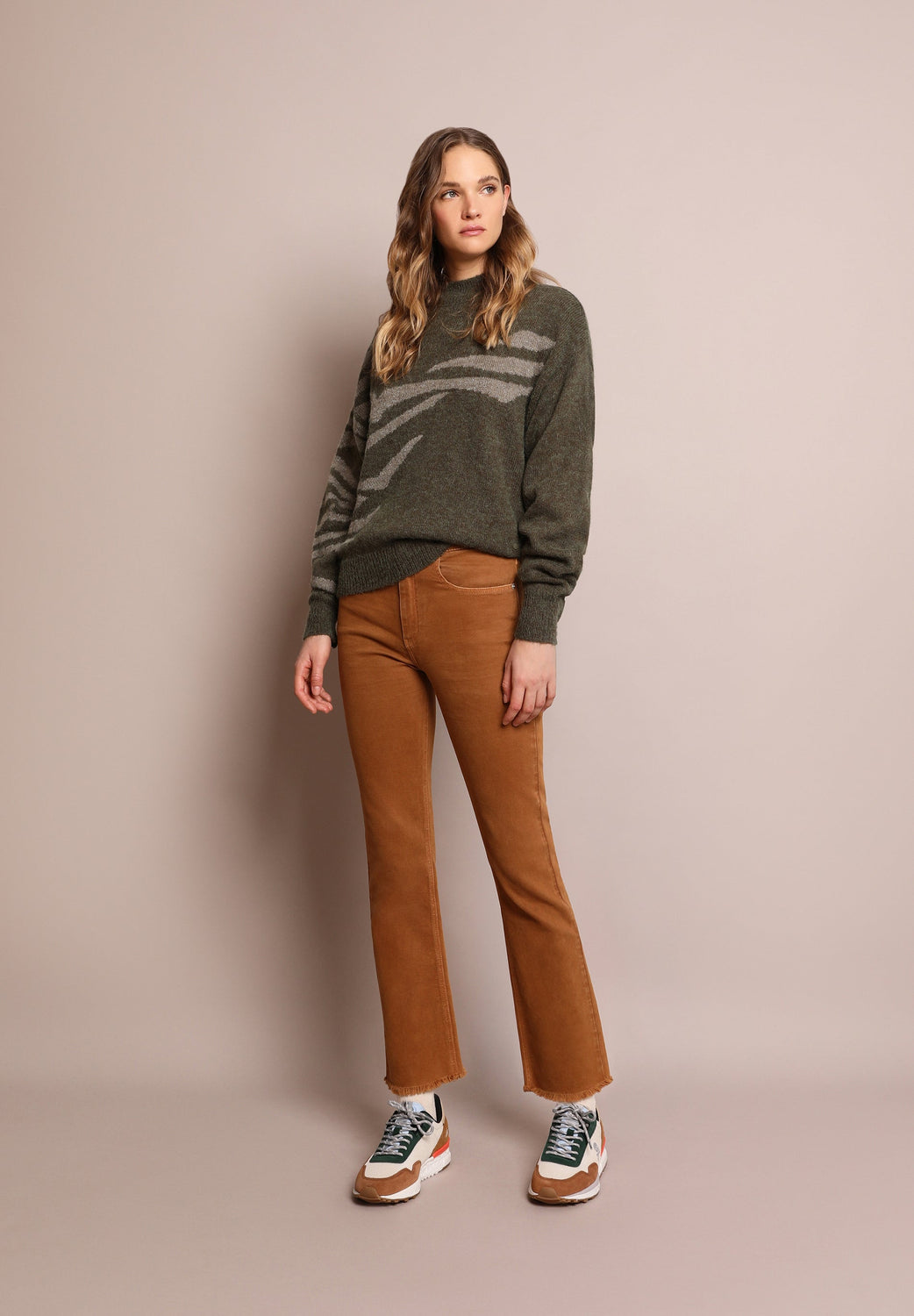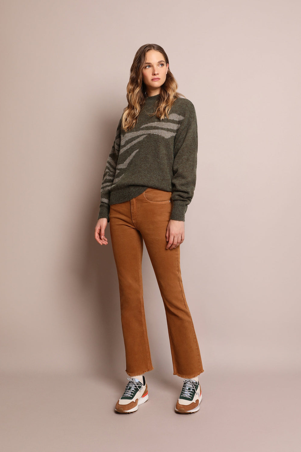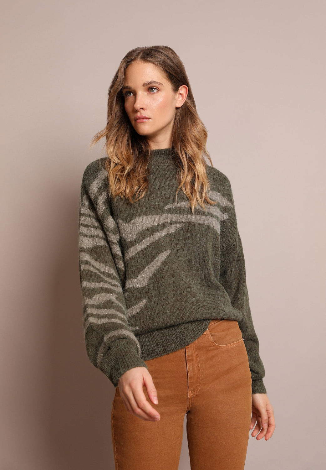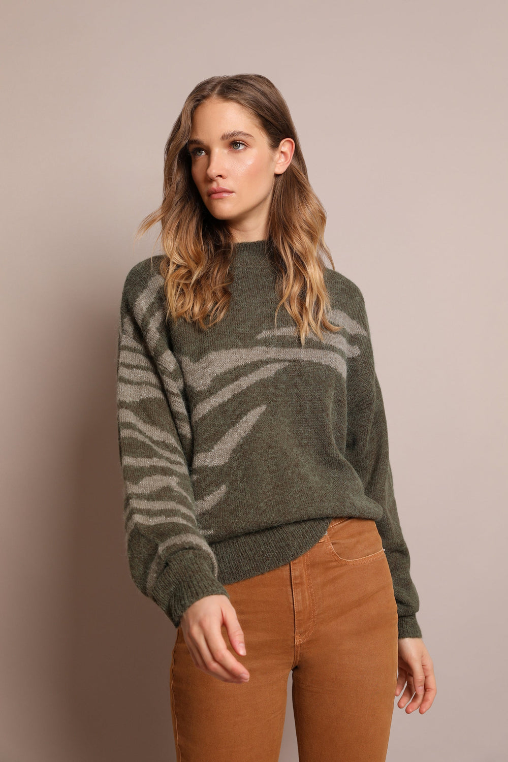 Sweater de malha com estampado fantasia animal confecionada em mistura de alpaca. Corte Regular Fit, gola ligeiramente subida e manga comprida.