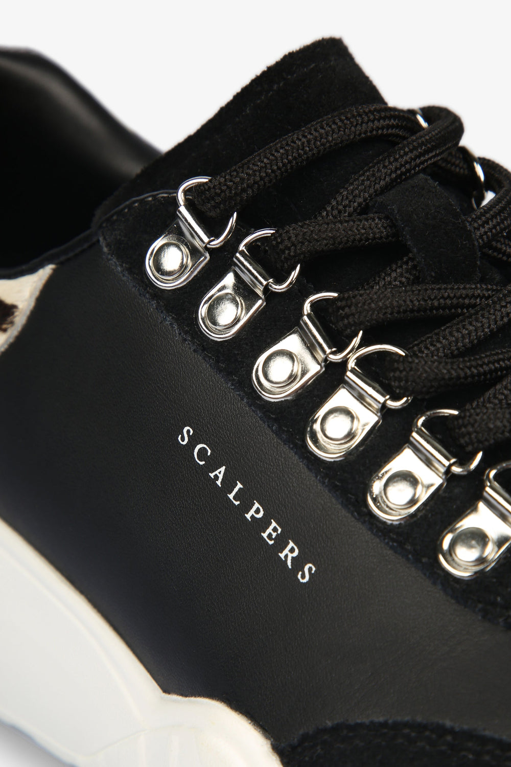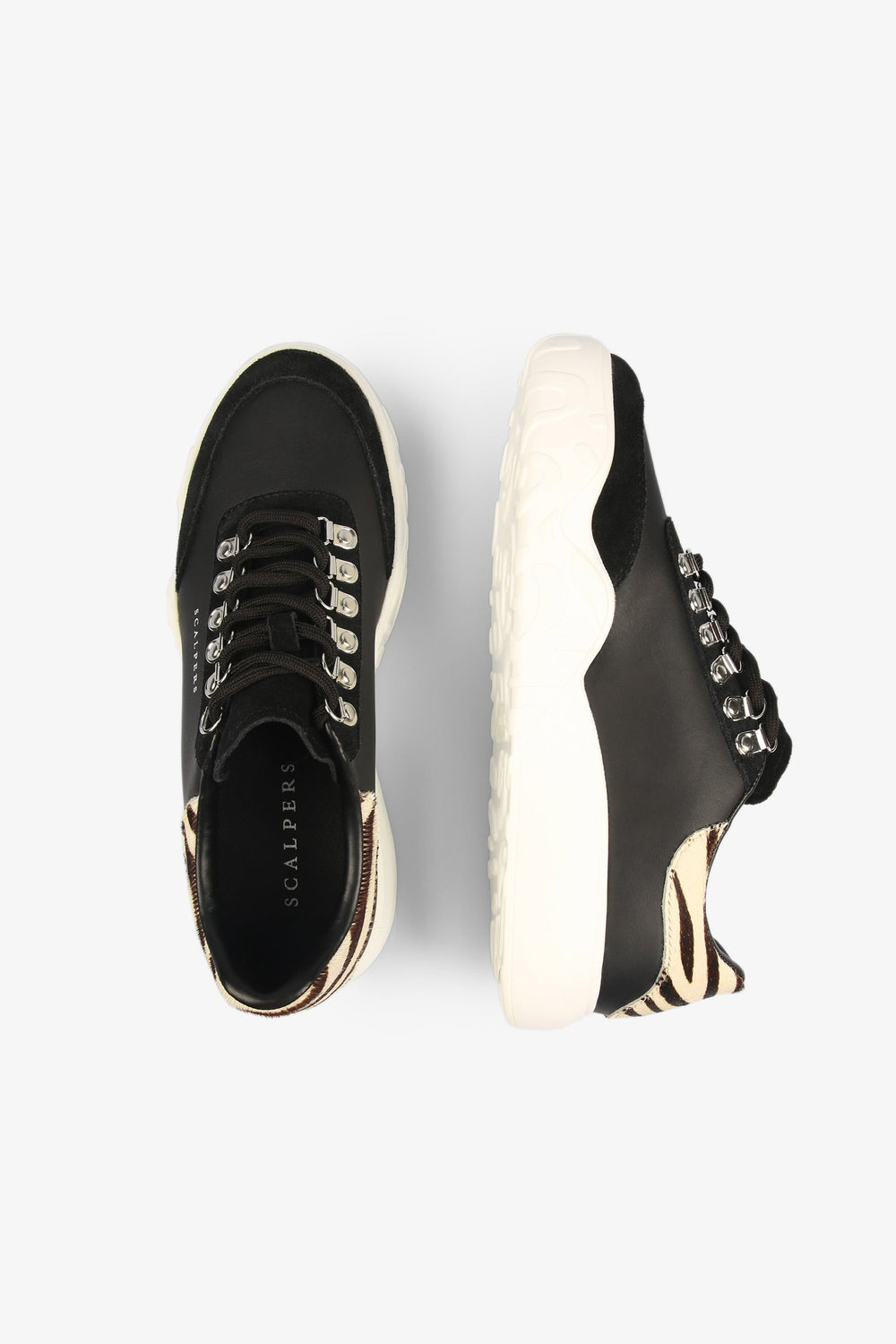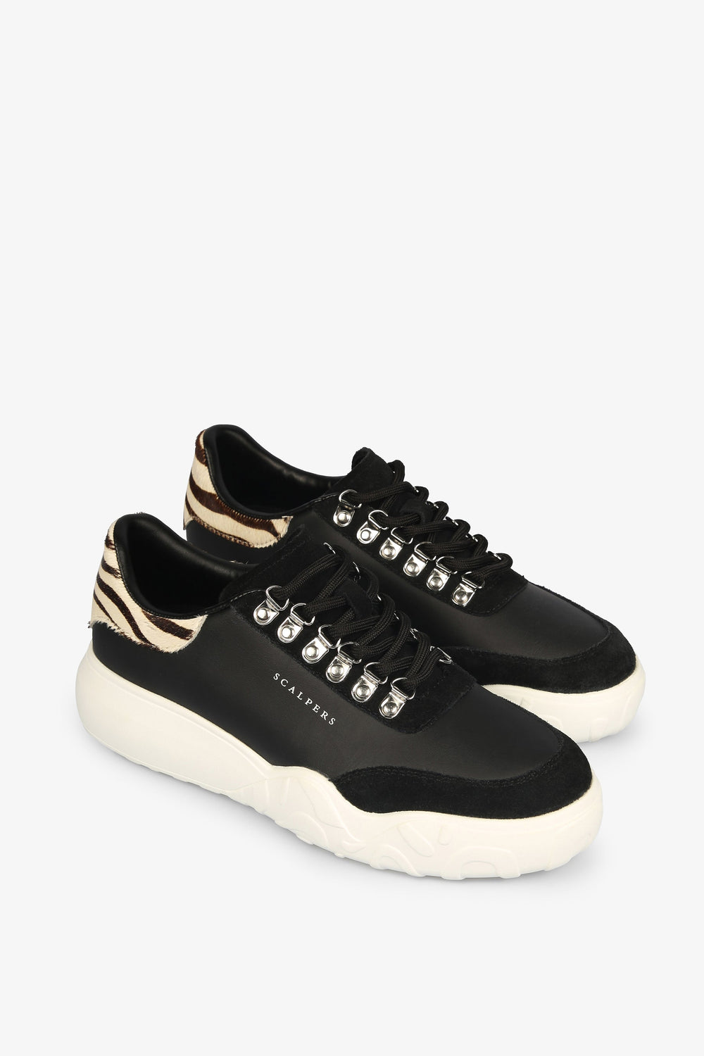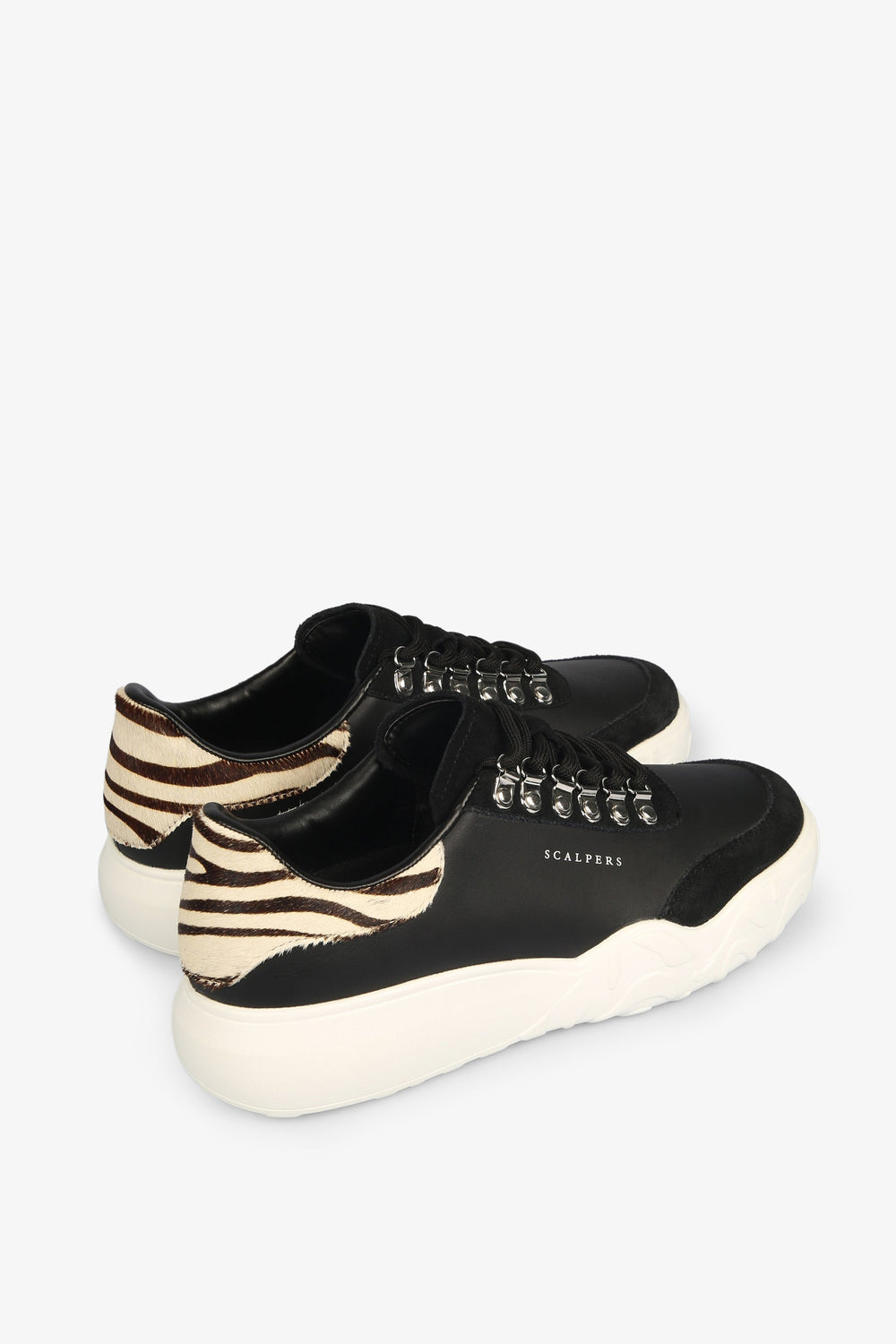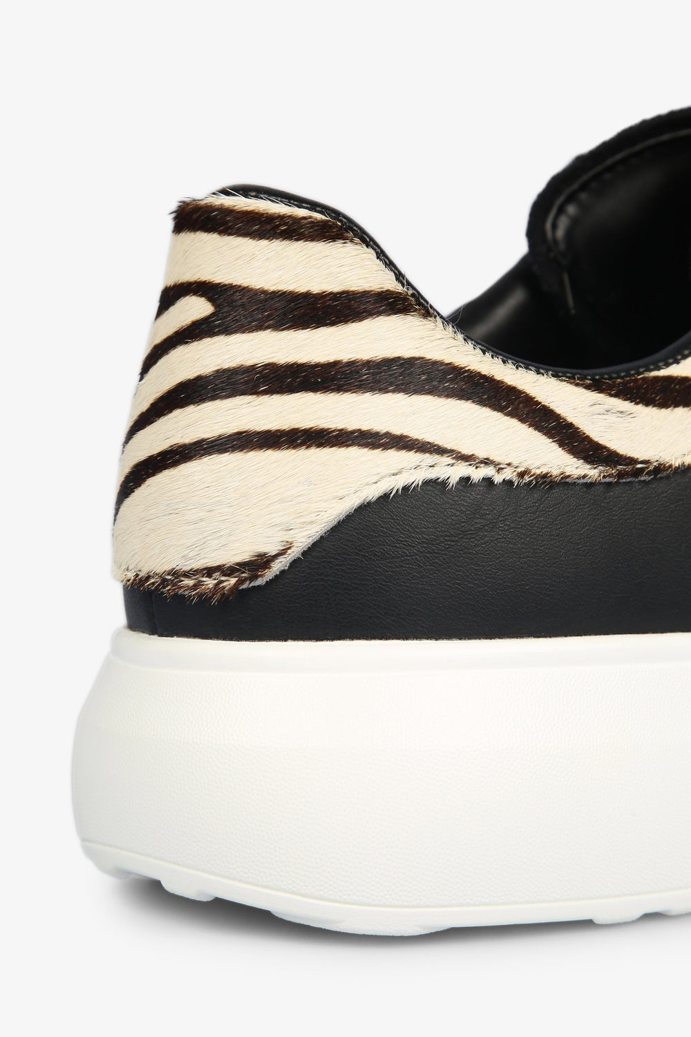 Sapatilhas com pormenores de zebra no calcanhar confecionadas em pele. Fecho com cordões tipo bota, sola a contrastar especial e pormenores de camurça. Altura do tacão: 3 cm.