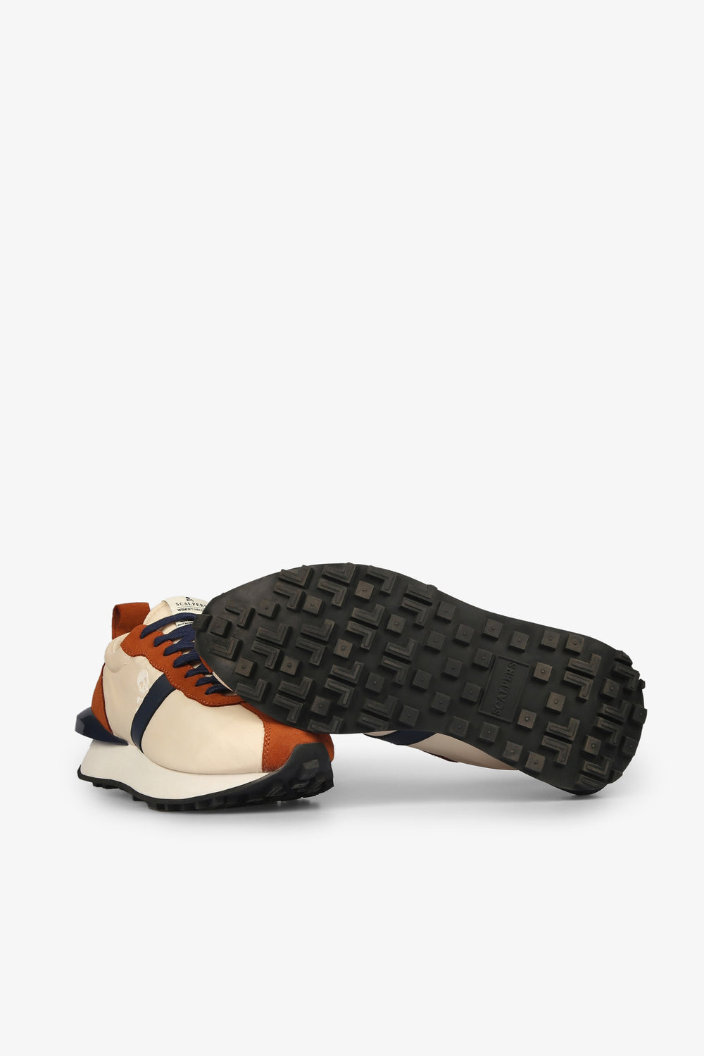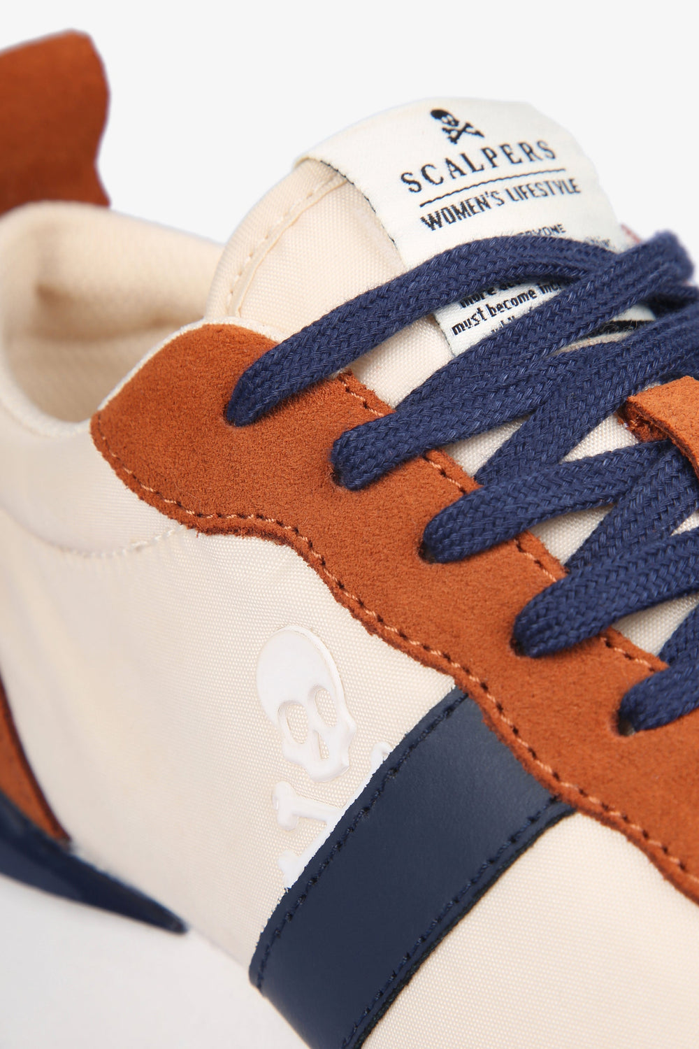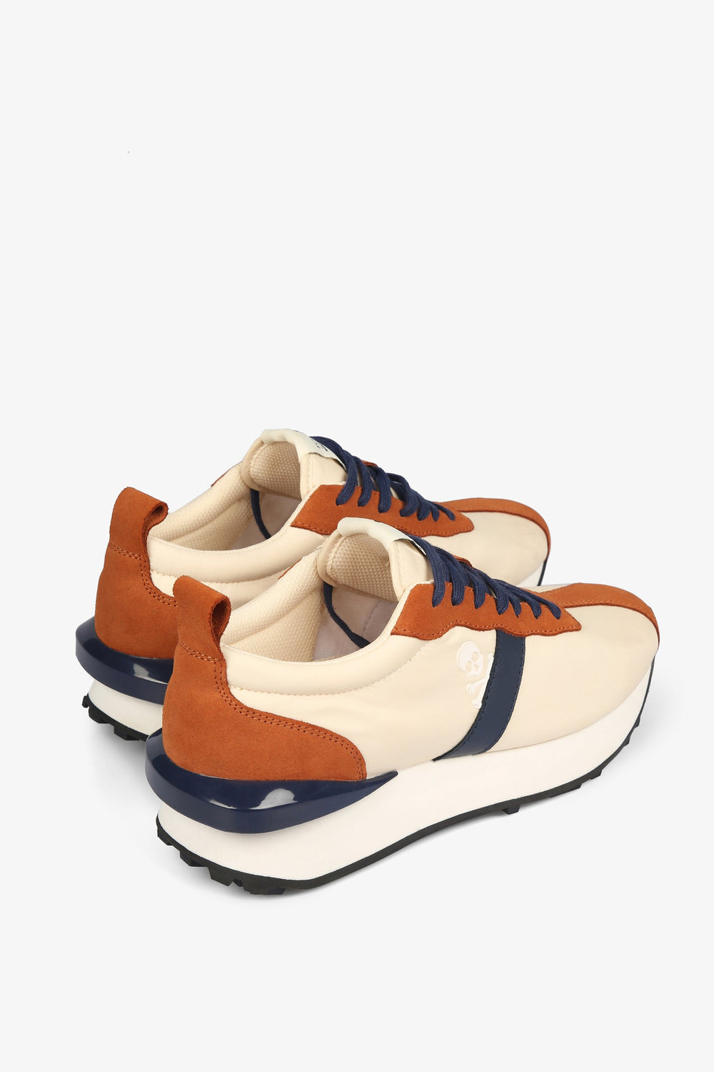 Sapatilhas multicolores confecionadas em pele com acabamento em croute. Fecho com cordões, puxador traseiro e língua com etiqueta. Sola de cauchu e pormenor de estabilizador pronunciado atrás.