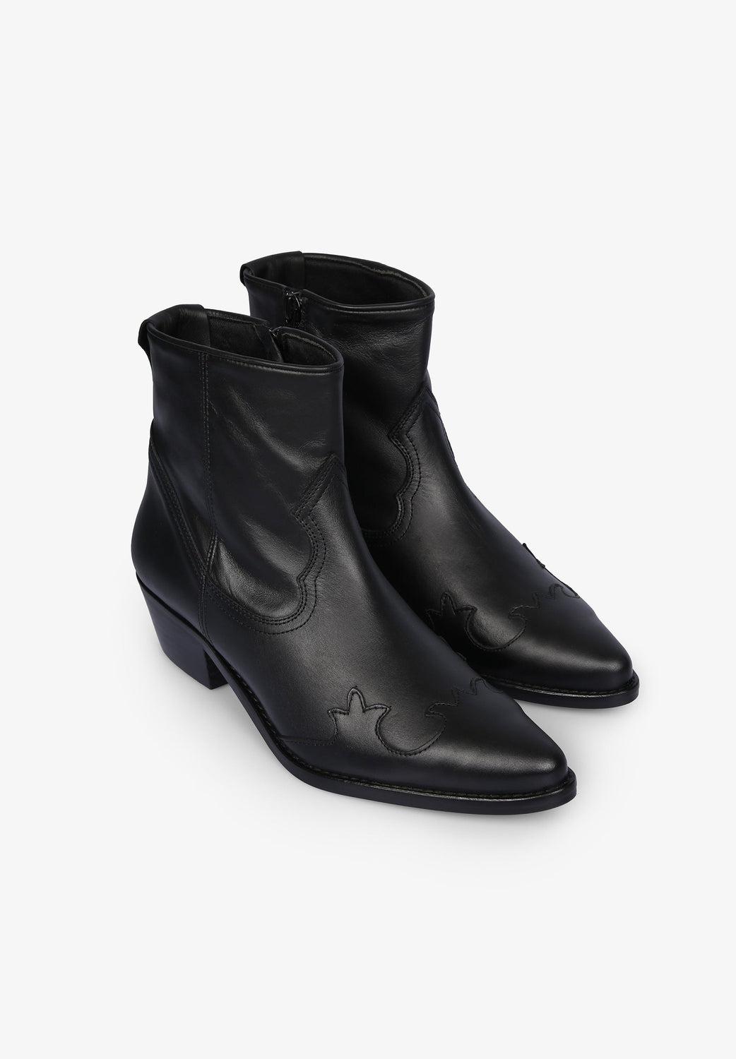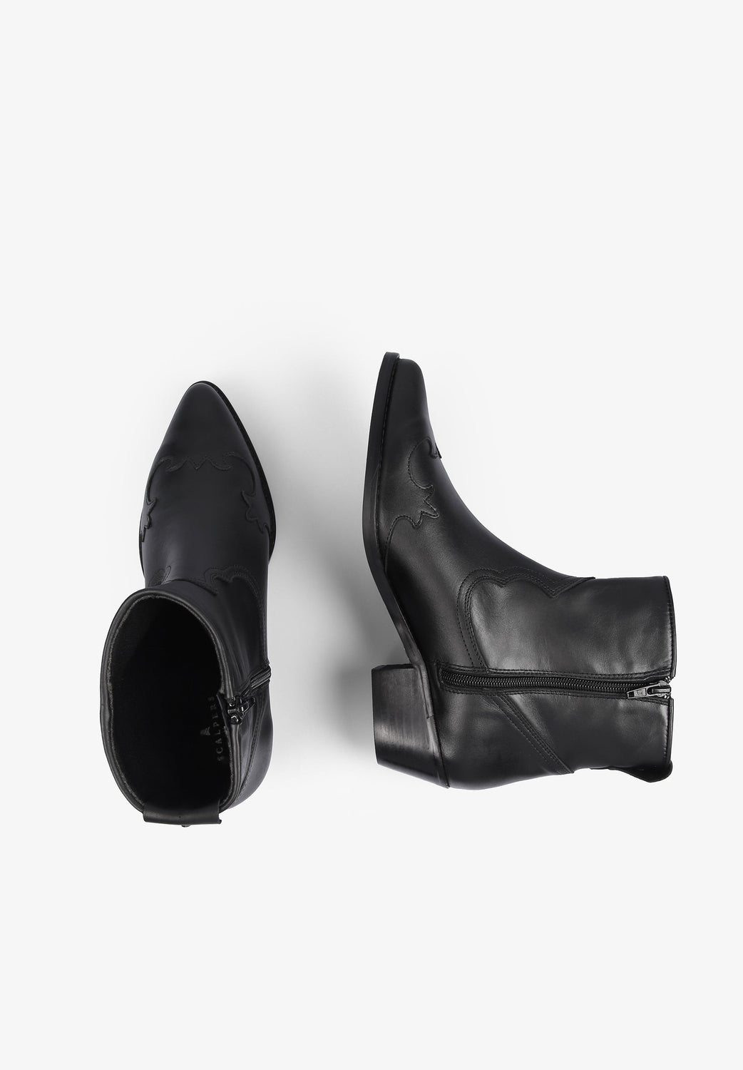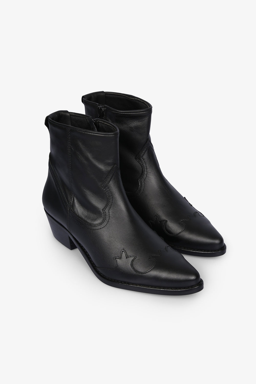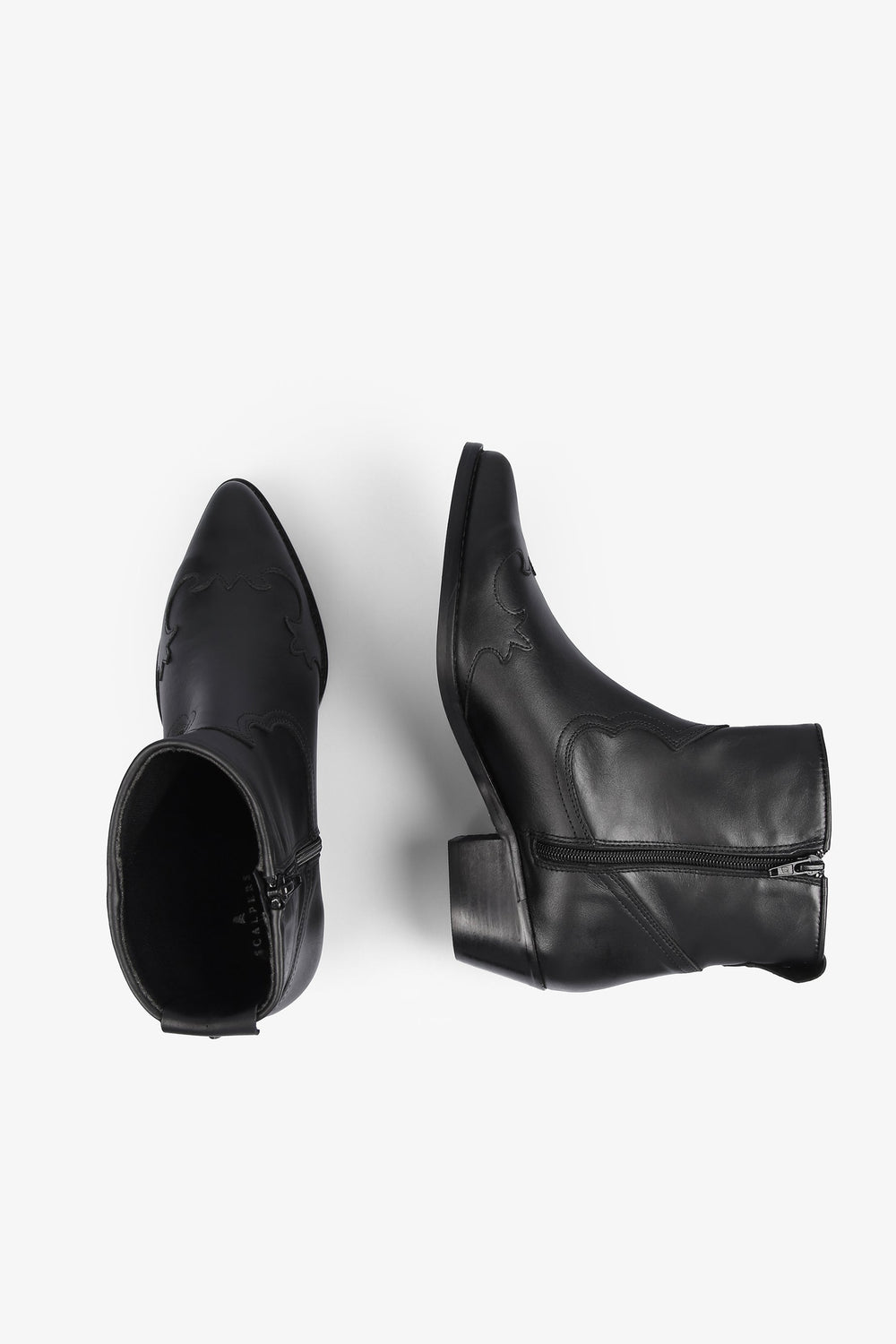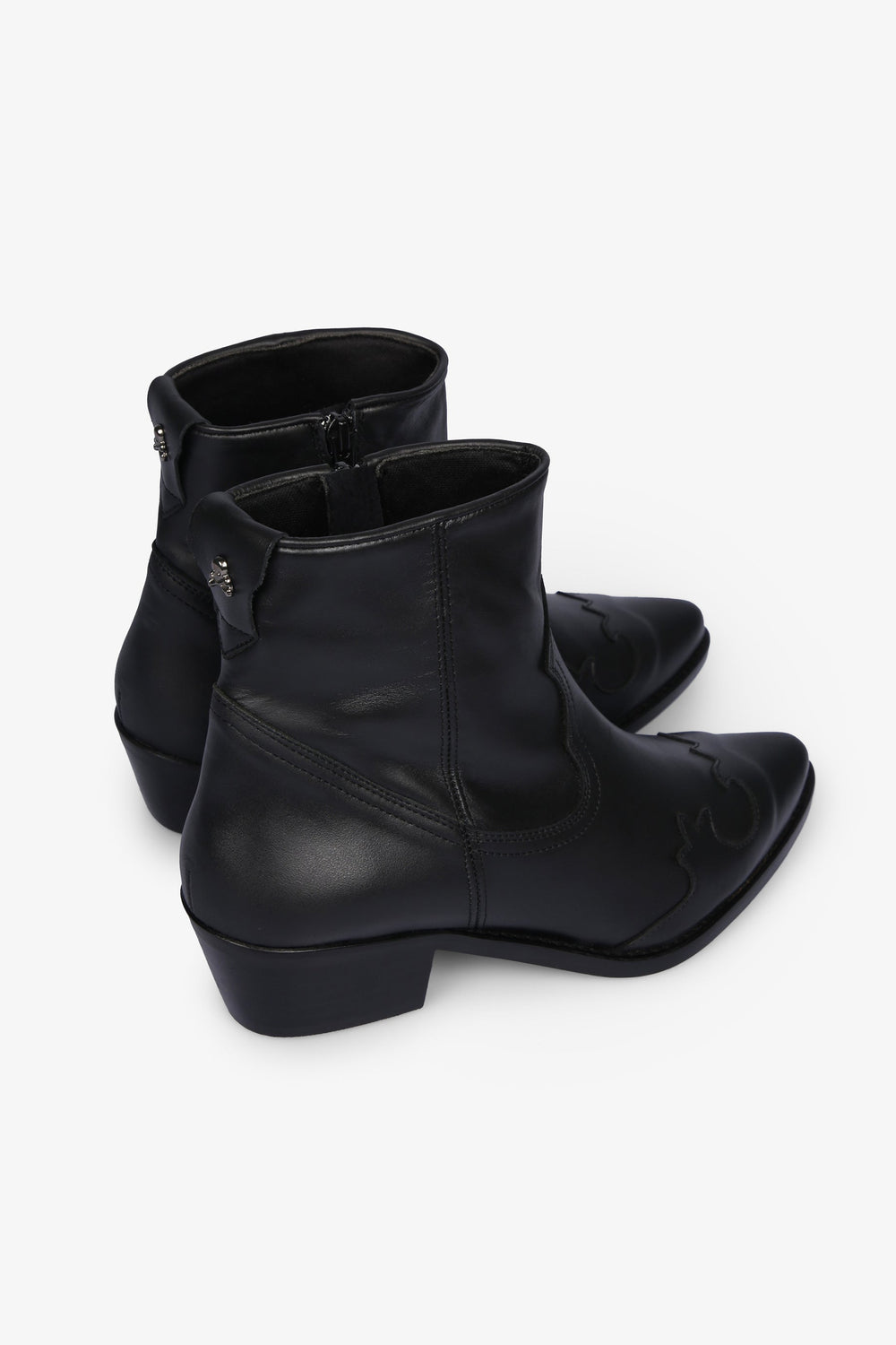 Botim cowboy, confecionado 100% em pele de bovino, fecho com zip na parte interna, bicudo e com pormenores de pespontos e tachas.