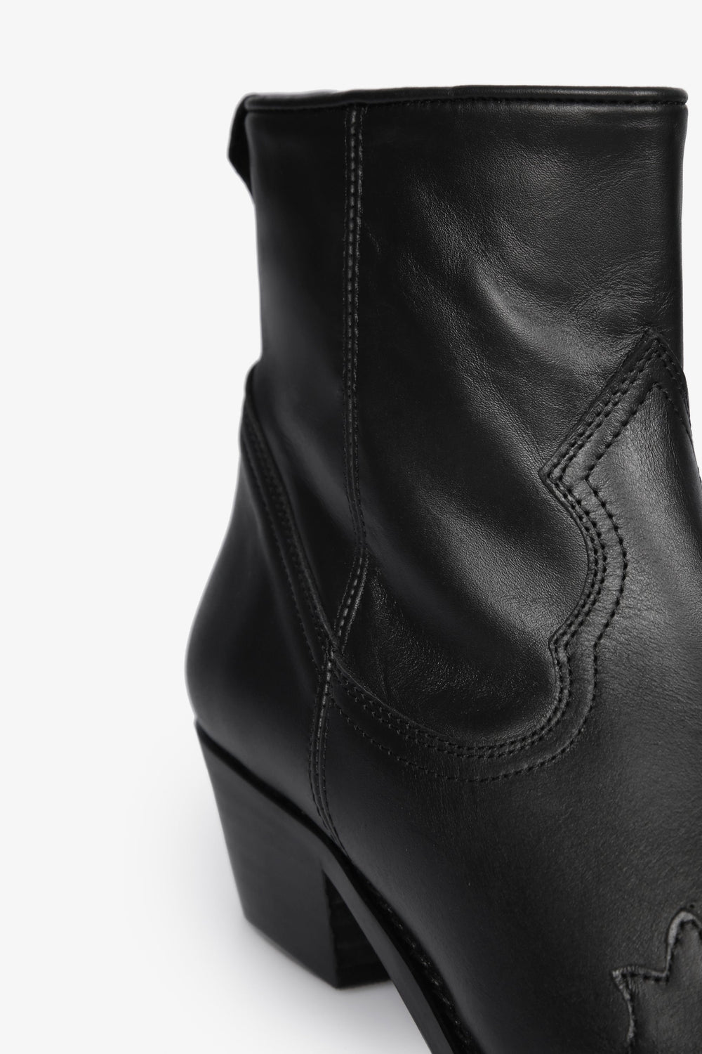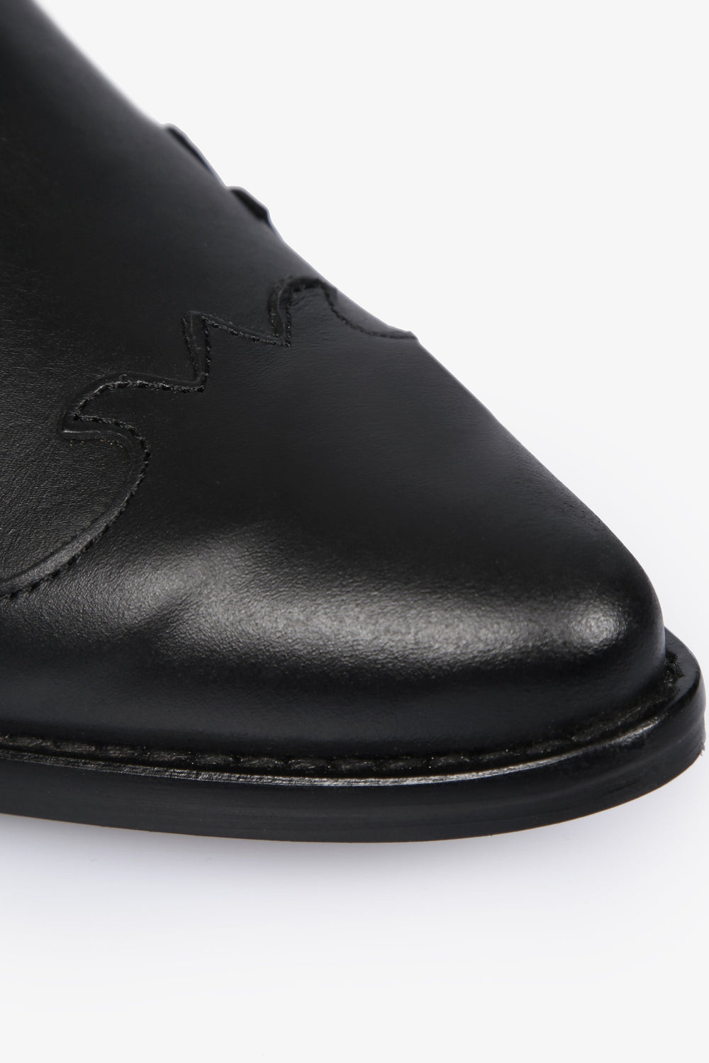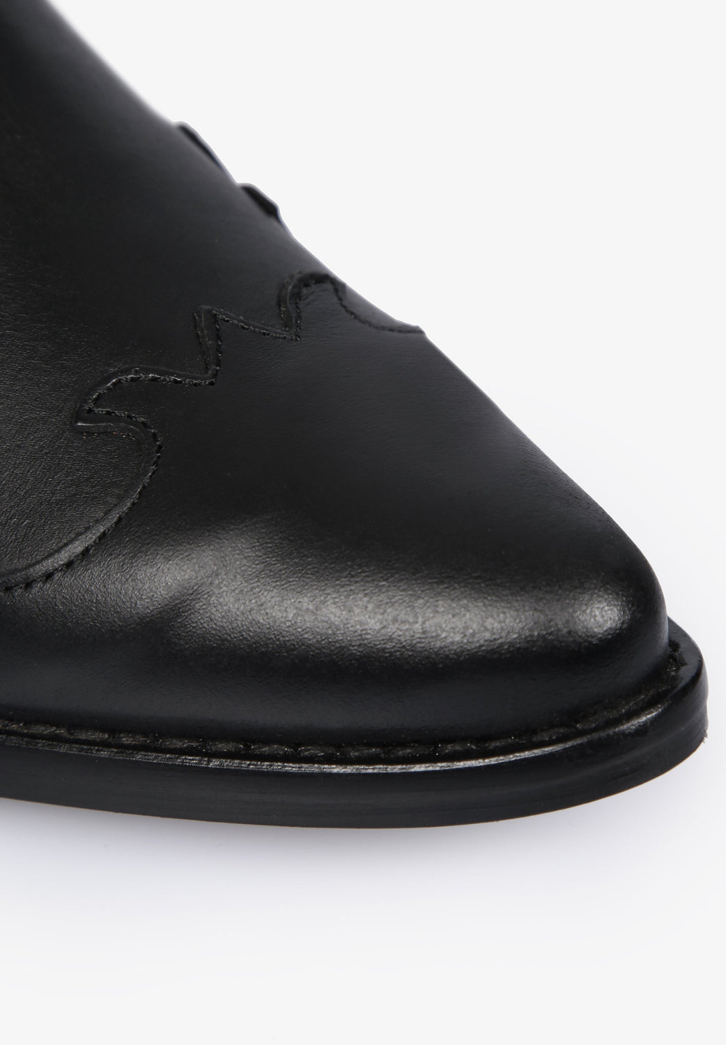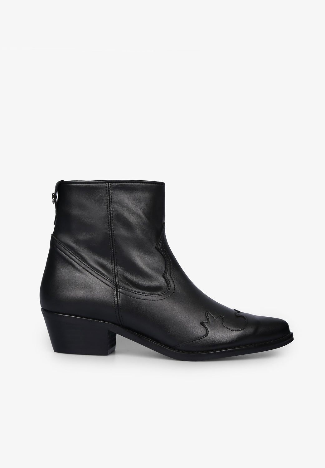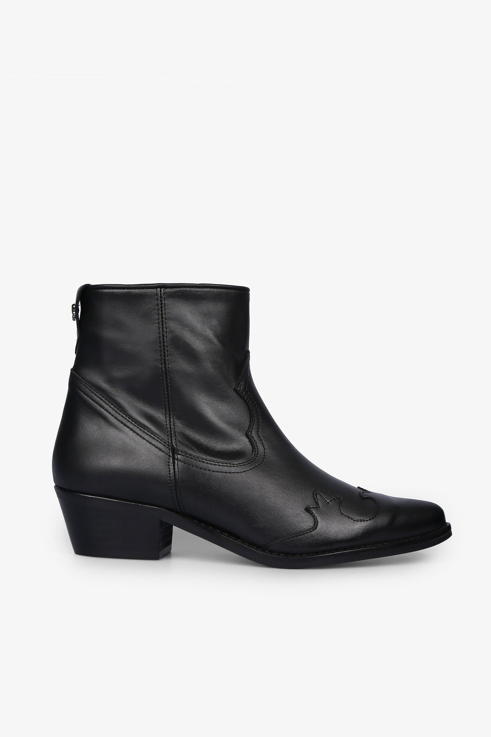 Botim cowboy, confecionado 100% em pele de bovino, fecho com zip na parte interna, bicudo e com pormenores de pespontos e tachas.