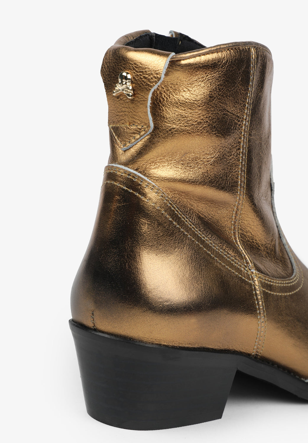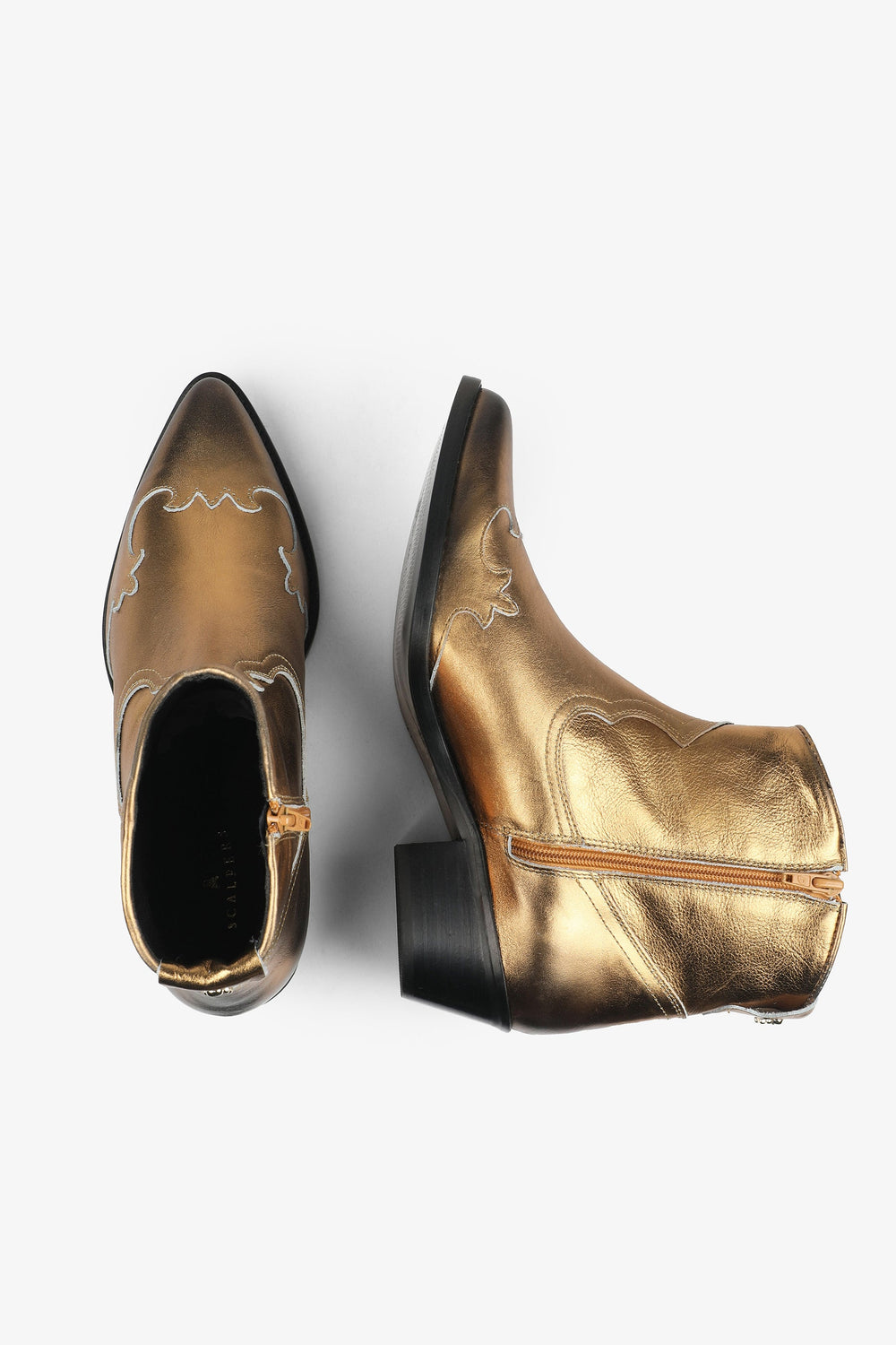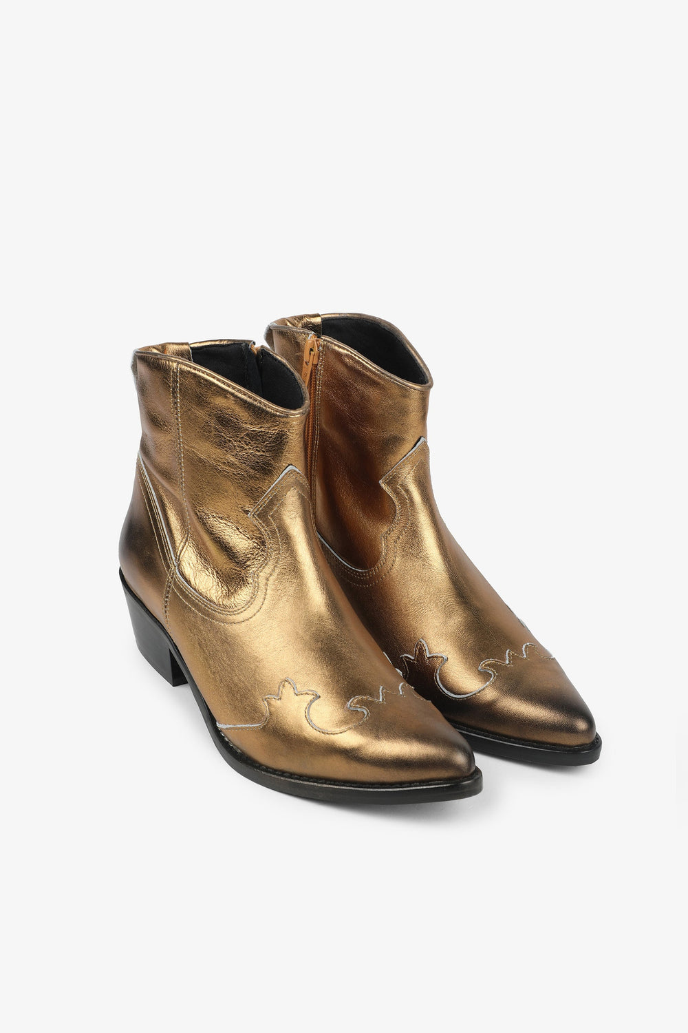 Botim cowboy, confecionado 100% em pele de bovino, fecho com zip na parte interna, bicudo e com pormenores de pespontos.