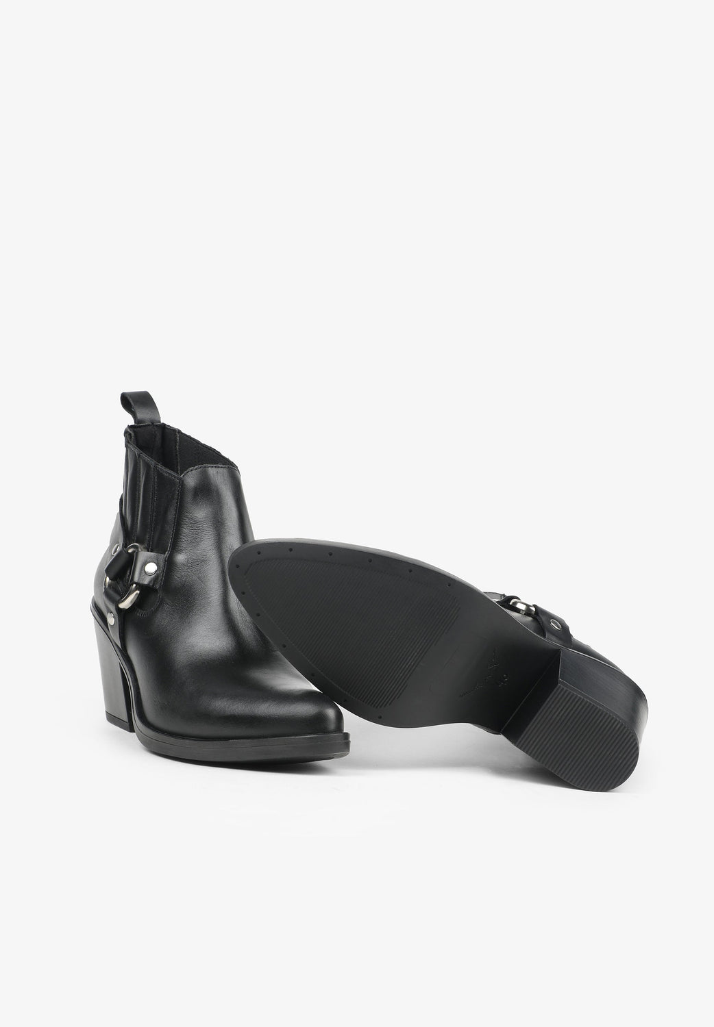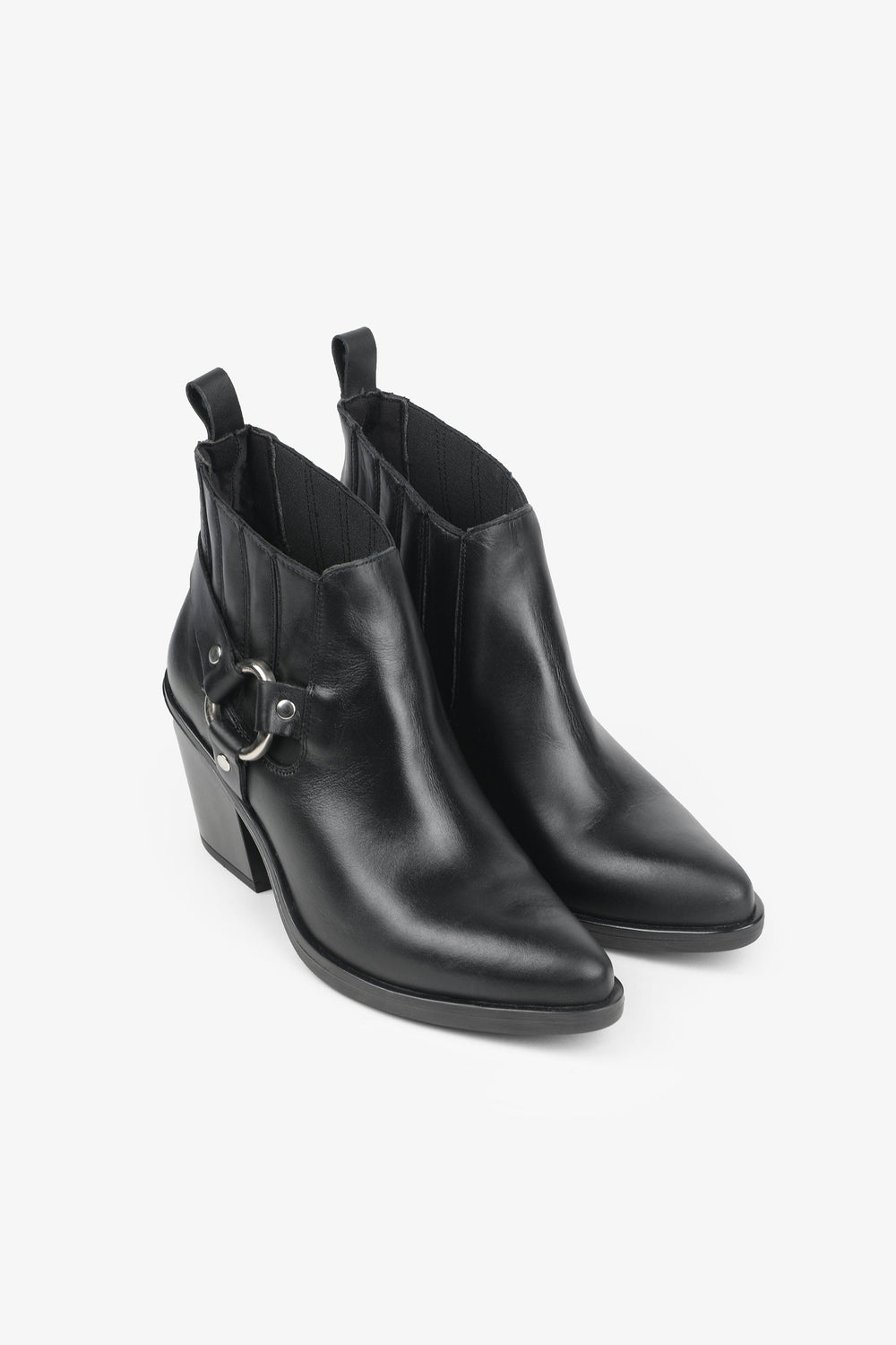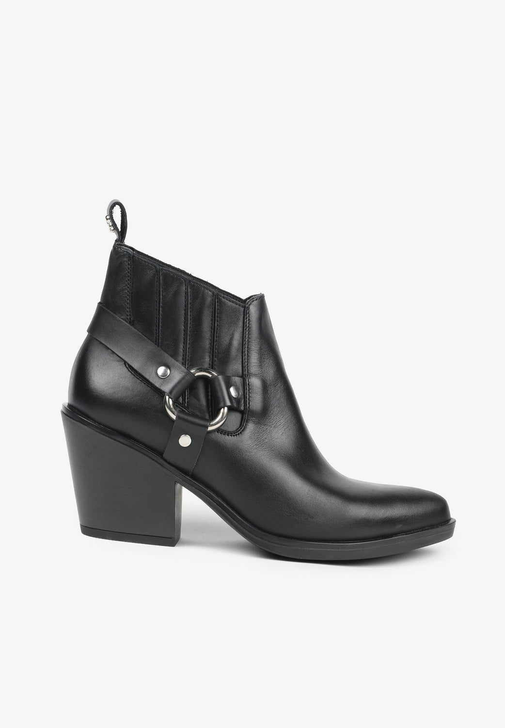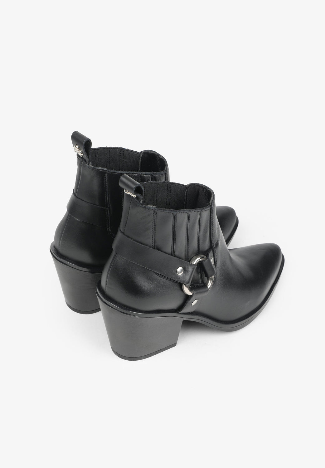 Botim com aro de metal. Confecionado em 100% pele, fecho elástico, acabado em biqueira arredondada e aro de metal lateral. Altura do tacão: 8 cm/Altura do cano: 10,5 cm