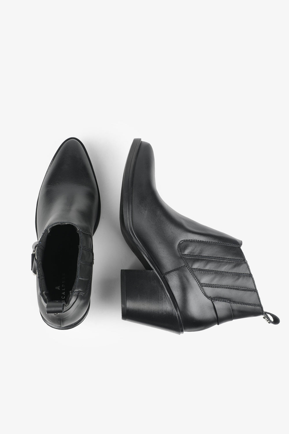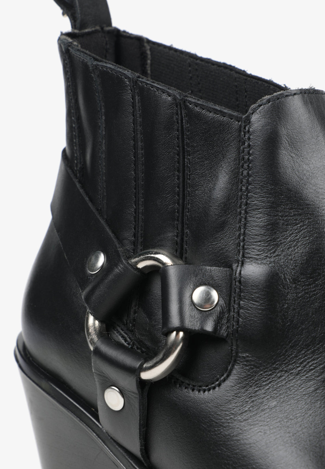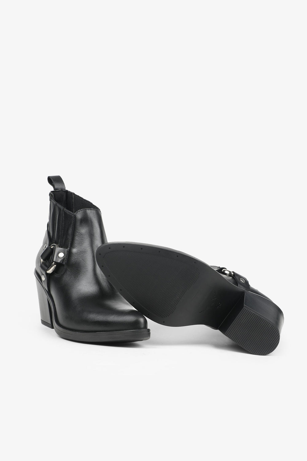 Botim com aro de metal. Confecionado em 100% pele, fecho elástico, acabado em biqueira arredondada e aro de metal lateral. Altura do tacão: 8 cm/Altura do cano: 10,5 cm
