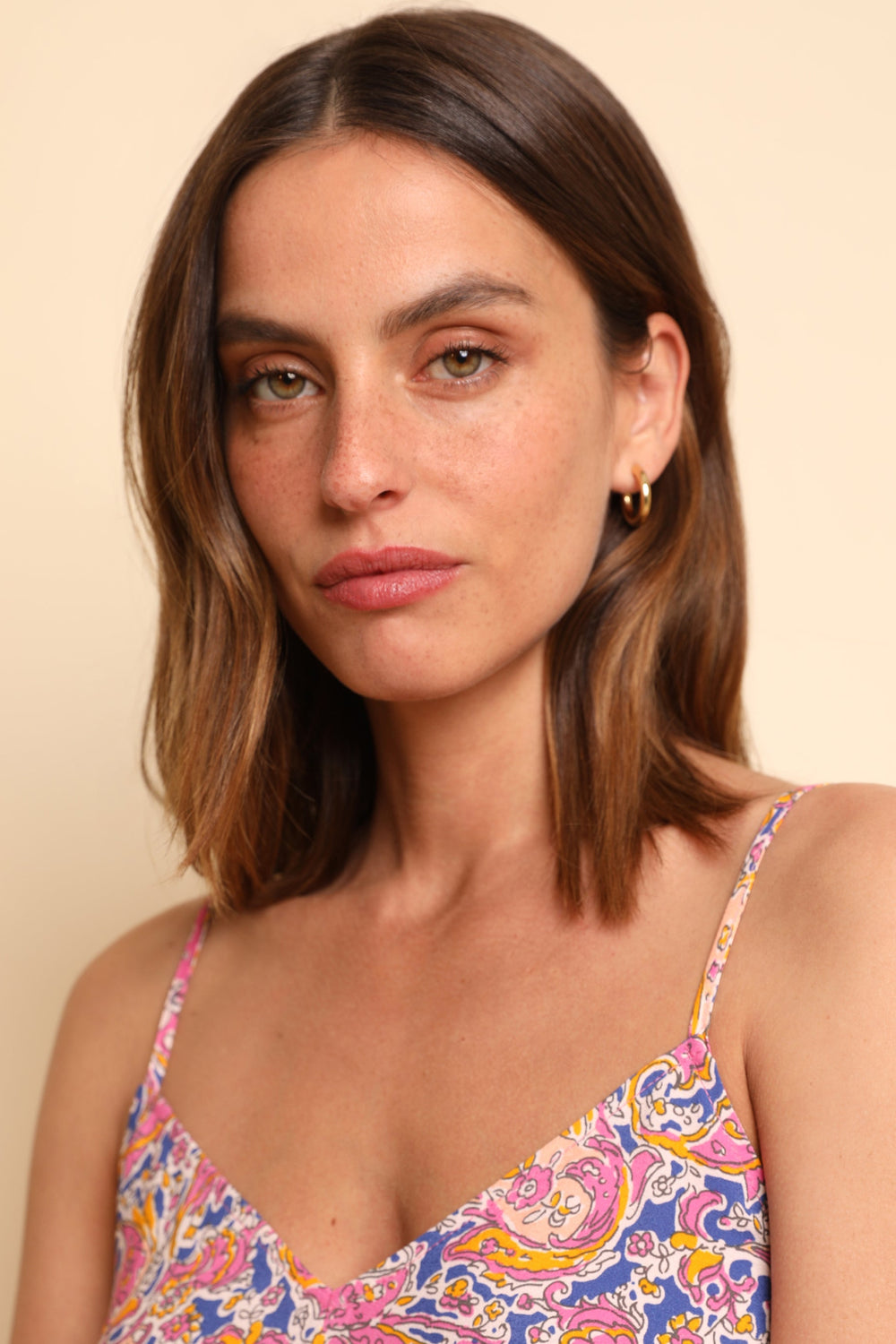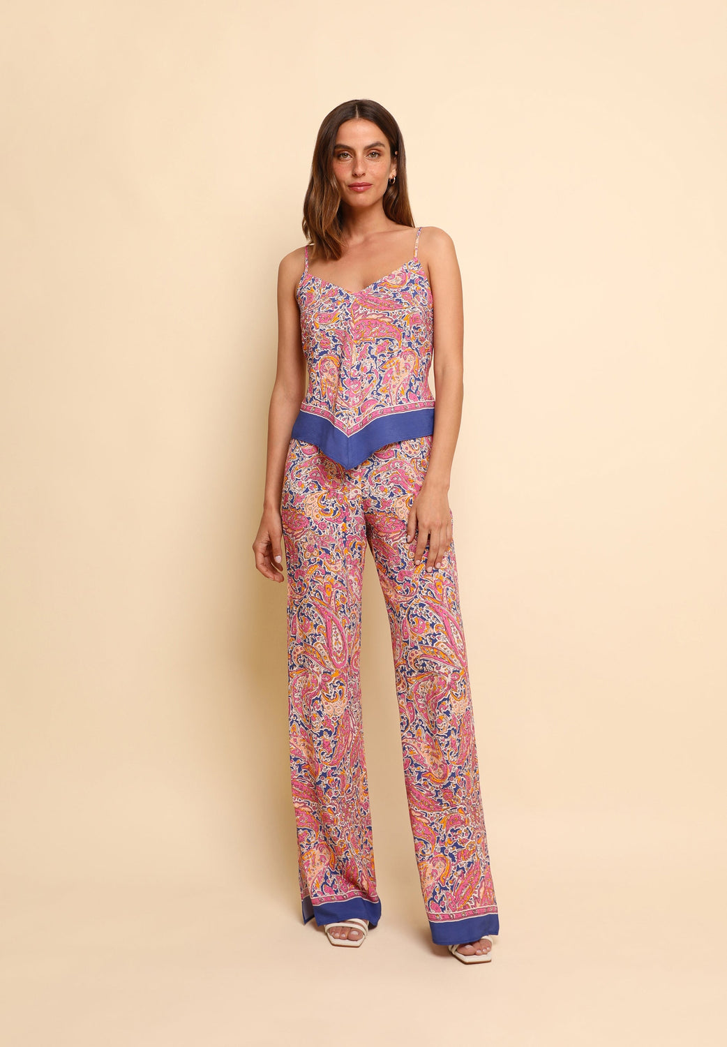 Top com padrão. Confecionado em tecido fluido. Corte Slim Fit. Decote em V. Laço nas costas.