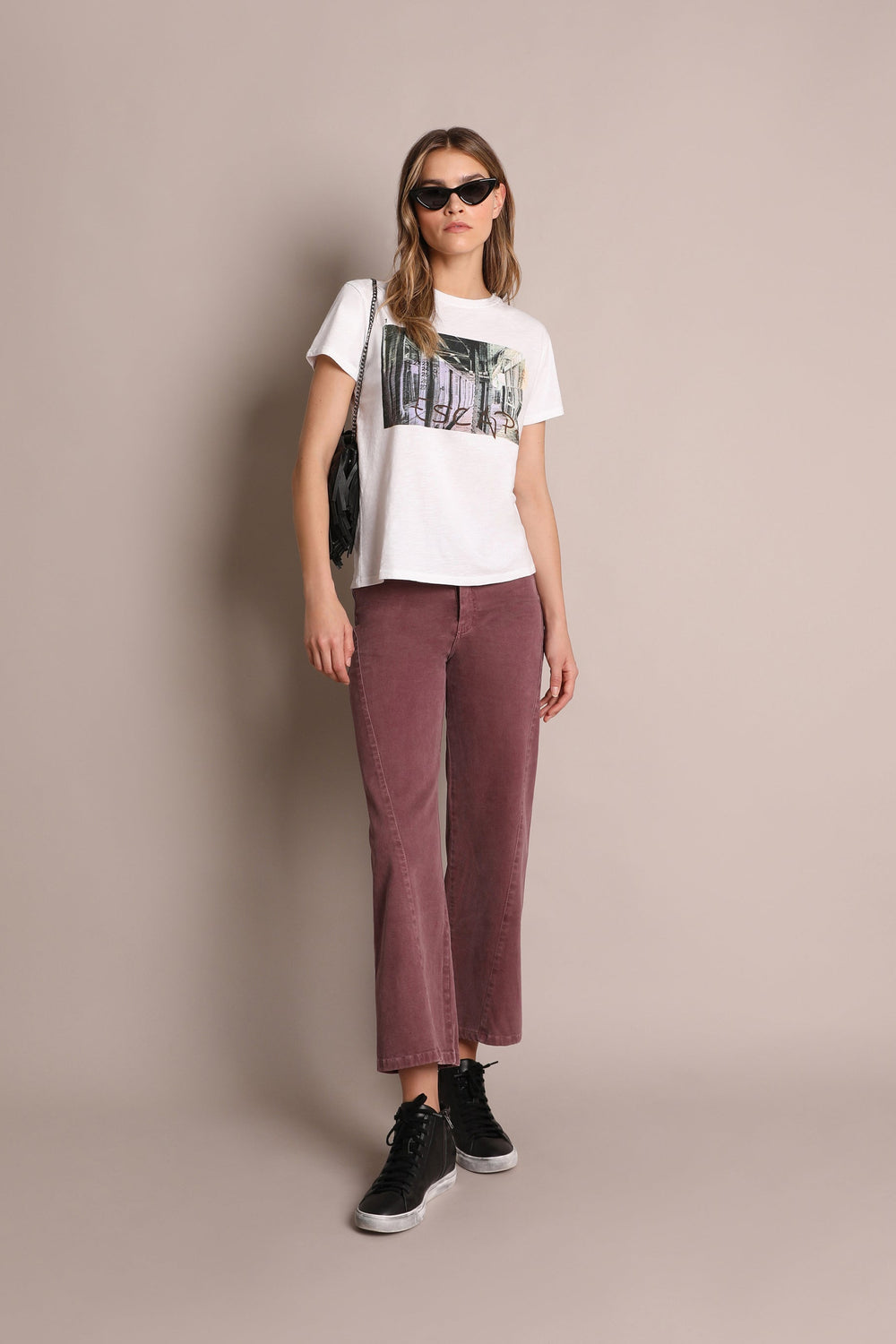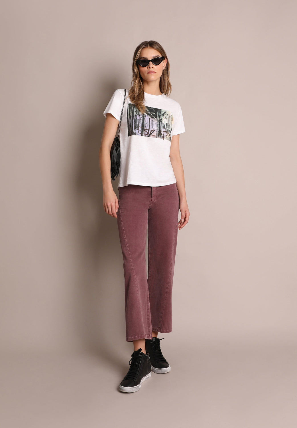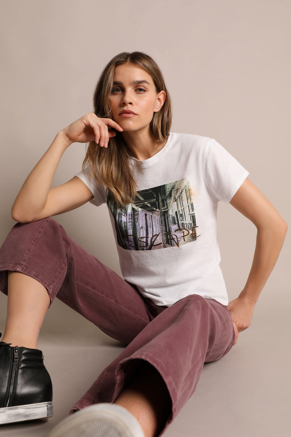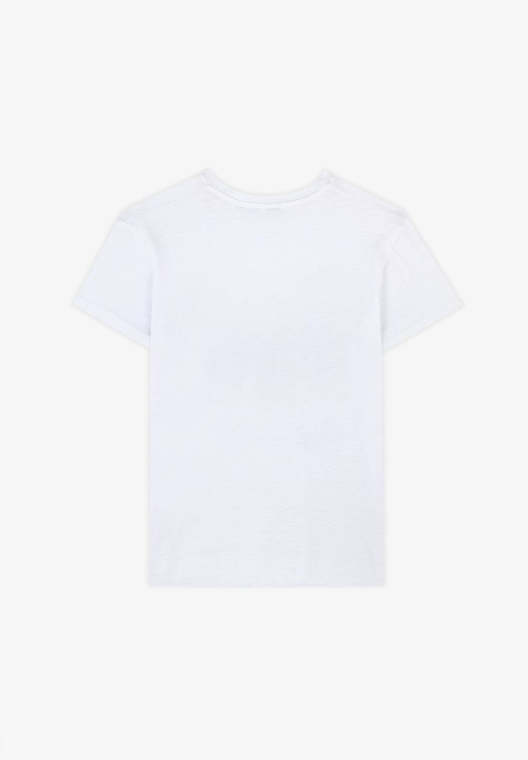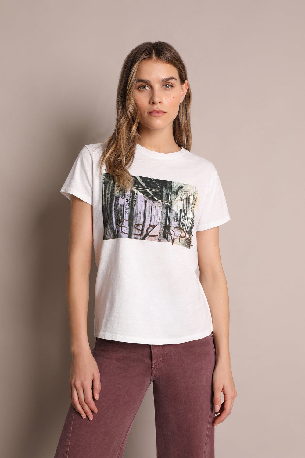 T-shirt com padrão de foto à frente. Confecionada em 100% algodão orgânico, corte Regular Fit, decote redondo e manga curta.