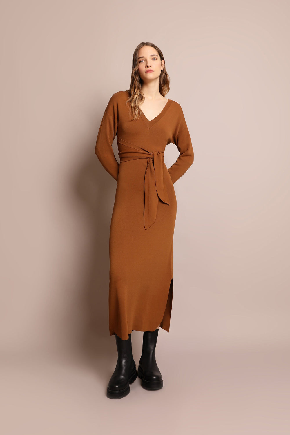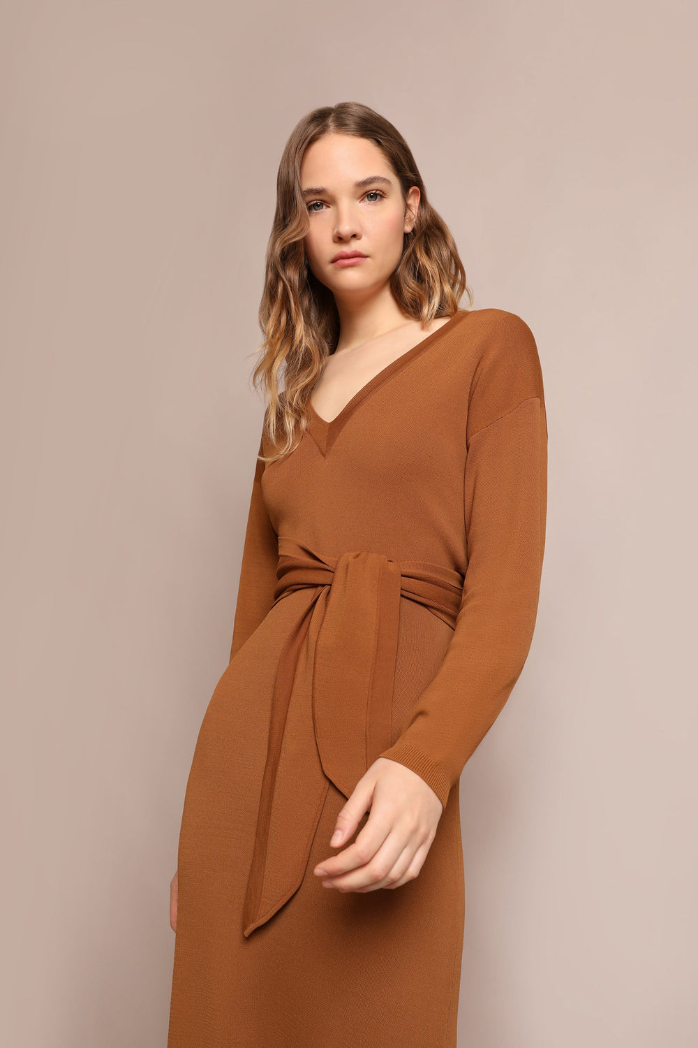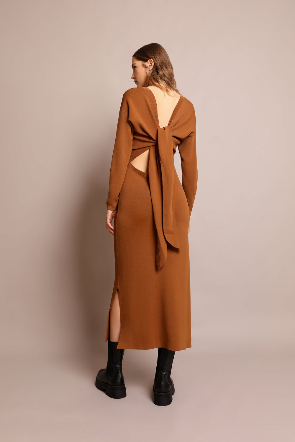 Vestido com multiposição confecionado em malha. Corte Slim Fit, decote em bico e manga comprida. Laçada traseira.