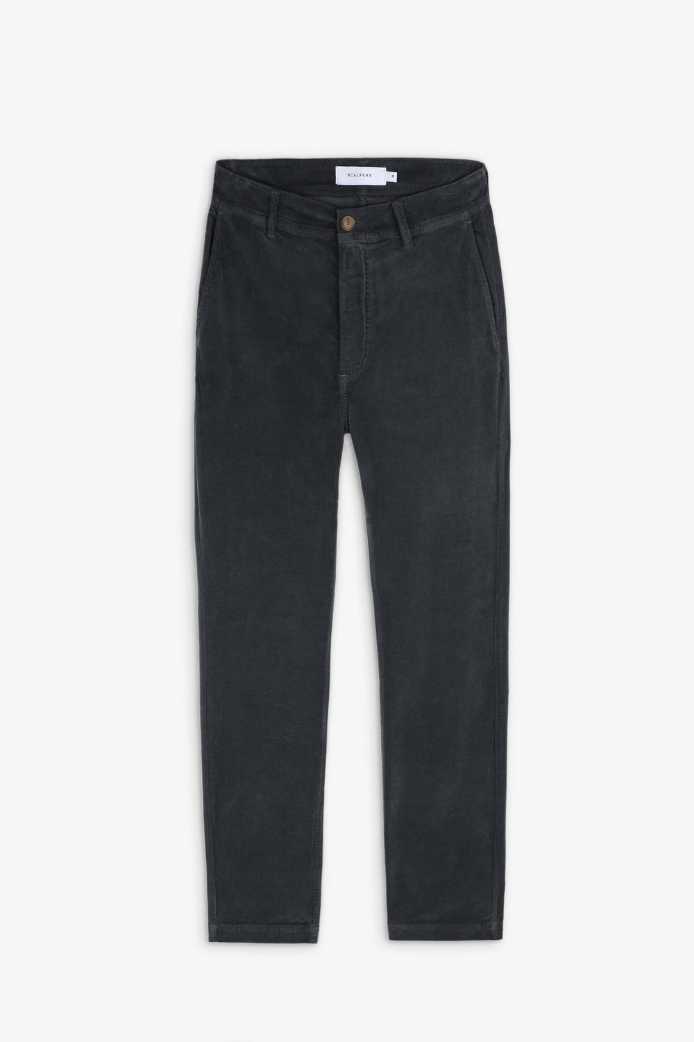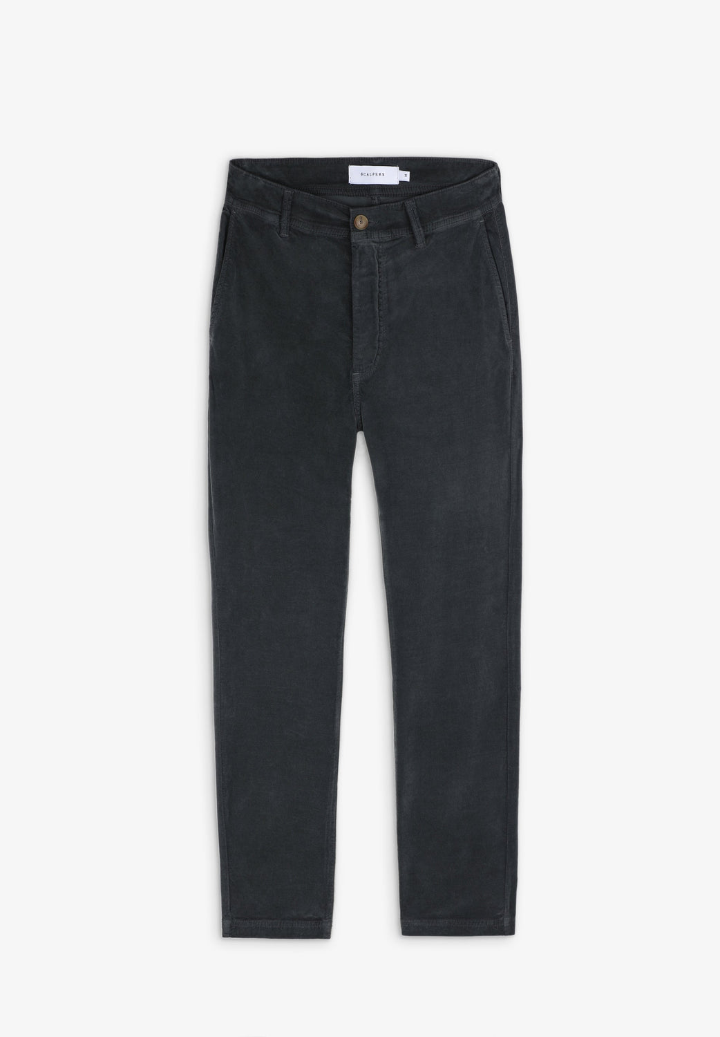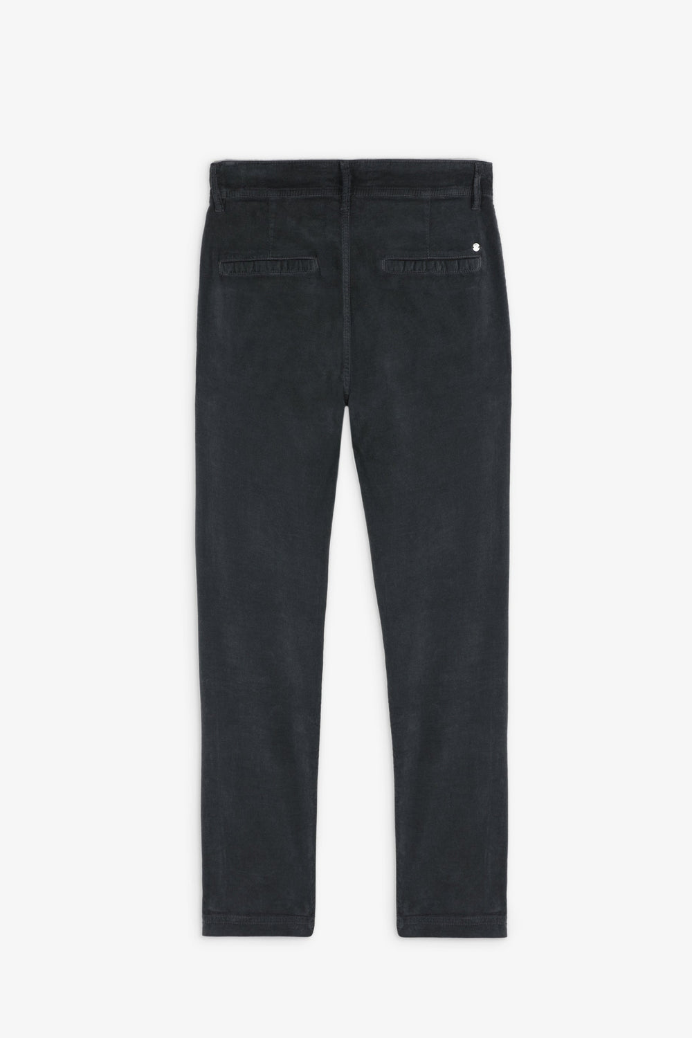 Calças chino tipo bombazina. Confecionadas em mistura de algodão ligeiramente elástico, fecho com zip e botão, bolsos laterais e traseiros e presilhas para o cinto