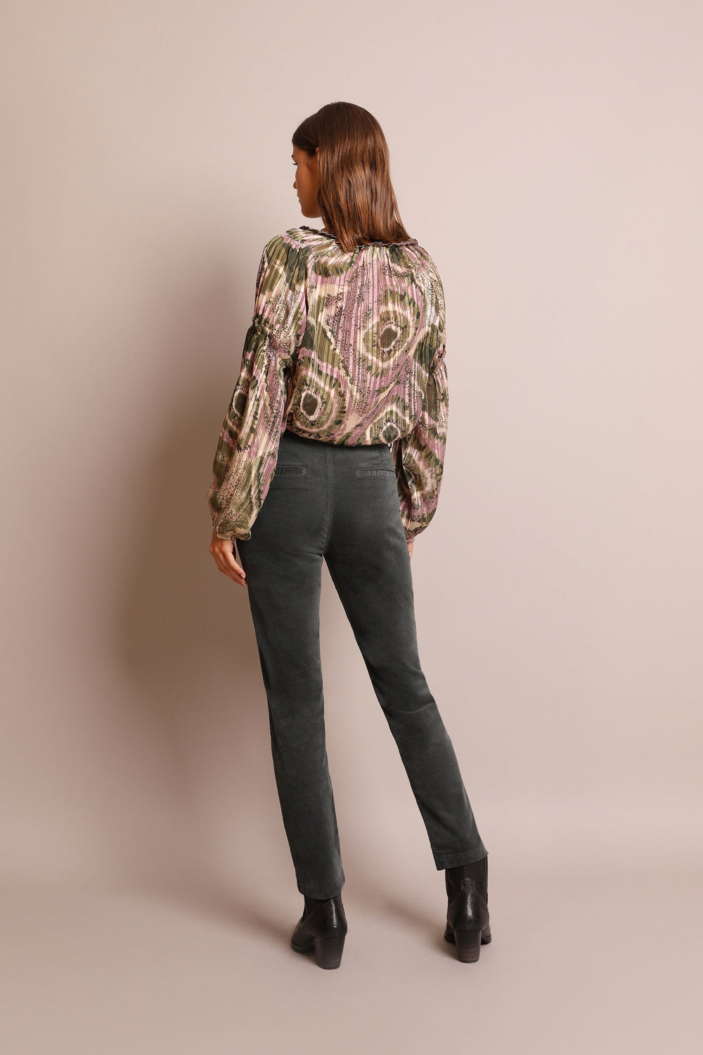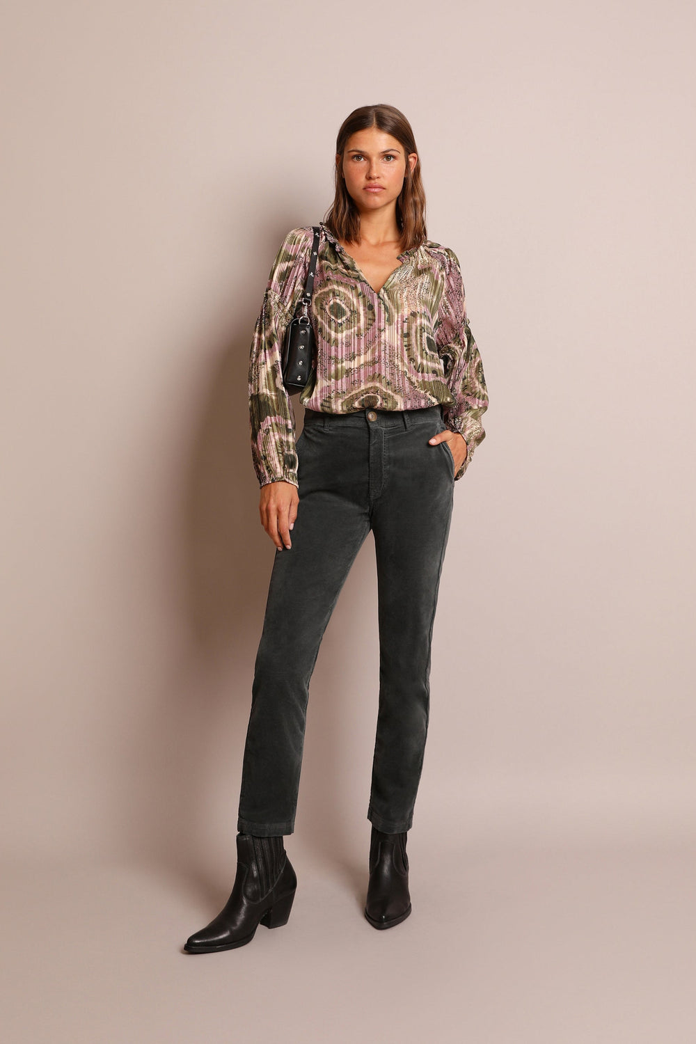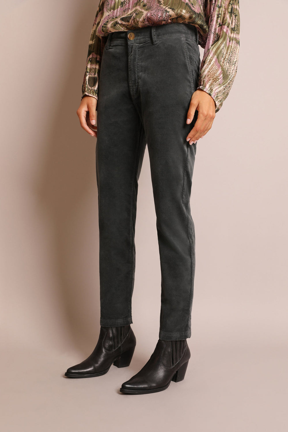 Calças chino tipo bombazina. Confecionadas em mistura de algodão ligeiramente elástico, fecho com zip e botão, bolsos laterais e traseiros e presilhas para o cinto