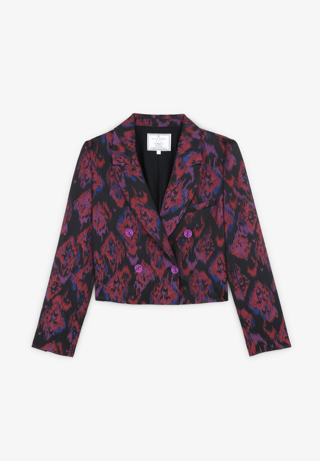 Blazer cropped com padrão. Confecionado em tecido confortável, corte cropped, fecho cruzado com botões e gola de lapelas