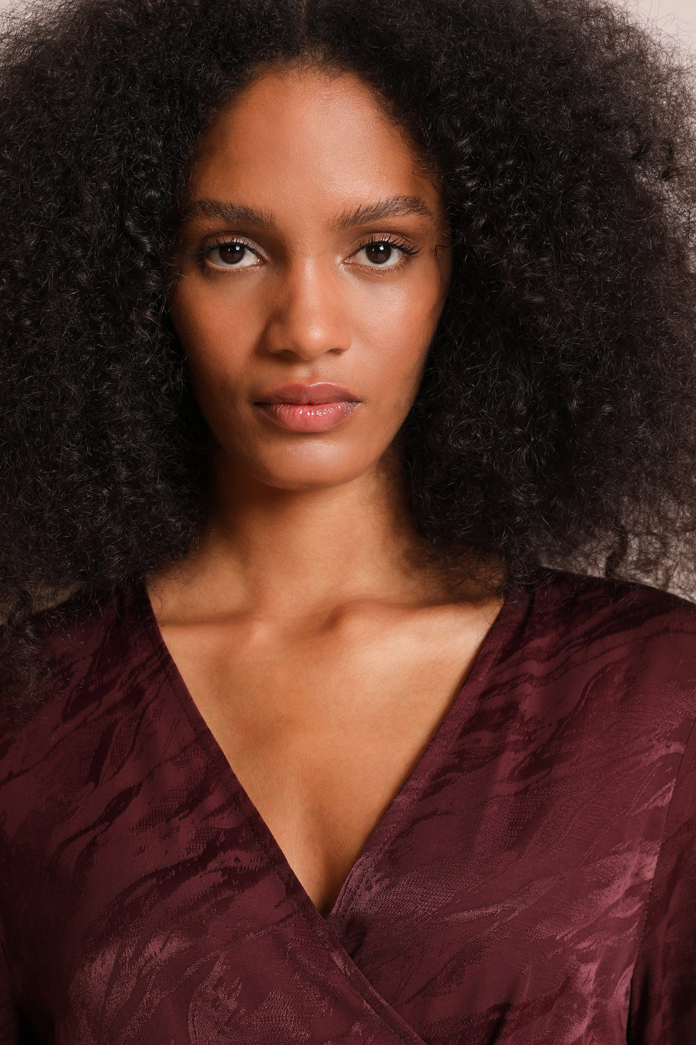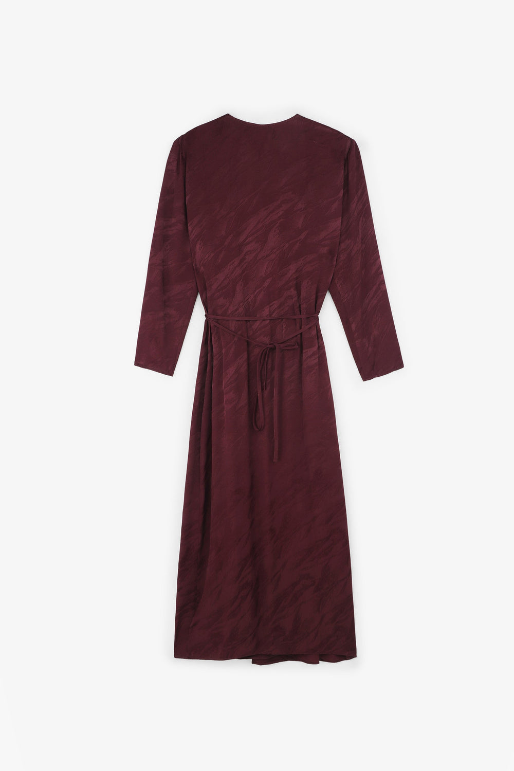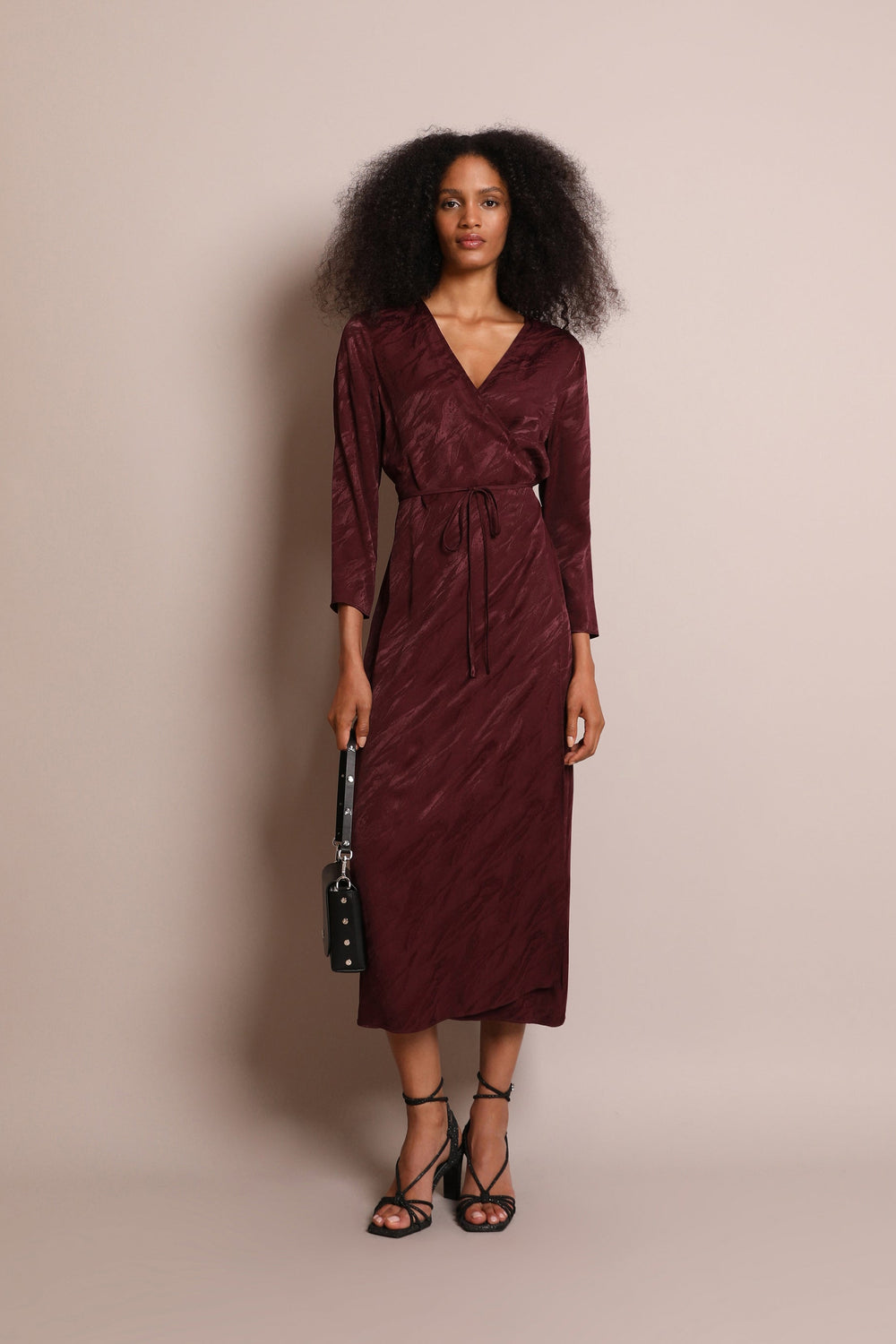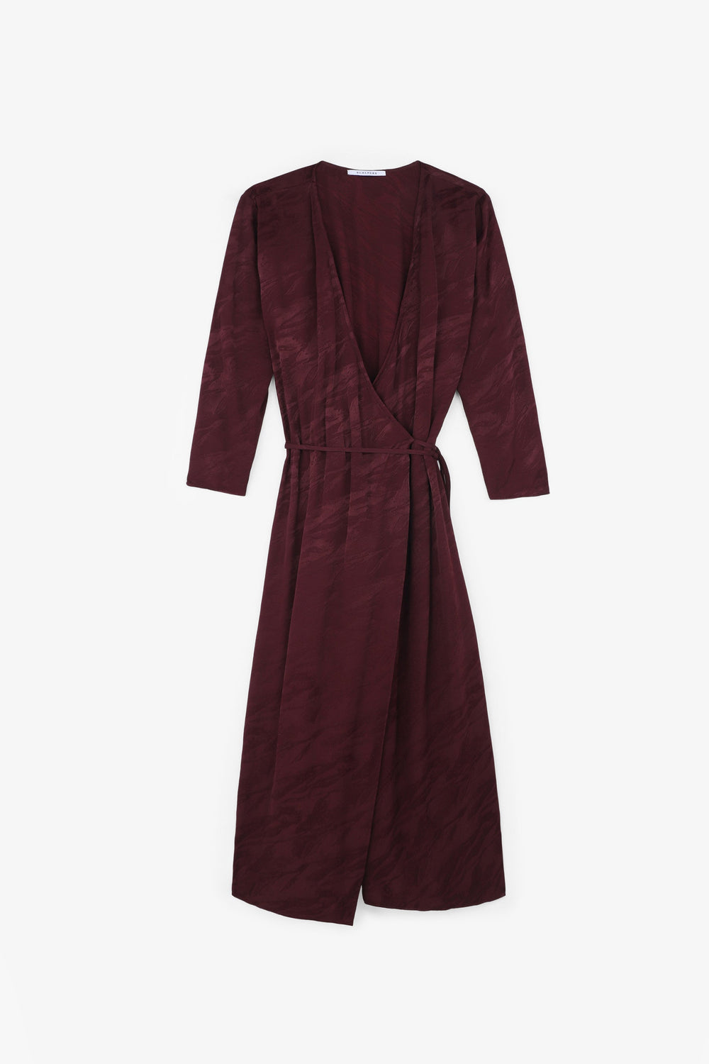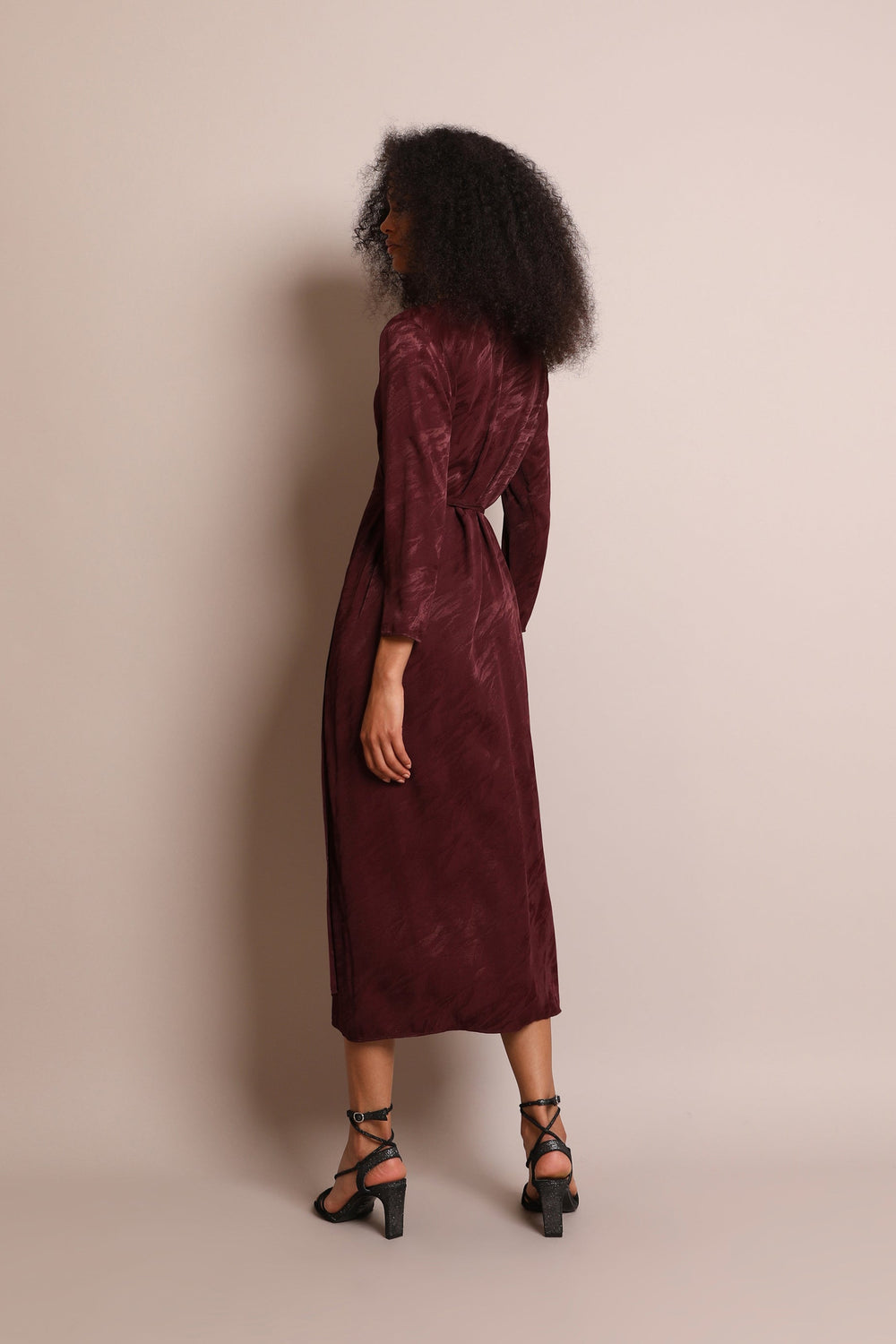 Vestido midi com tecido de jacquard confecionado em tecido fluido. Corte Regular Fit, fecho cruzado com laçada e decote em pico. Manga comprida.