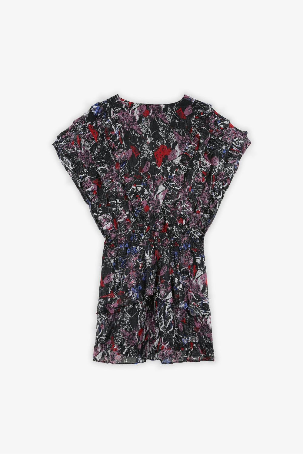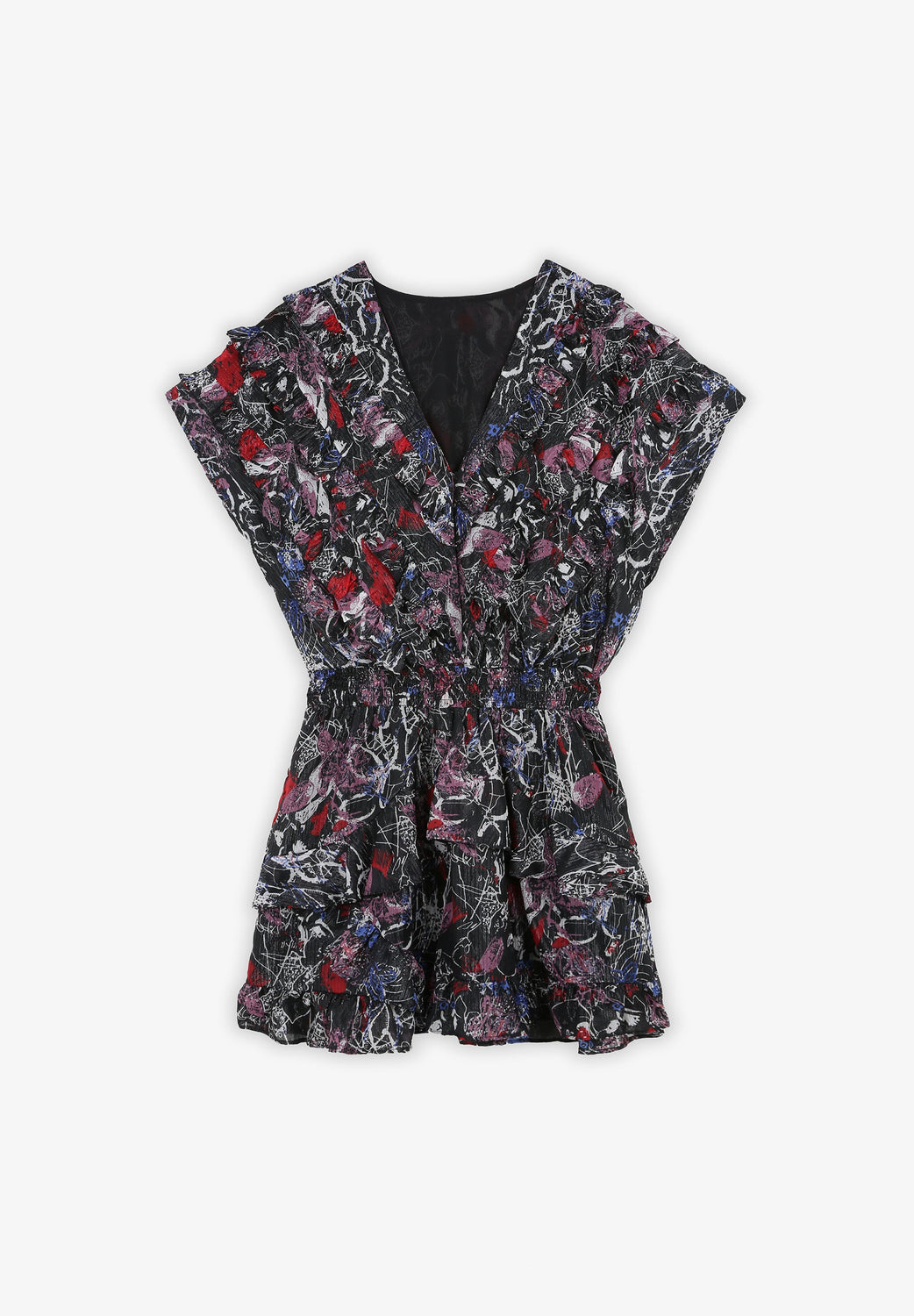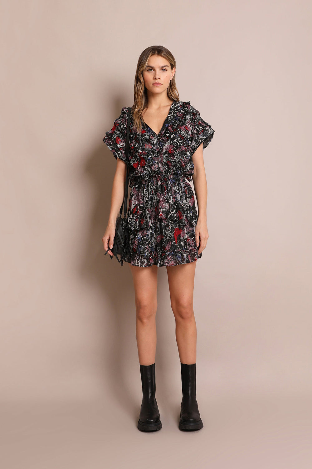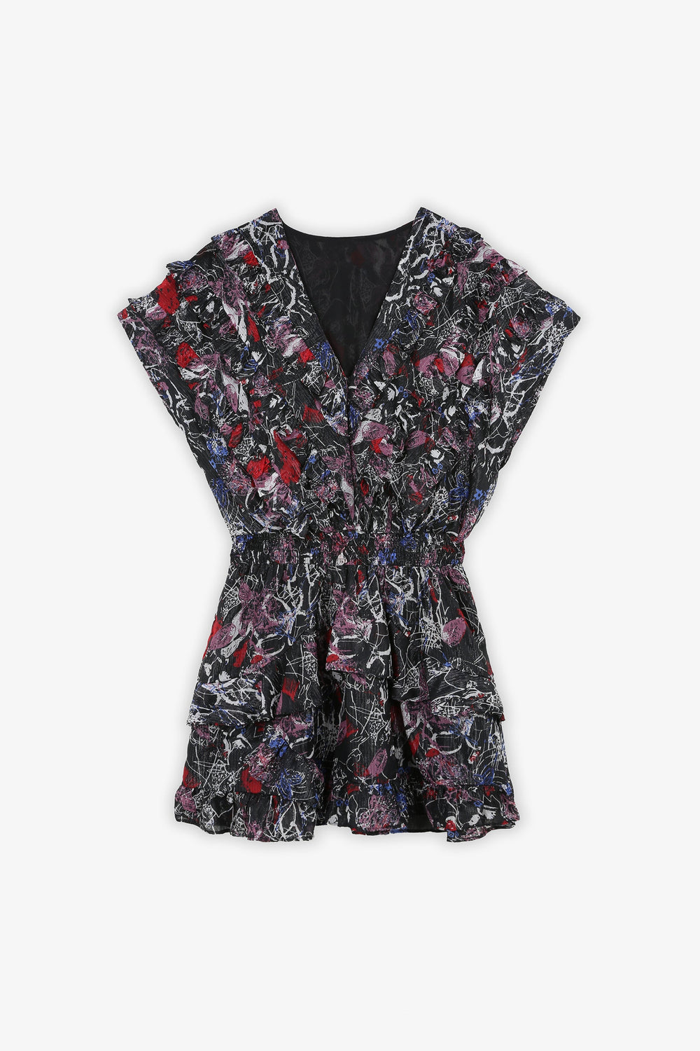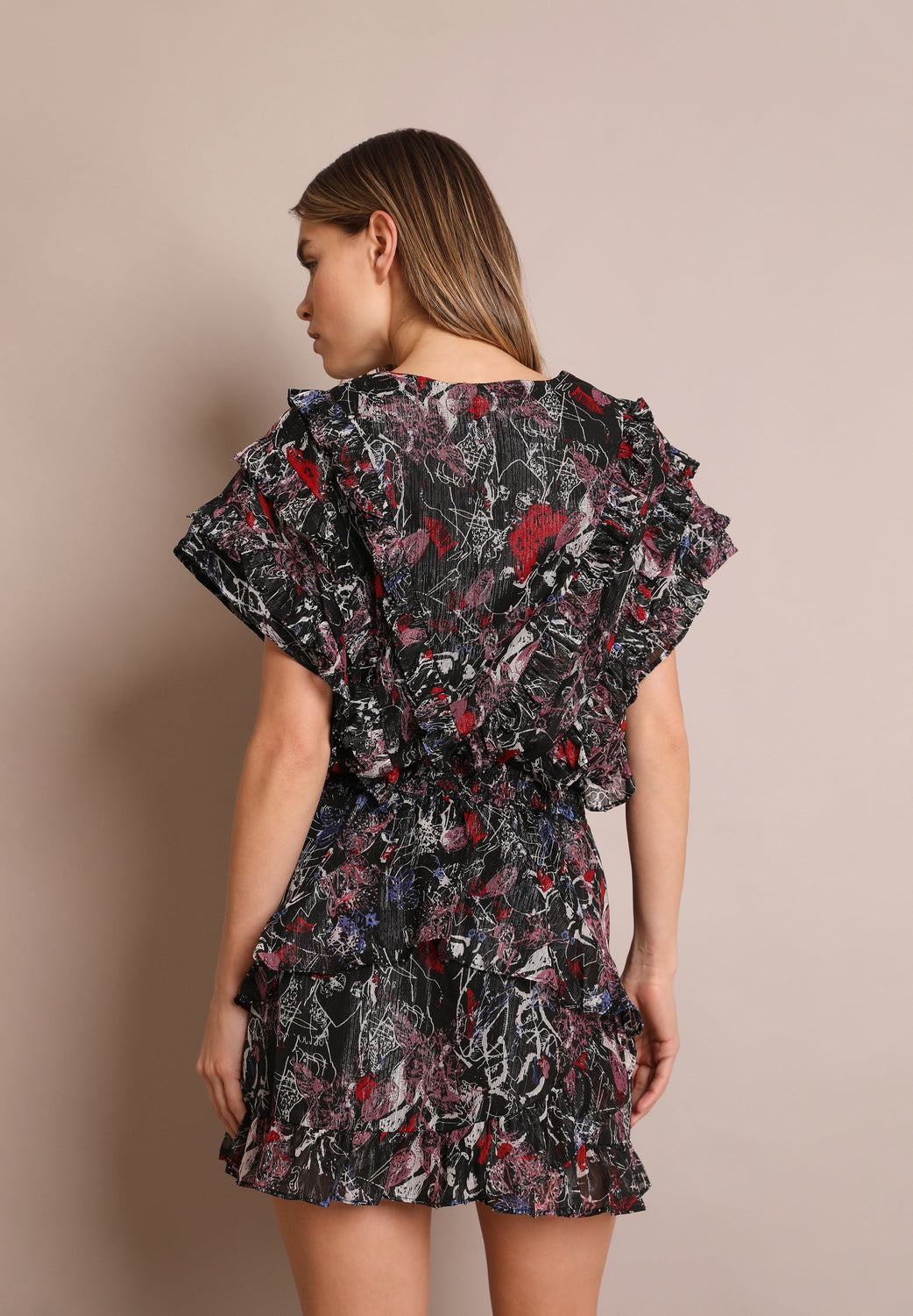 Minivestido com padrão metalizado. Confecionado em tecido fluido e fio metalizado, corte mini, decote de bico, cintura franzida e elástica, saia tipo folhos e pormenores de cores e metalizados