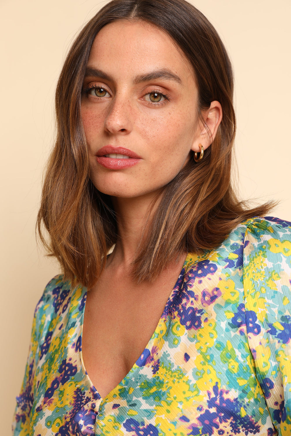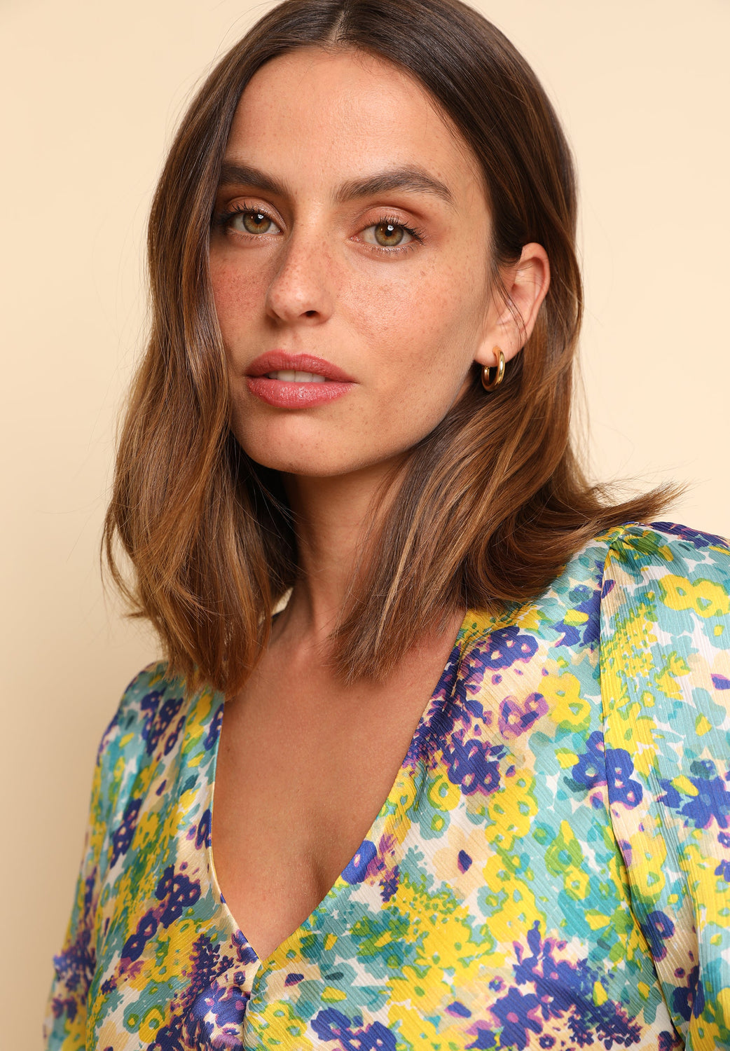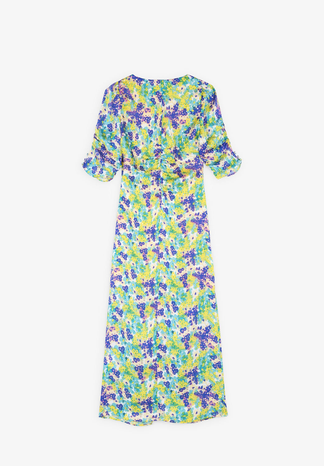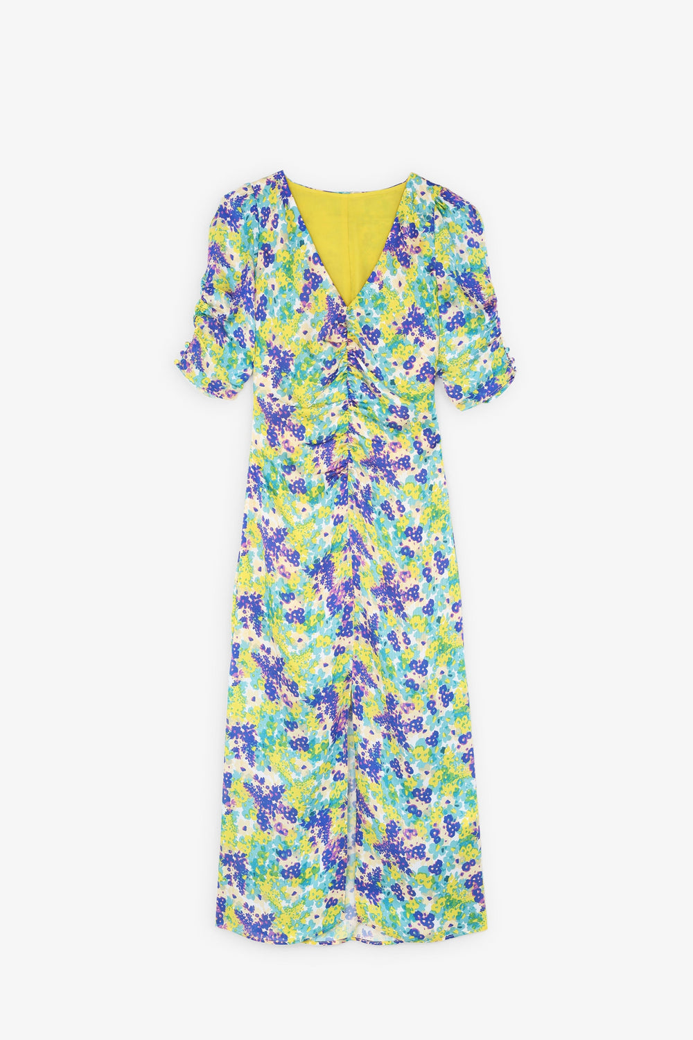 Vestido midi com padrão floral. Confecionado em tecido fluido. Corte Slim Fit. Fecho de correr. Decote em bico. Abertura à frente. Manga francesa com pormenor franzido.