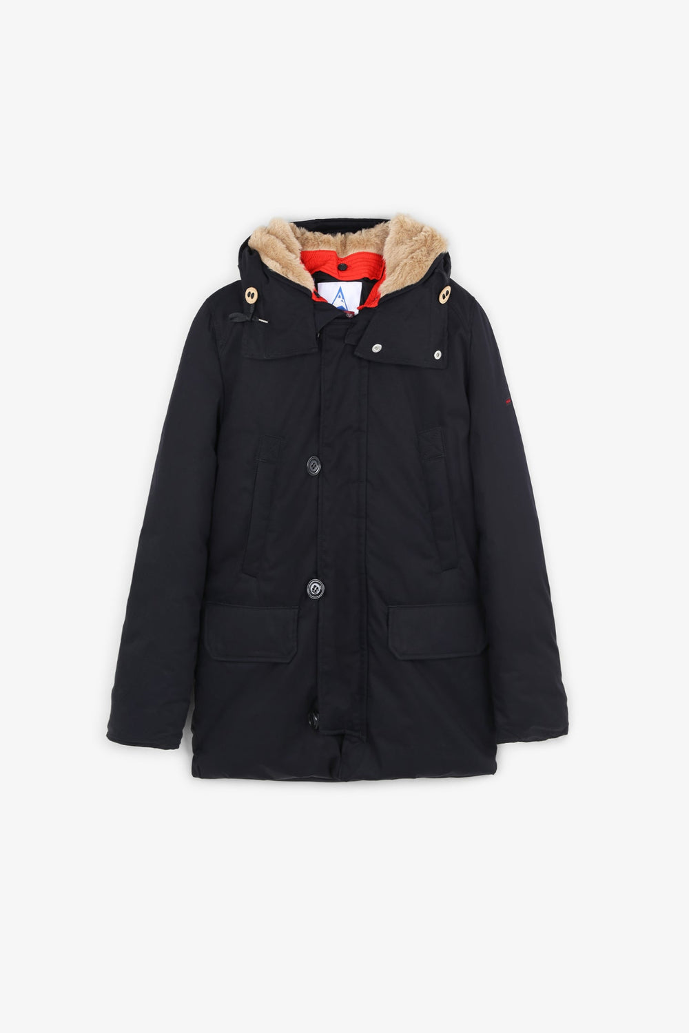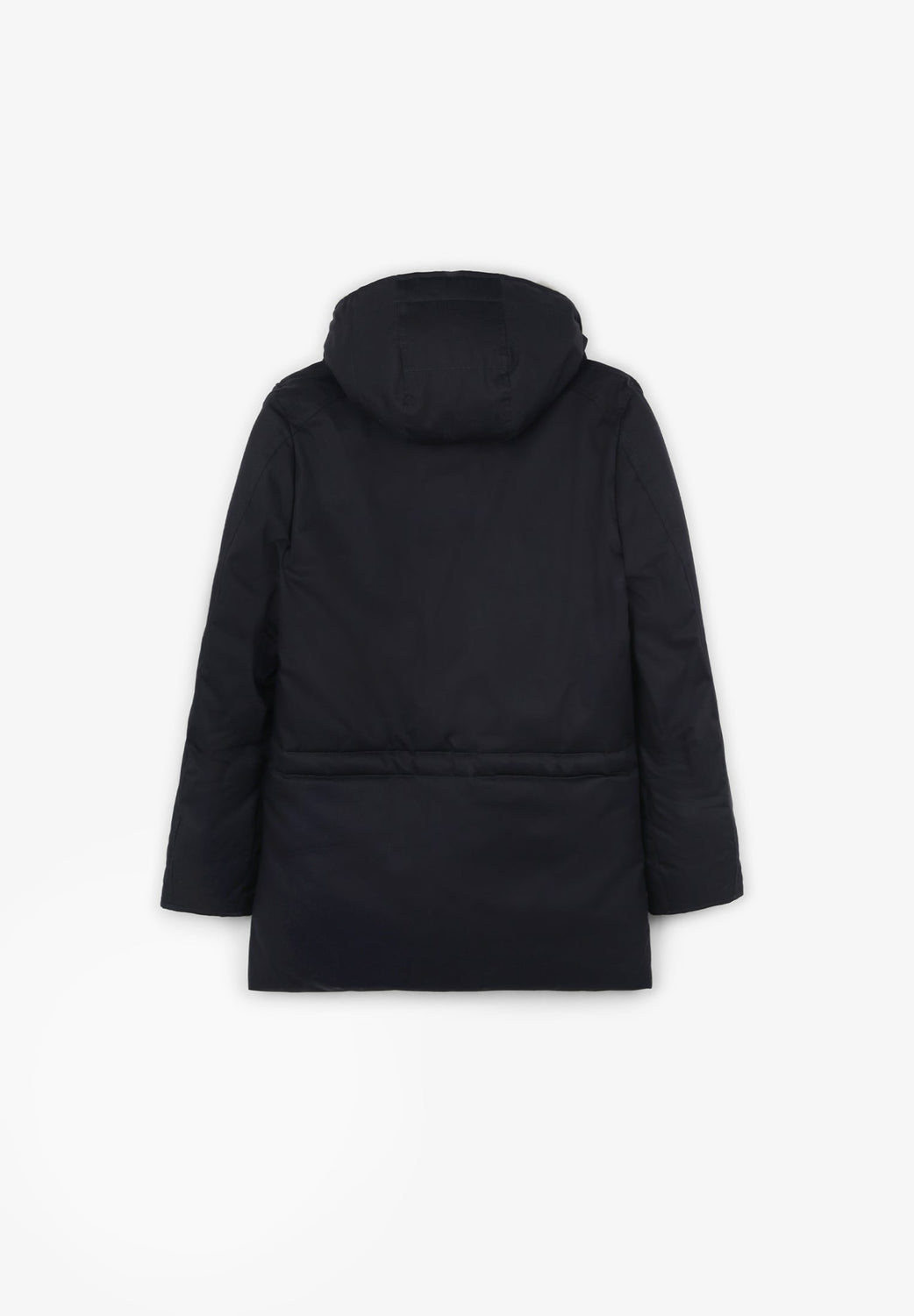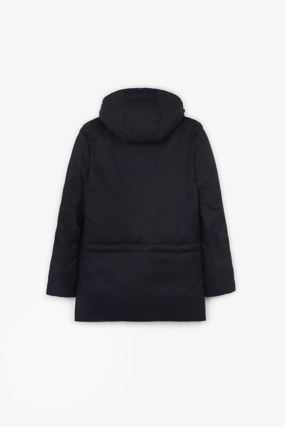 - Zip oculto de 2 vias e botões de pressão reforçados da marca em pele natural.