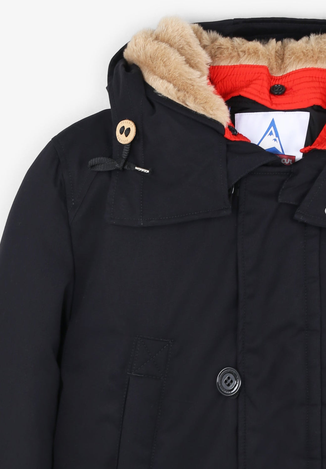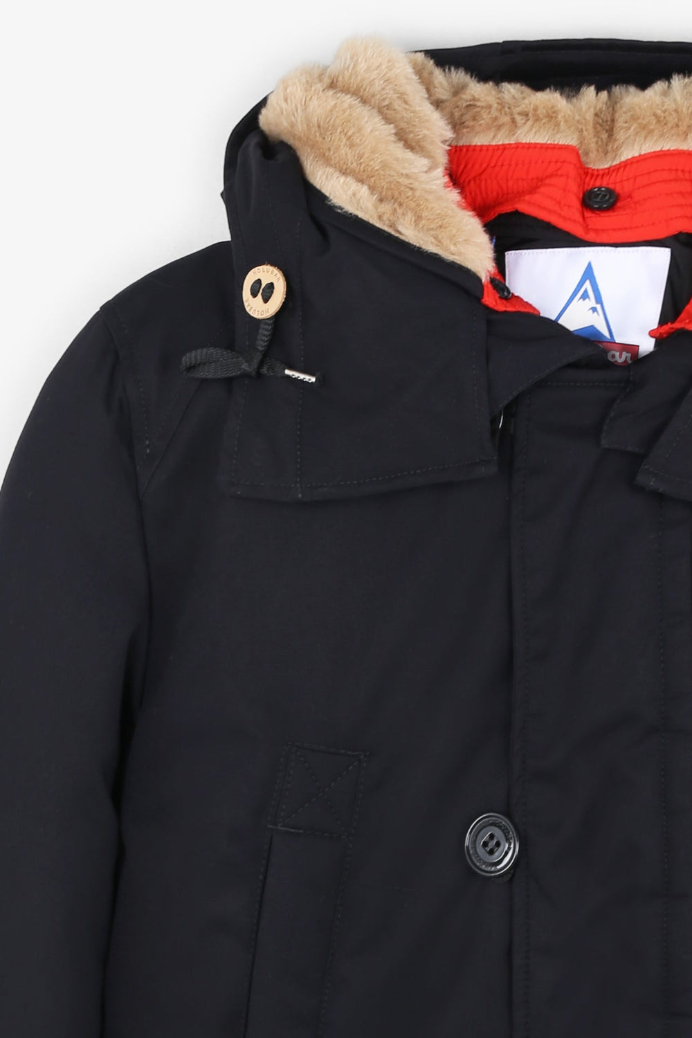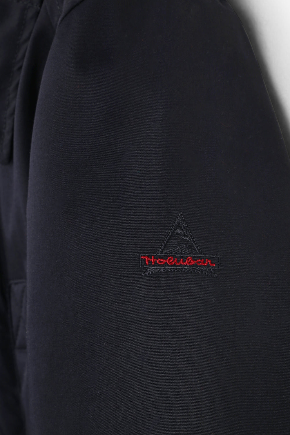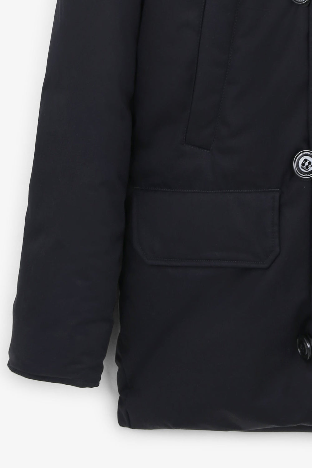 - Zip oculto de 2 vias e botões de pressão reforçados da marca em pele natural.