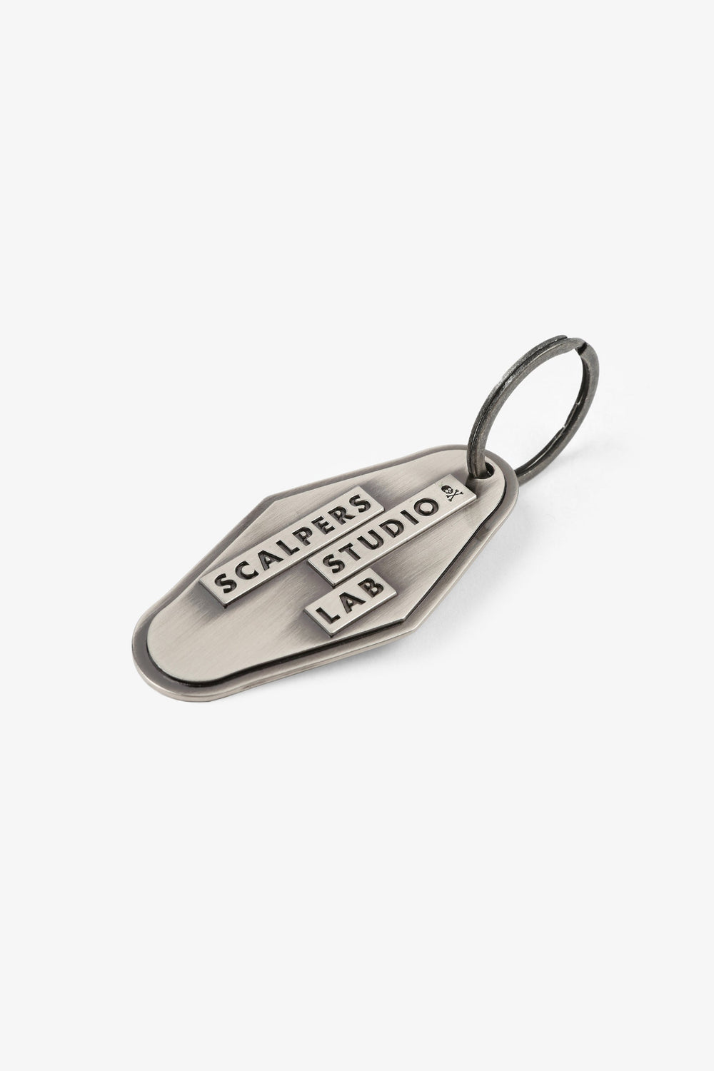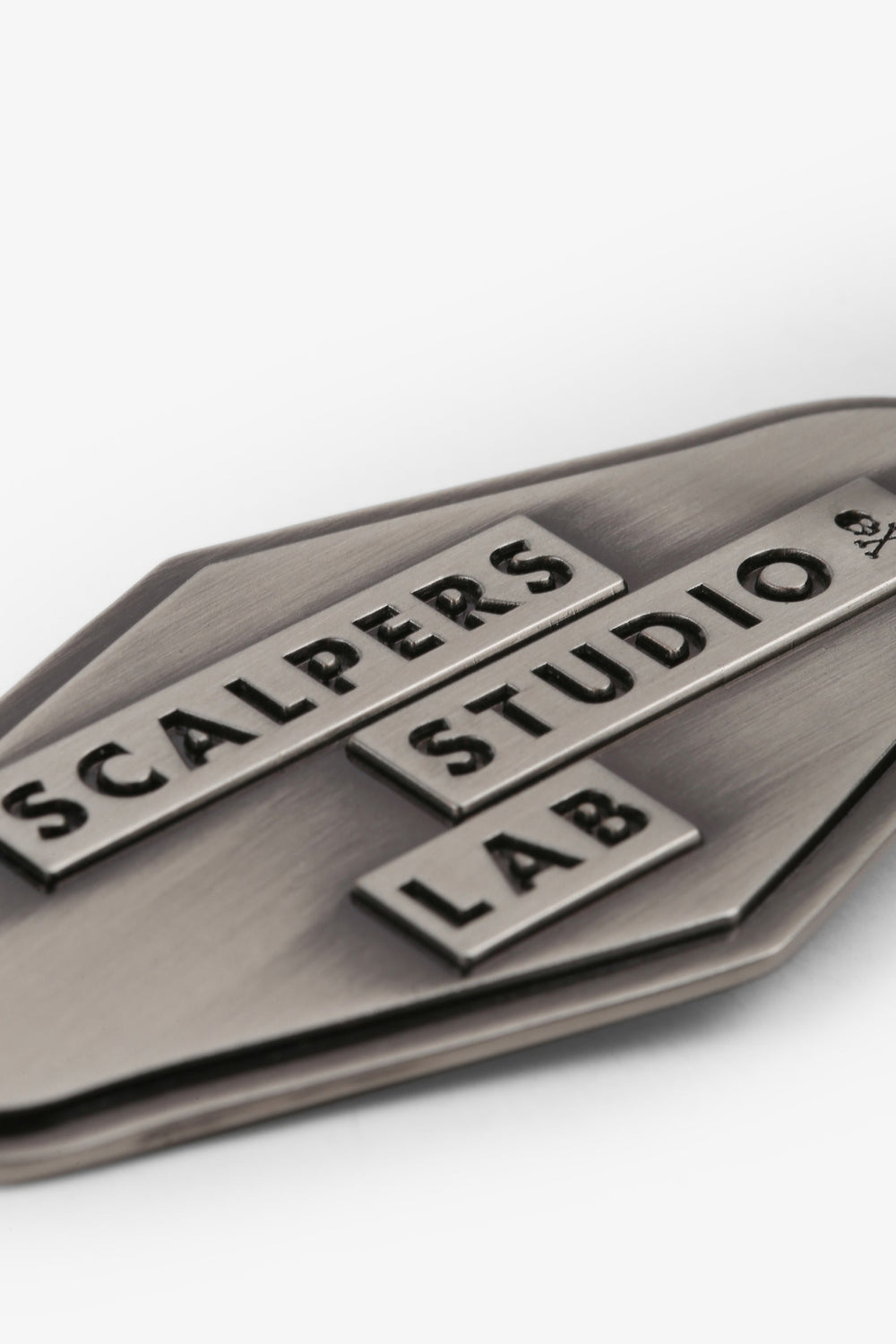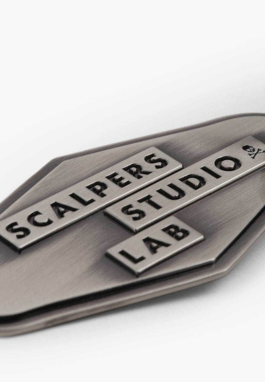 Chaveiro metálico. Confecionado em metal, arandela metálica e pormenores de texto e caveira