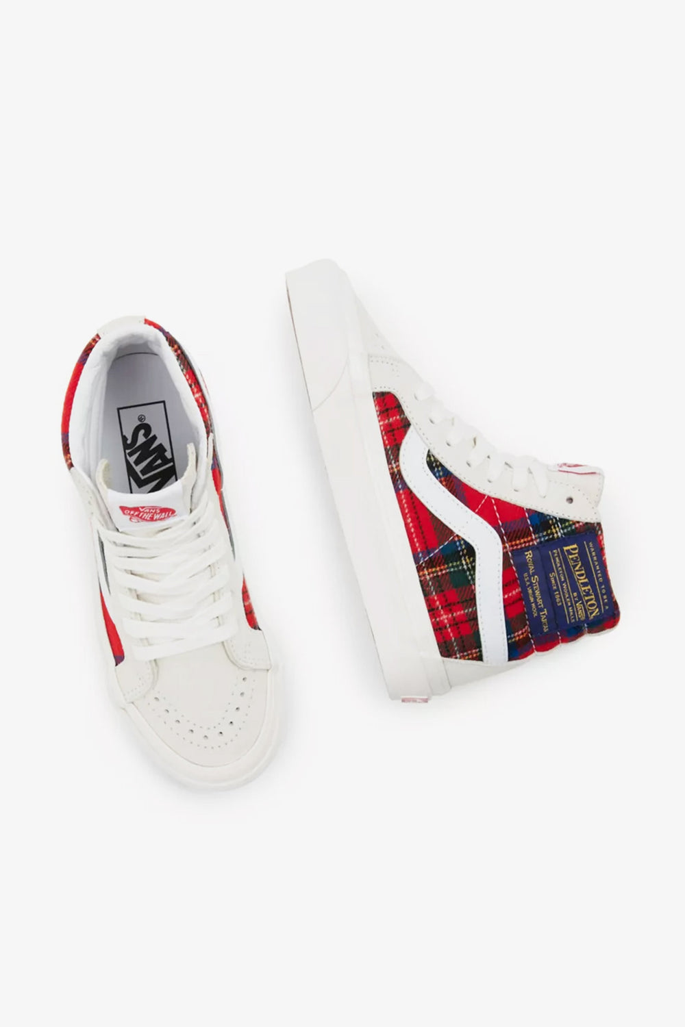 Sneakers Vans Anaheim Factory Sk8-Hi 38 DX, que rinden tributo su primera fábrica en Anaheim (California), incorporan detalles de las originales Sk8-Hi, modernizadas y mejoradas con plantillas Ortholite®. Legendarias zapatillas de caña alta también incluyen detalles retro, como el número de modelo original, banda protectora con más brillo y cordones de algodón. La pala de ante resistente y clásica de cuadros de Pendleton completa el emblemático look.