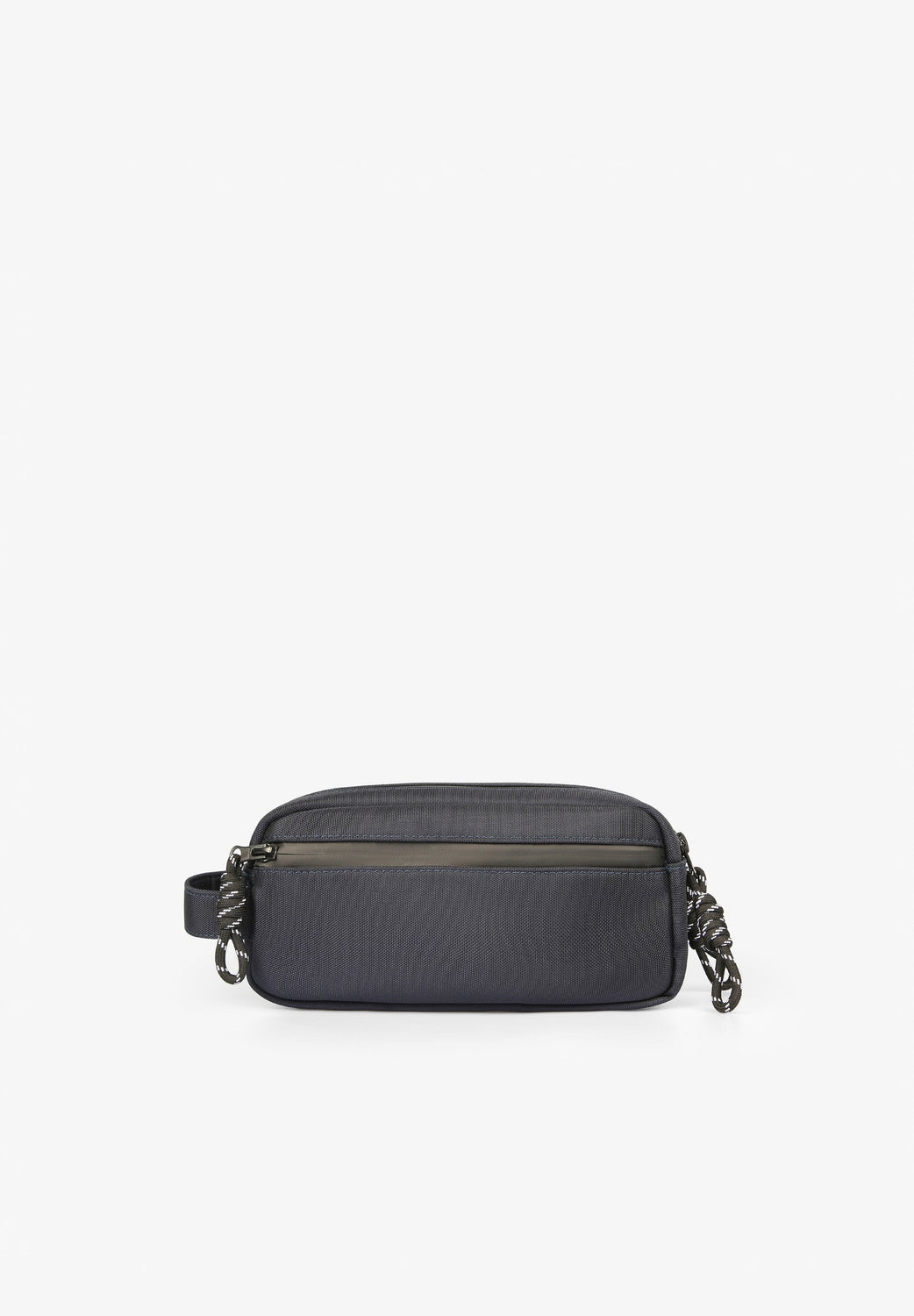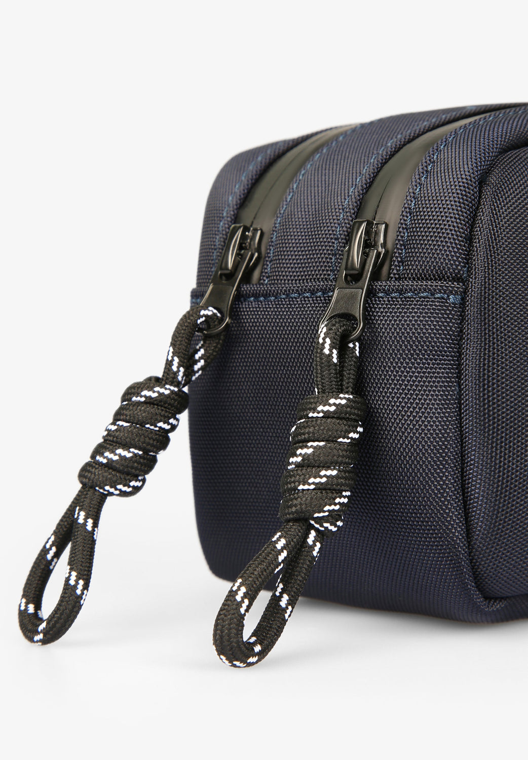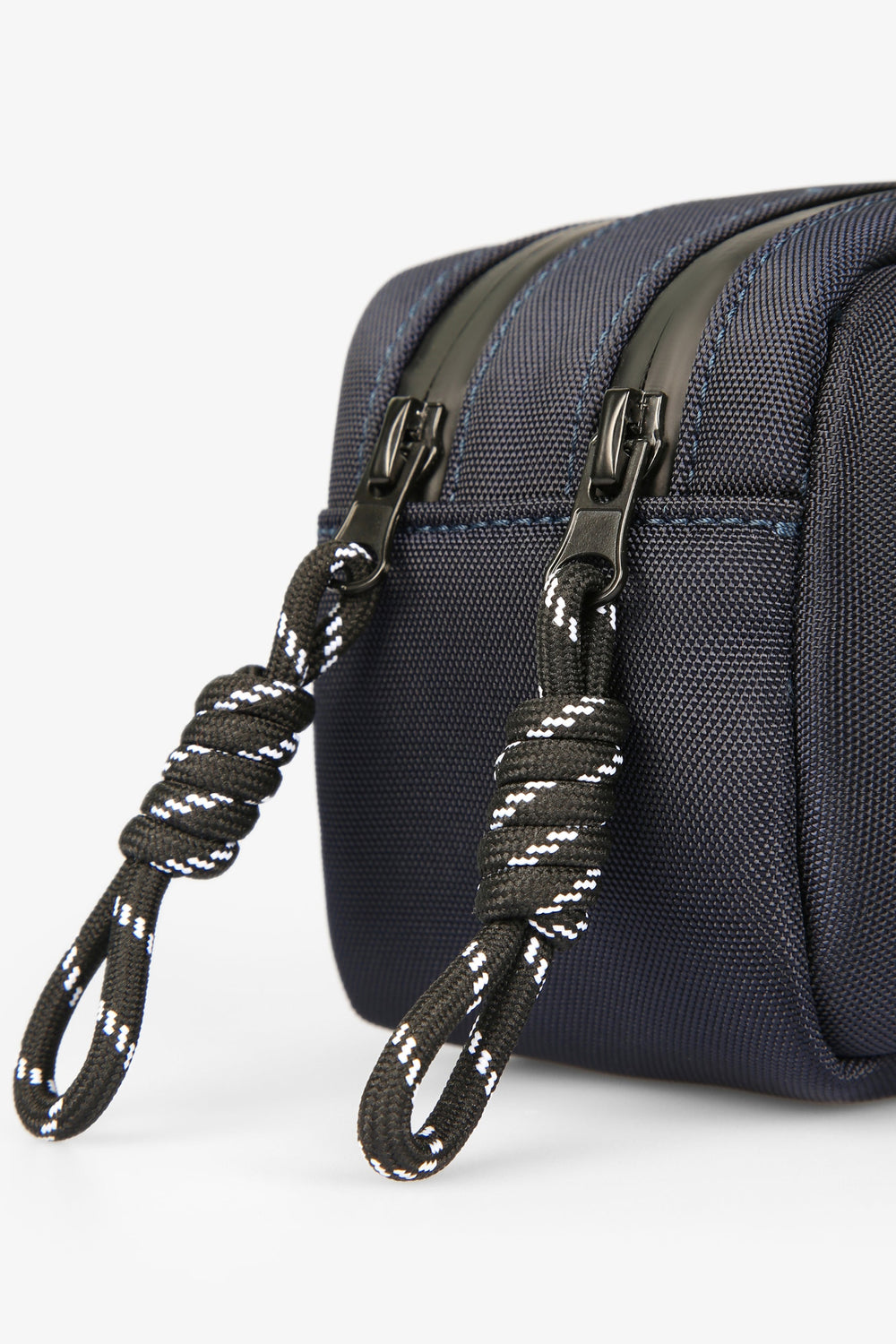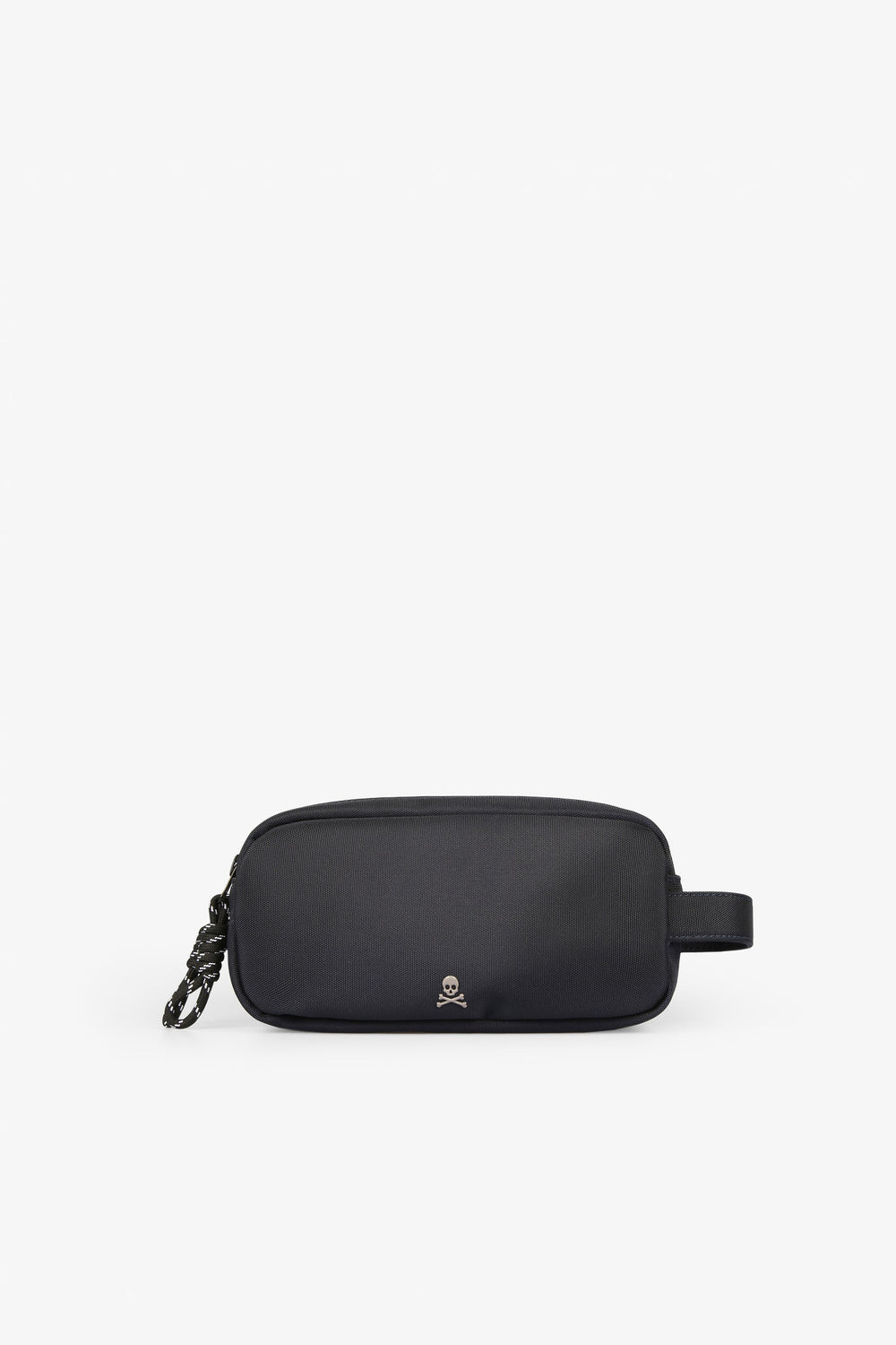 Necessaire com caveira frontal. Confeccionado em tecido técnico. Bolso duplo com fecho de correr. Alça lateral.