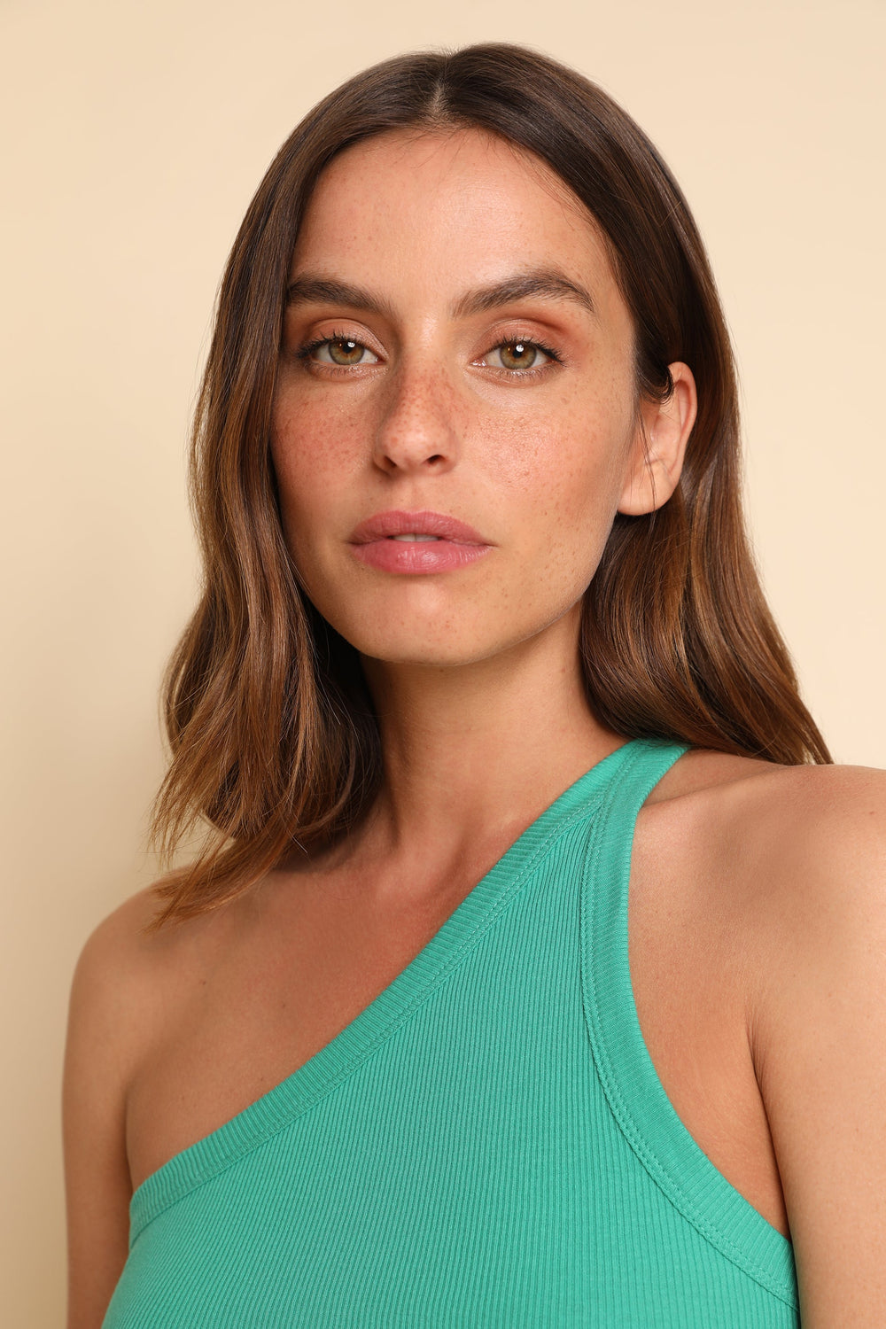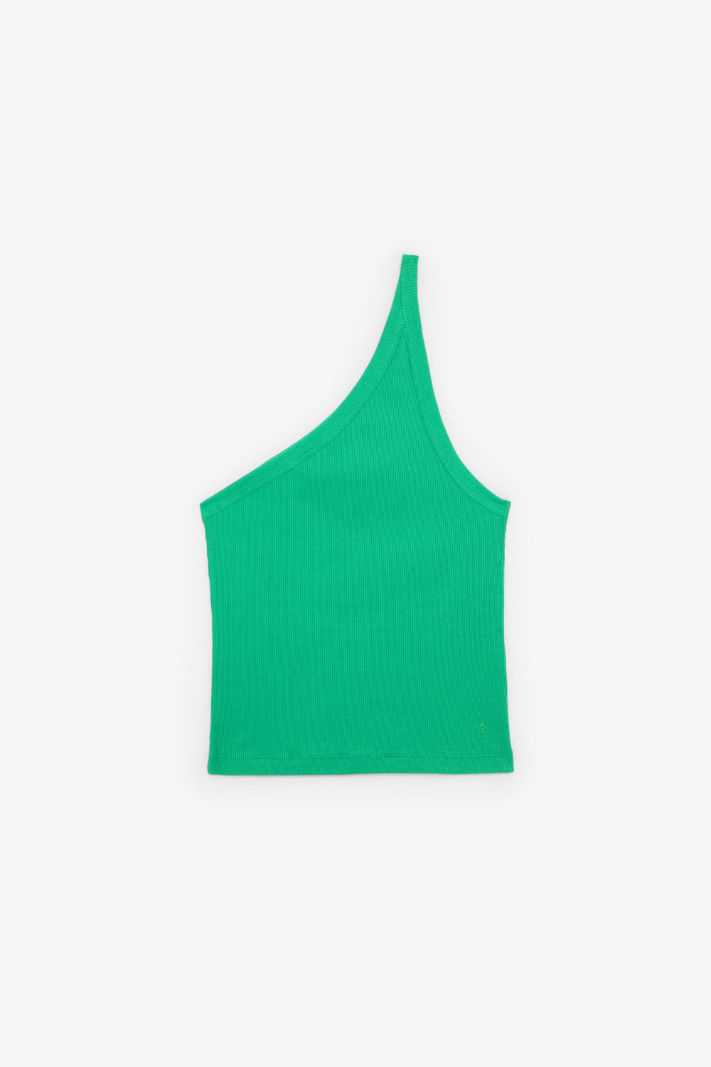 T-shirt assimétrica canelada confecionada em 100% algodão. Corte Slim Fit, manga assimétrica e pormenor de tira cruzada nas costas.