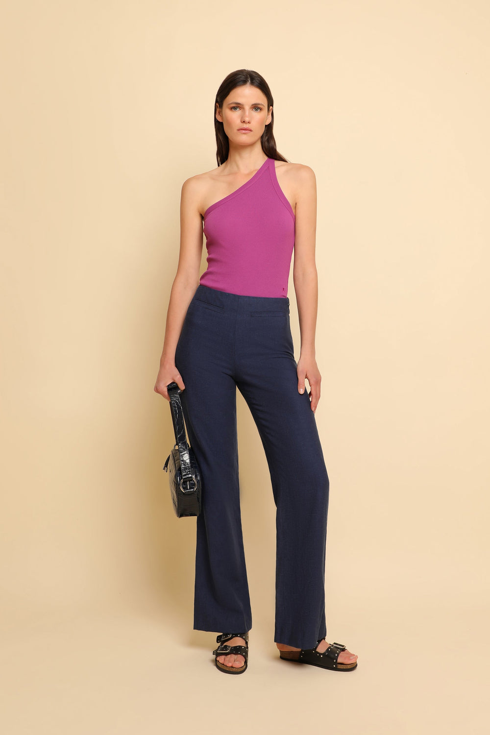 T-shirt assimétrica canelada confecionada em 100% algodão. Corte Slim Fit, manga assimétrica e pormenor de tira cruzada nas costas.