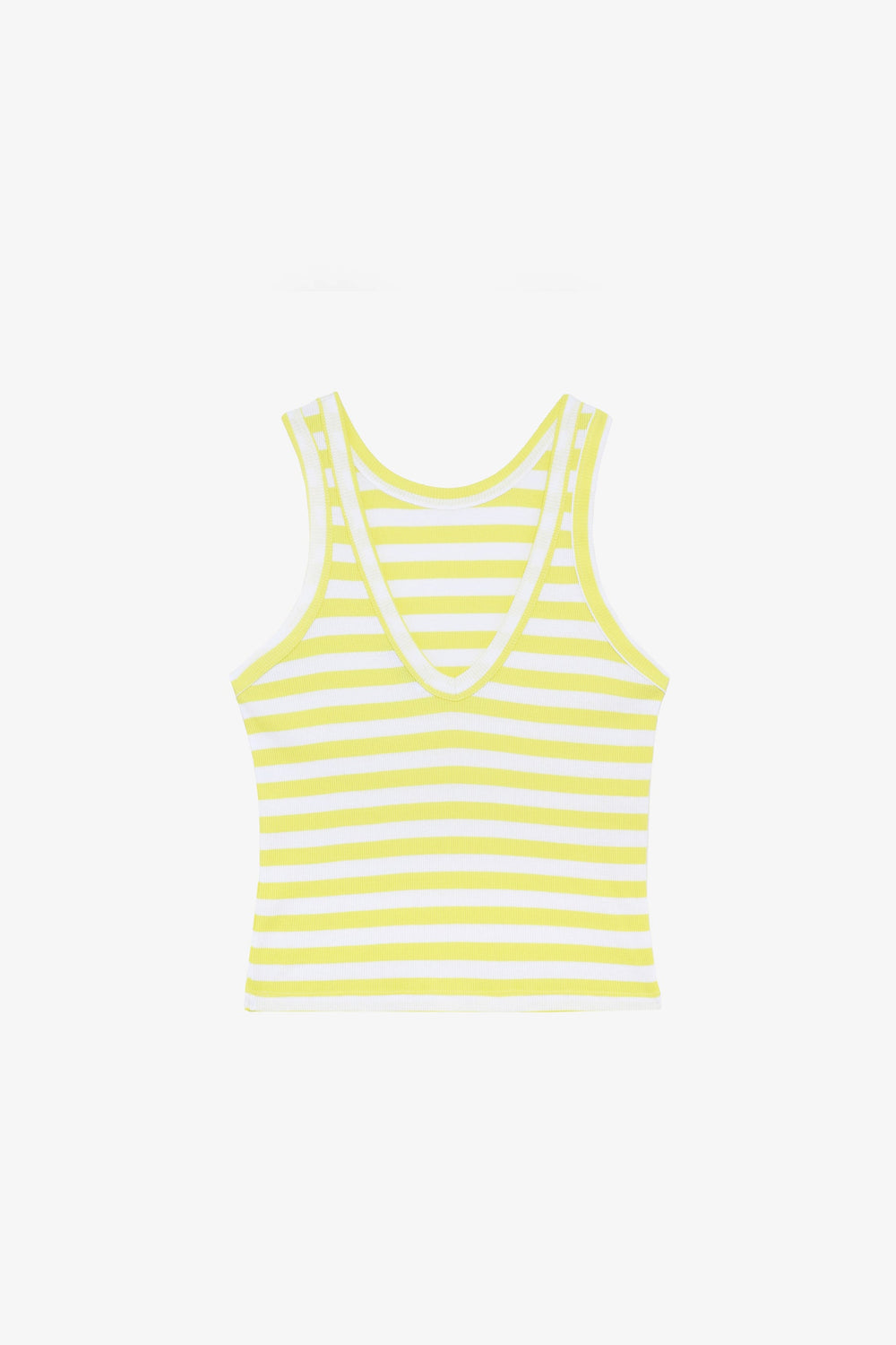 T-shirt às riscas confecionada em 100% algodão. Corte Slim Fit, decote em bico e alças largas.