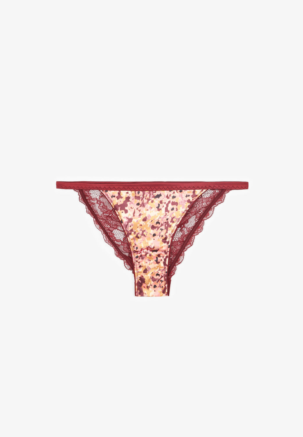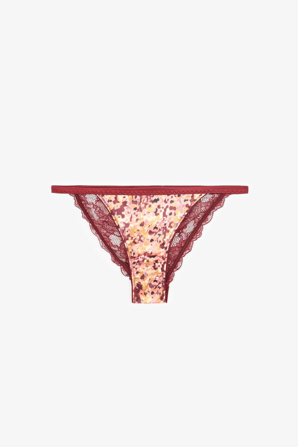 Cuecas com padrão confecionadas em tecido acetinado. Parte de trás em lace floral e faixas laterais elásticas.