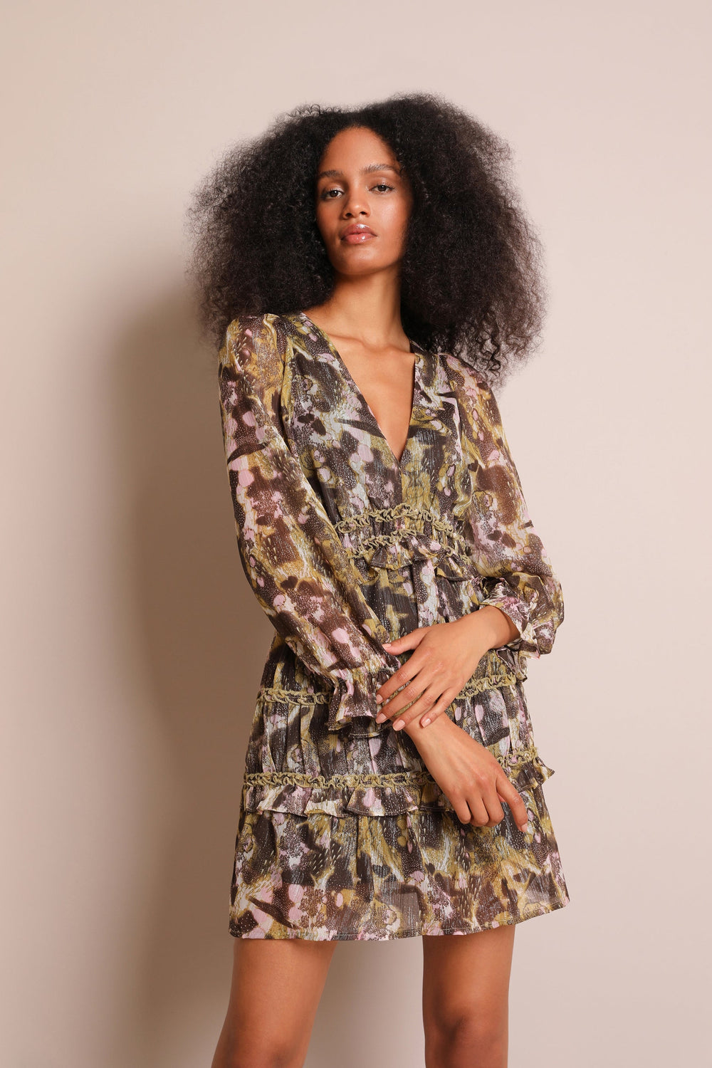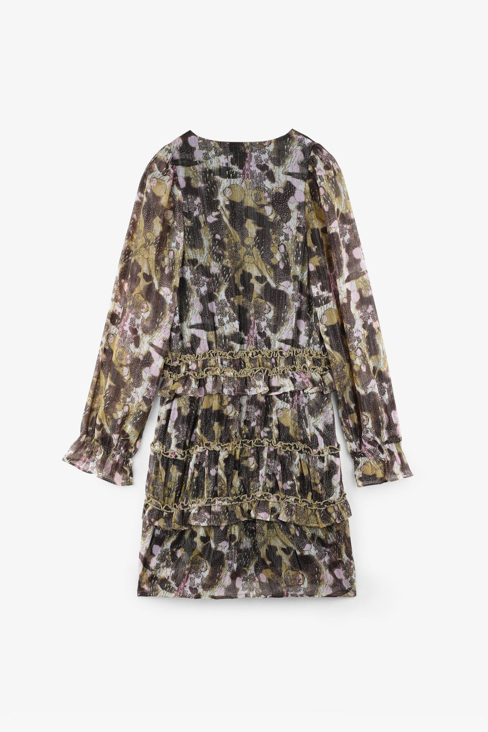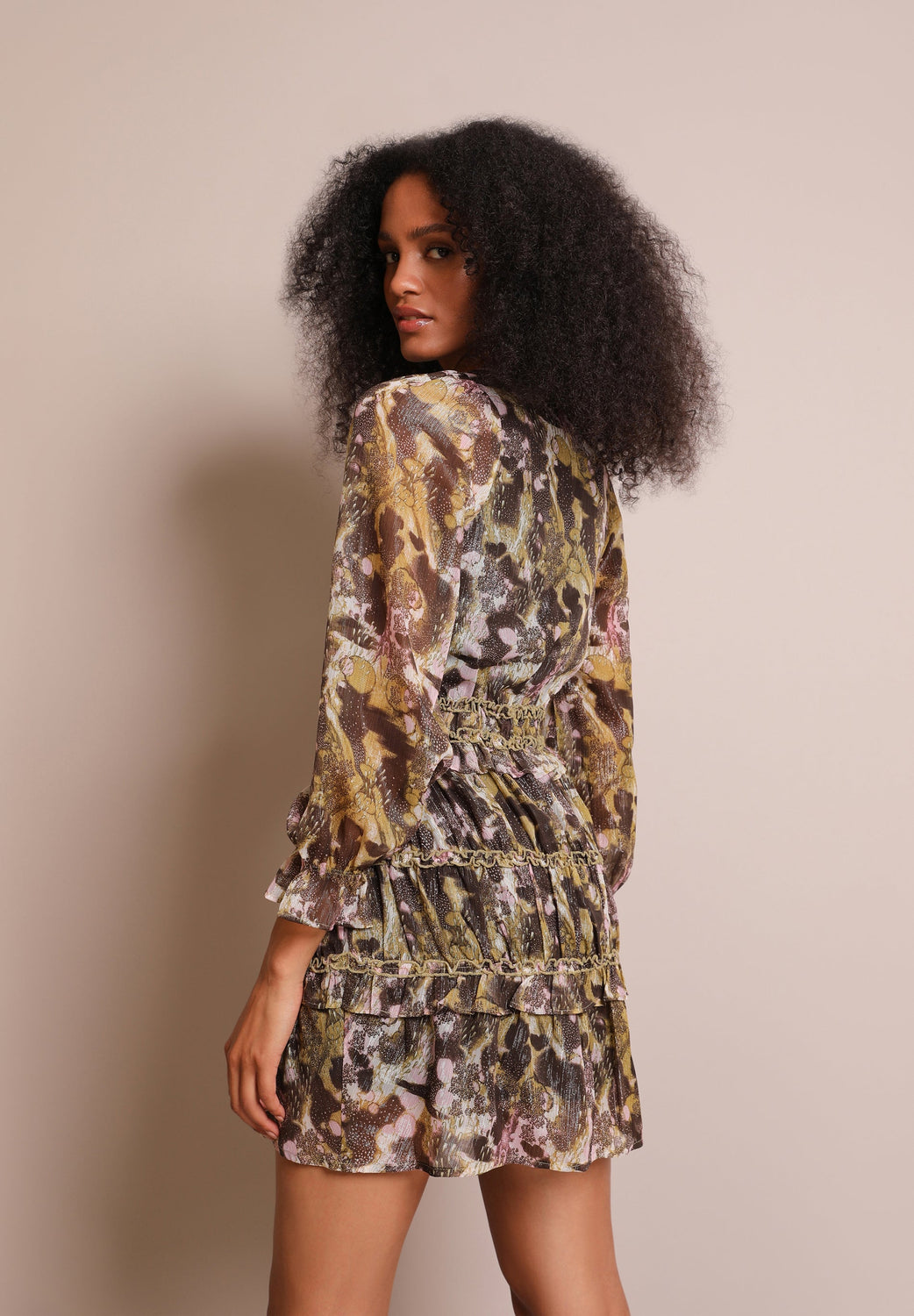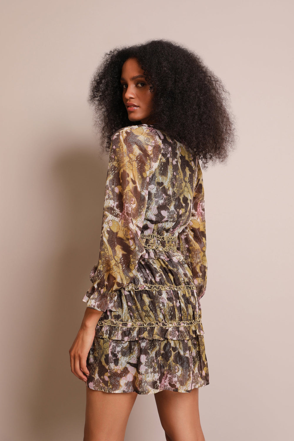Vestido mini com padrão confecionado em tecido fluido. Corte Regular Fit, gola com decote em V e manga comprida terminada em franzido. Pormenor de folhos na saia e decote com pespontos a contraste.