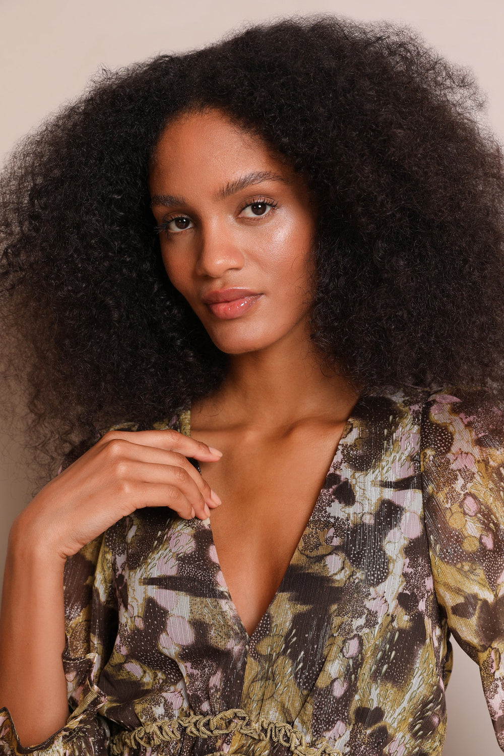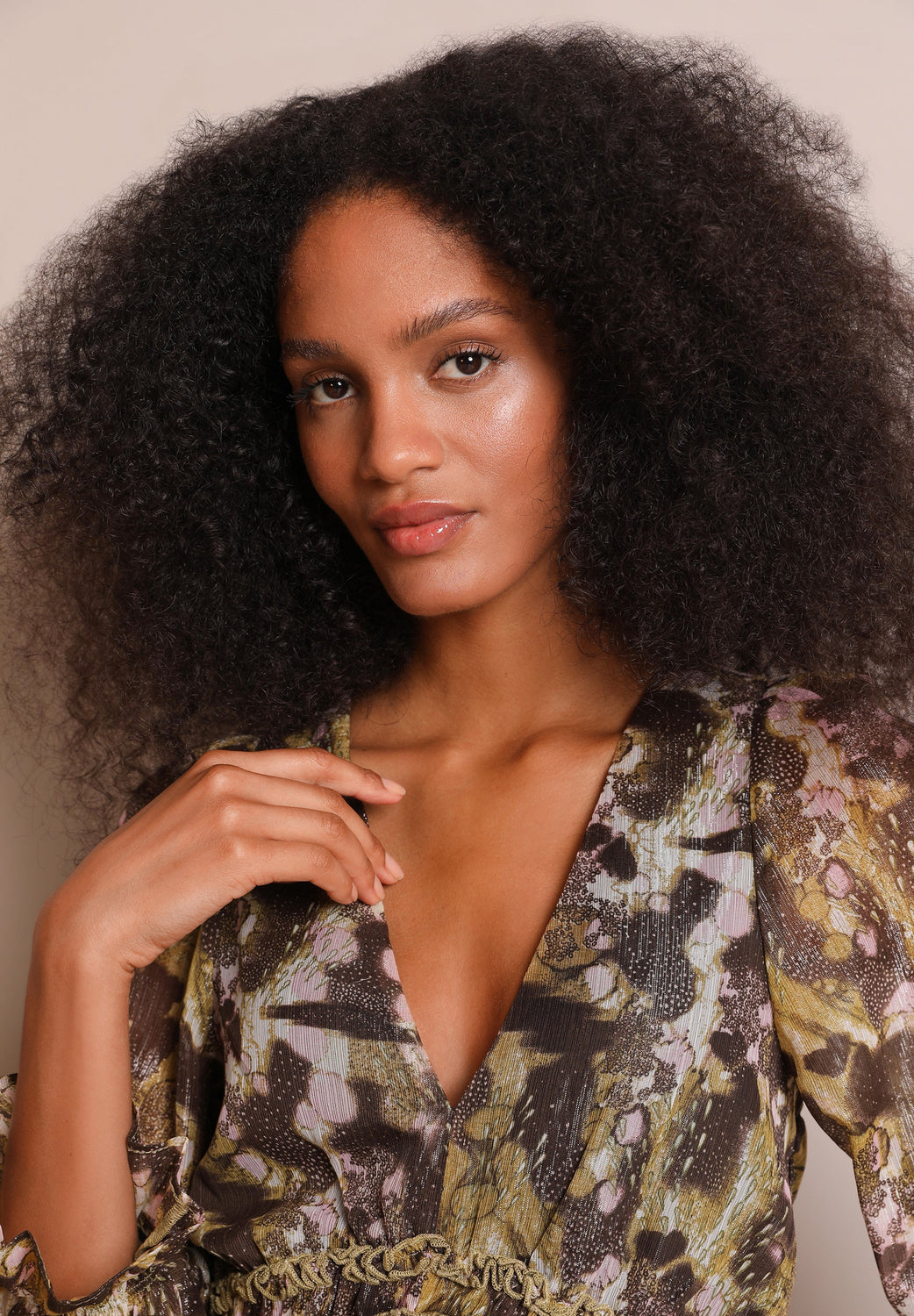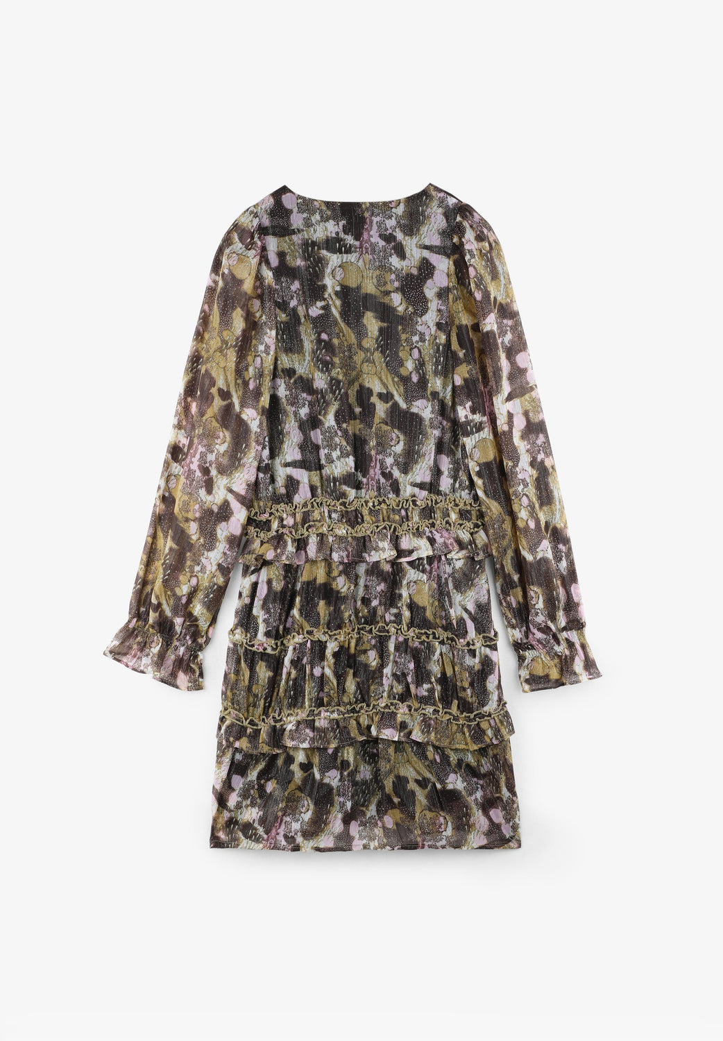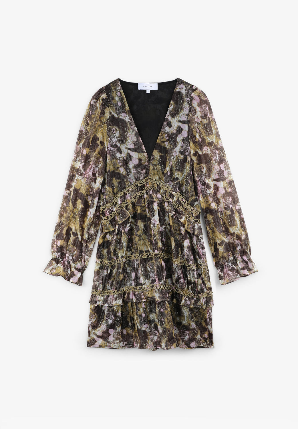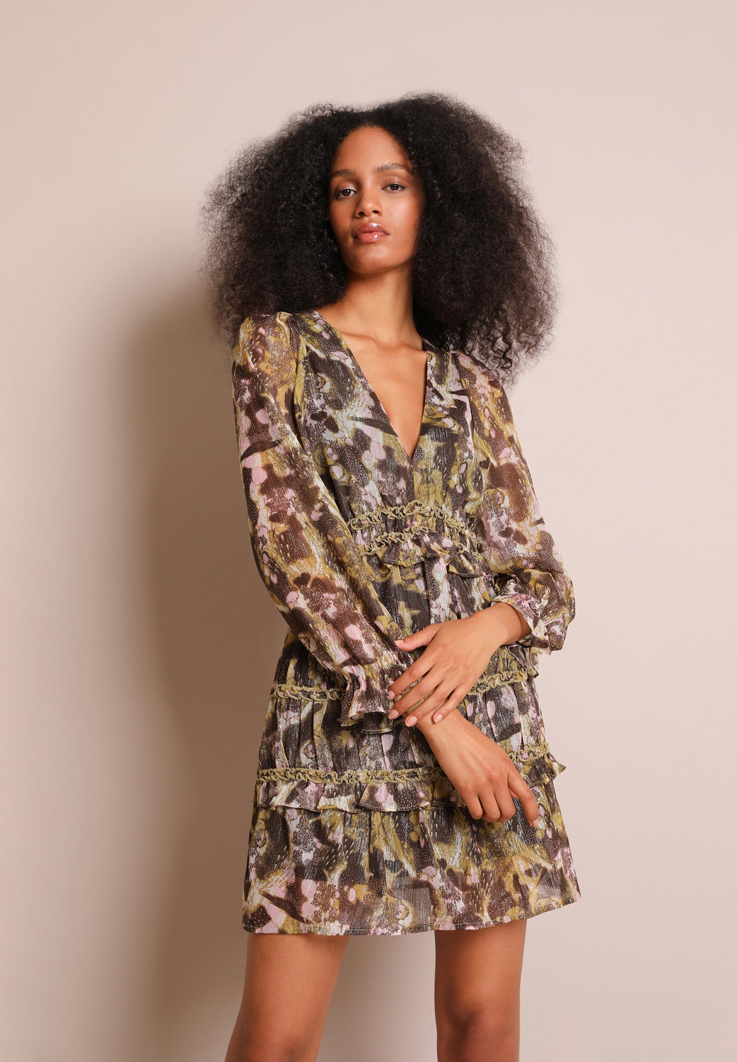 Vestido mini com padrão confecionado em tecido fluido. Corte Regular Fit, gola com decote em V e manga comprida terminada em franzido. Pormenor de folhos na saia e decote com pespontos a contraste.
