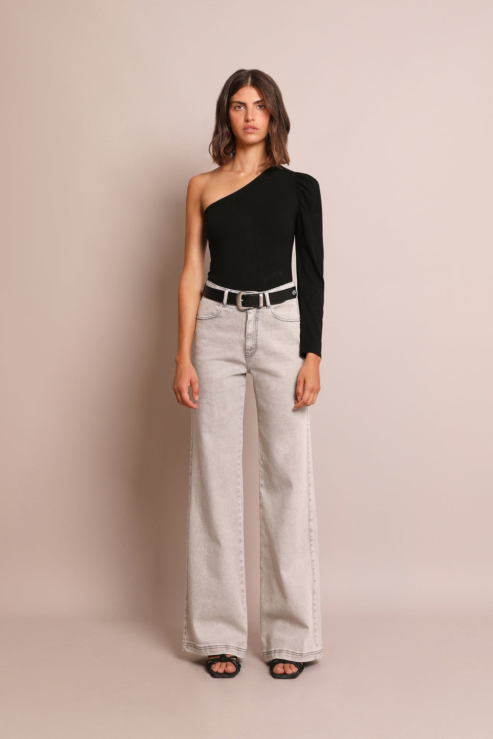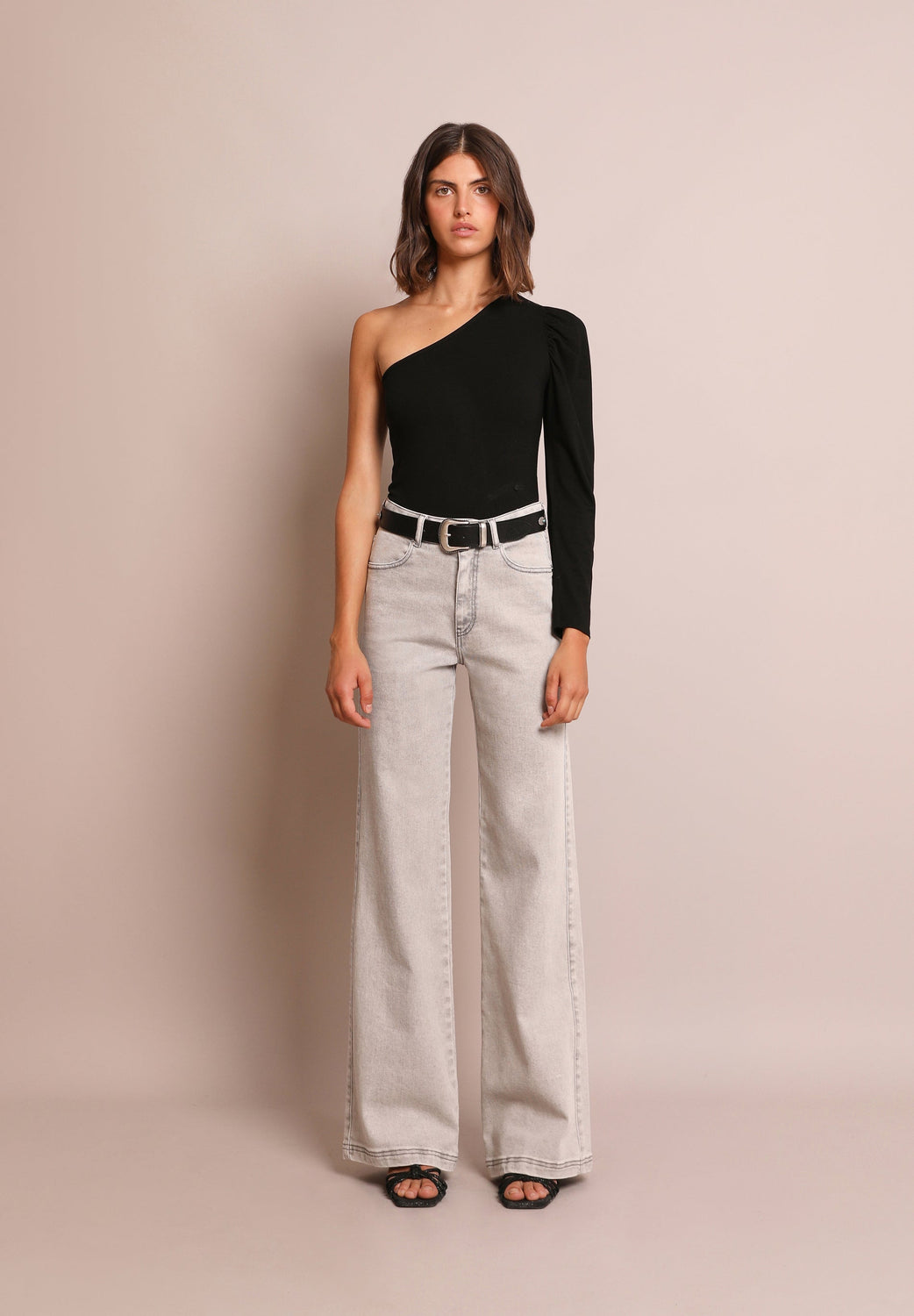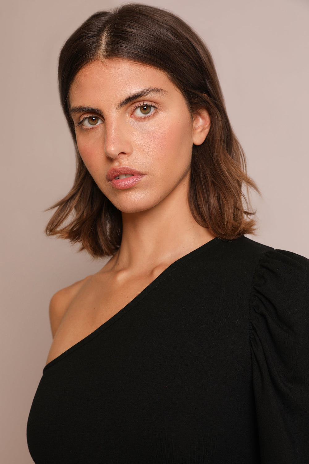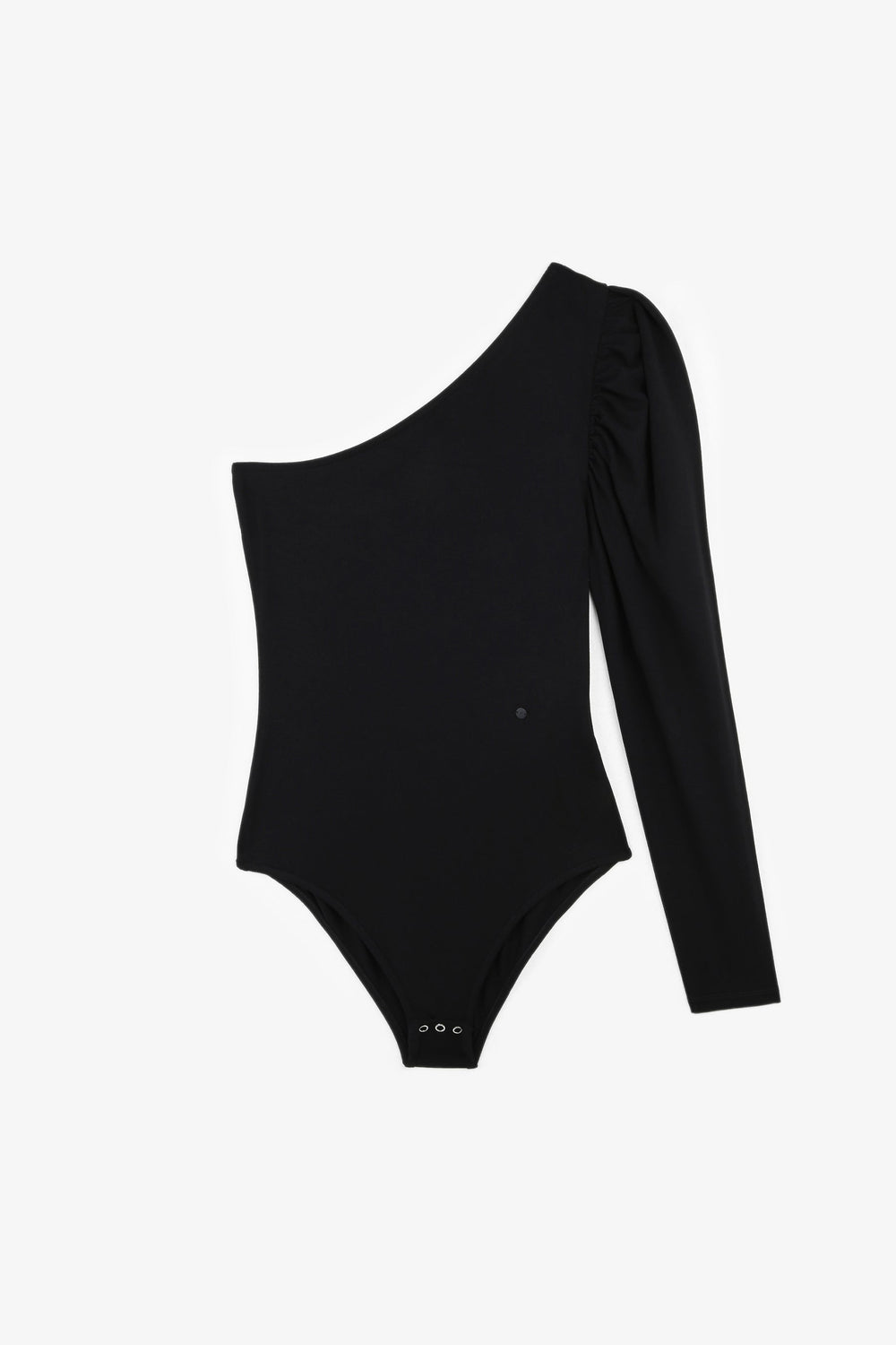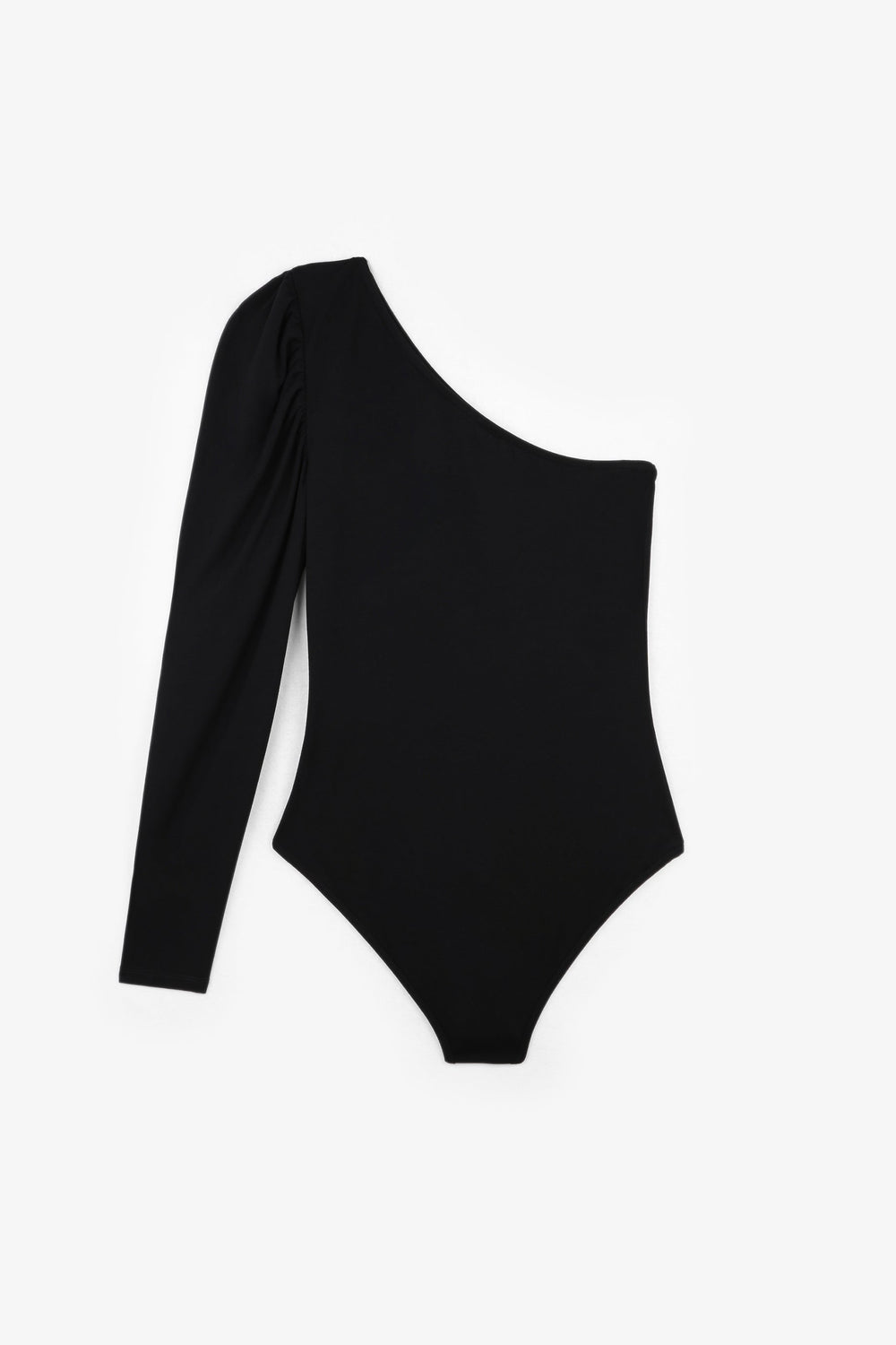 Vestido assimétrico confecionado em tecido elástico. Corte Slim Fit, decote assimétrico e manga ligeiramente abalonada. Fecho na parte baixa.
