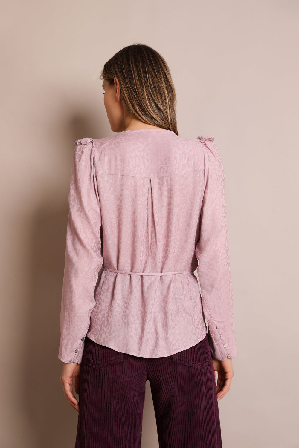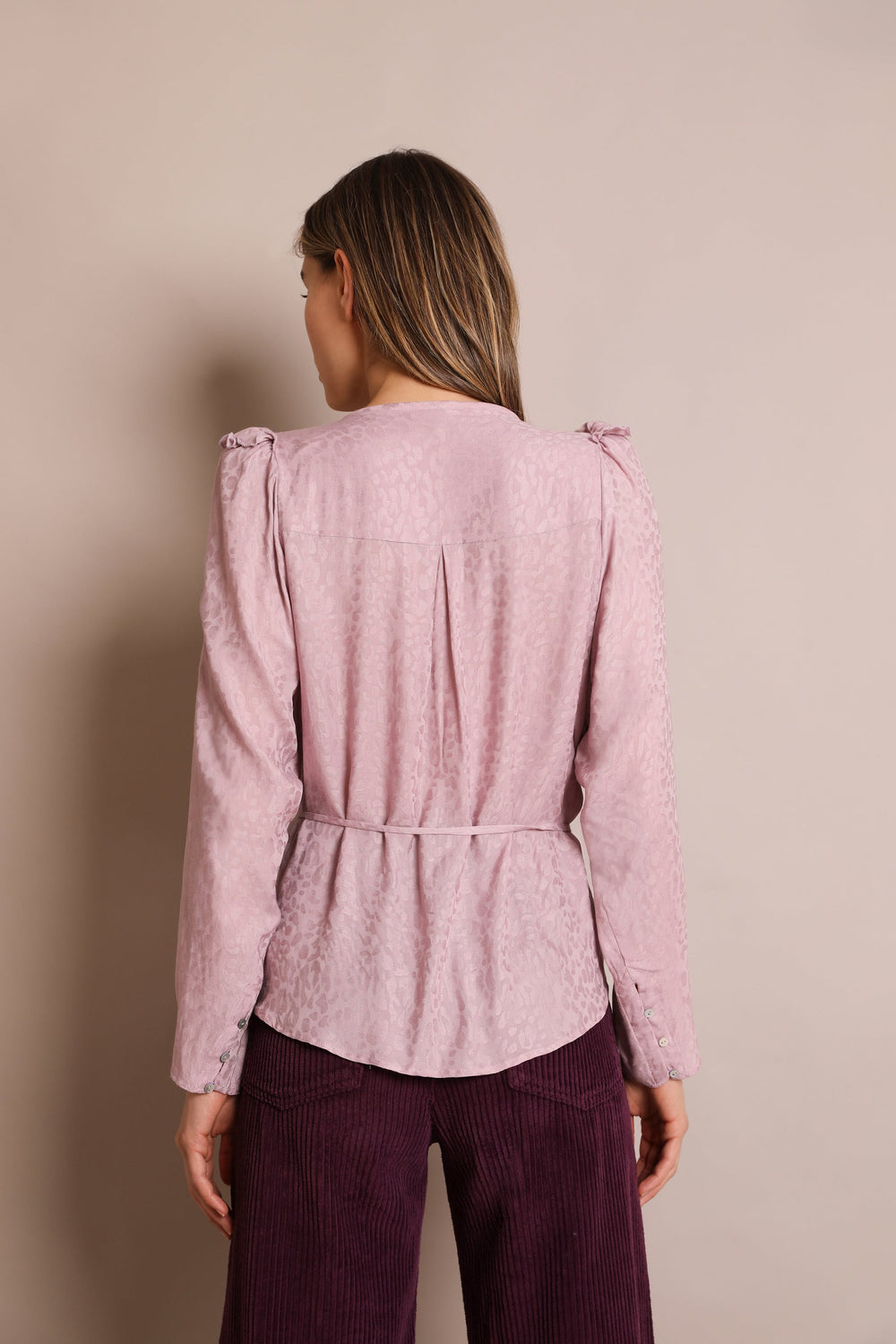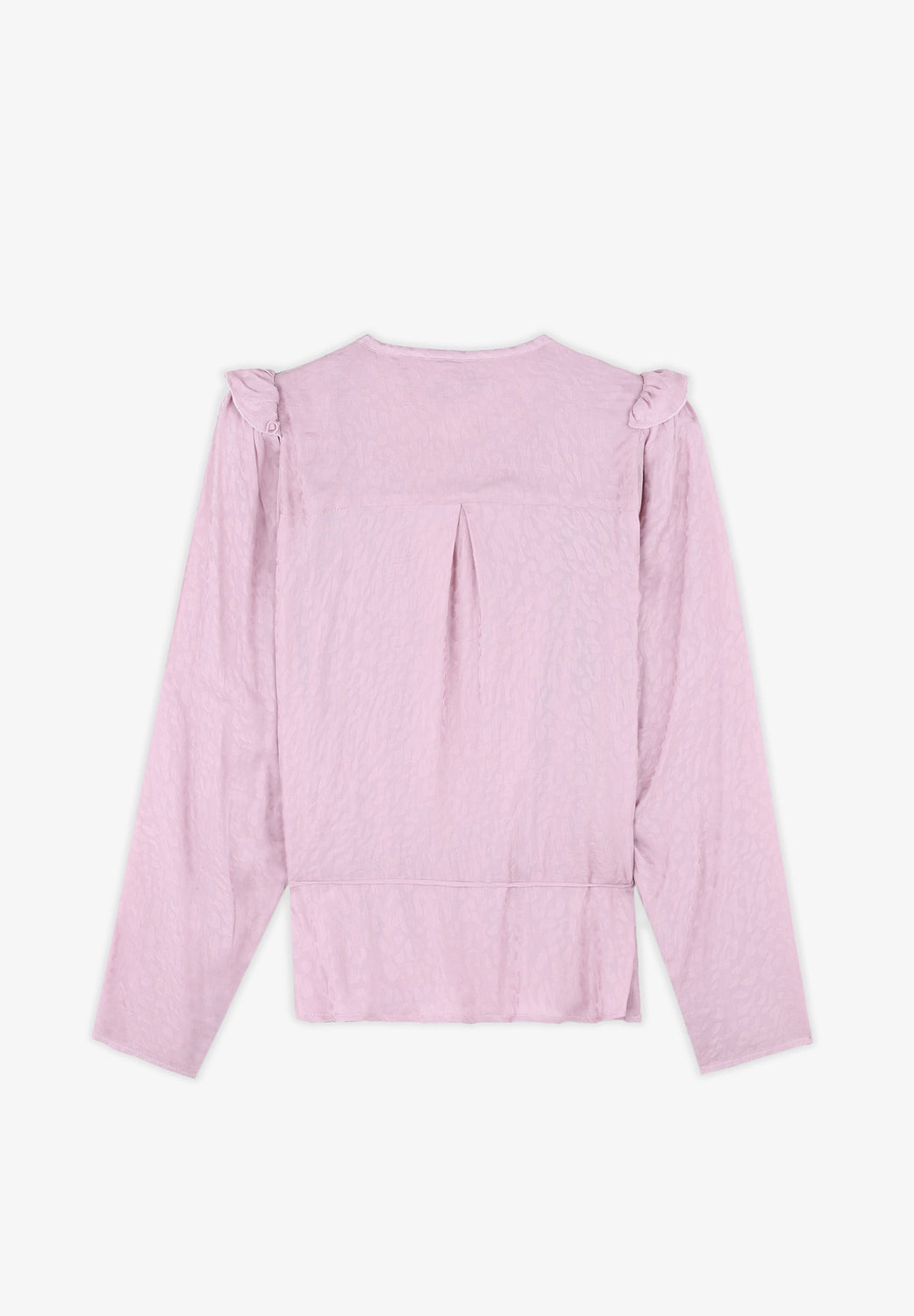 Blusa com estampado jacquard de animal confecionada em tecido fluido. Corte Regular Fit com laçada na cintura, gola com decote em bico e manga comprida acabada em botões. Pormenor de mini folho nos ombros.