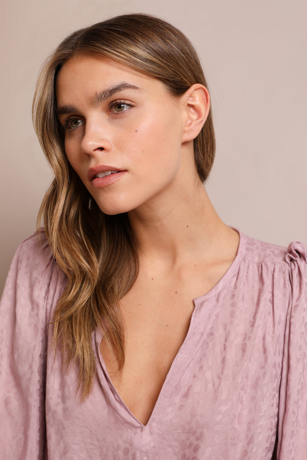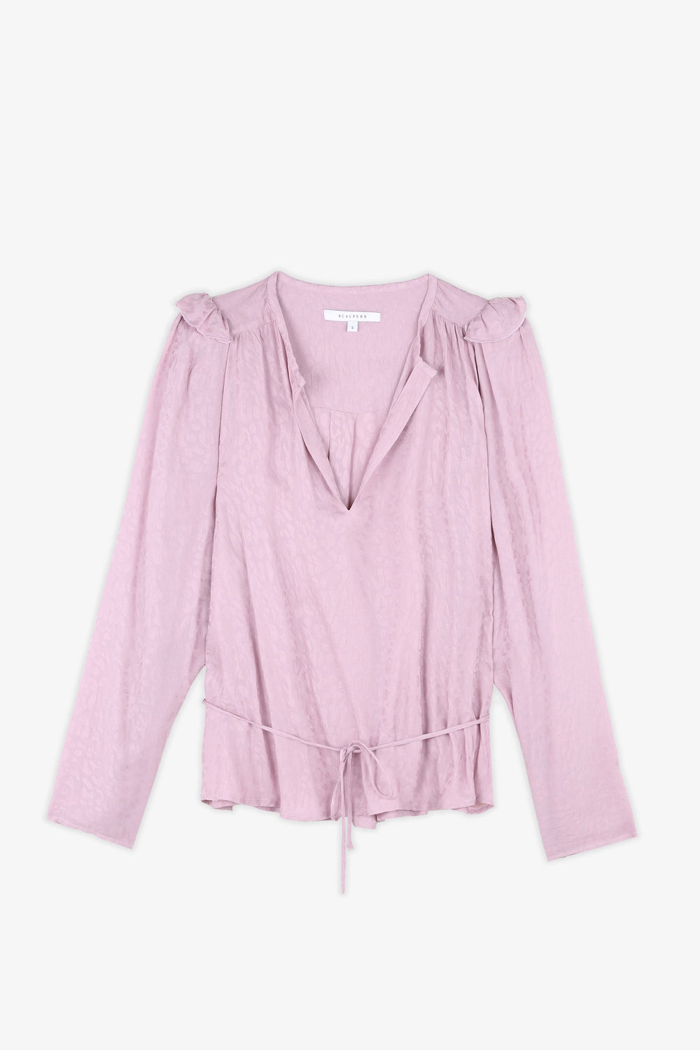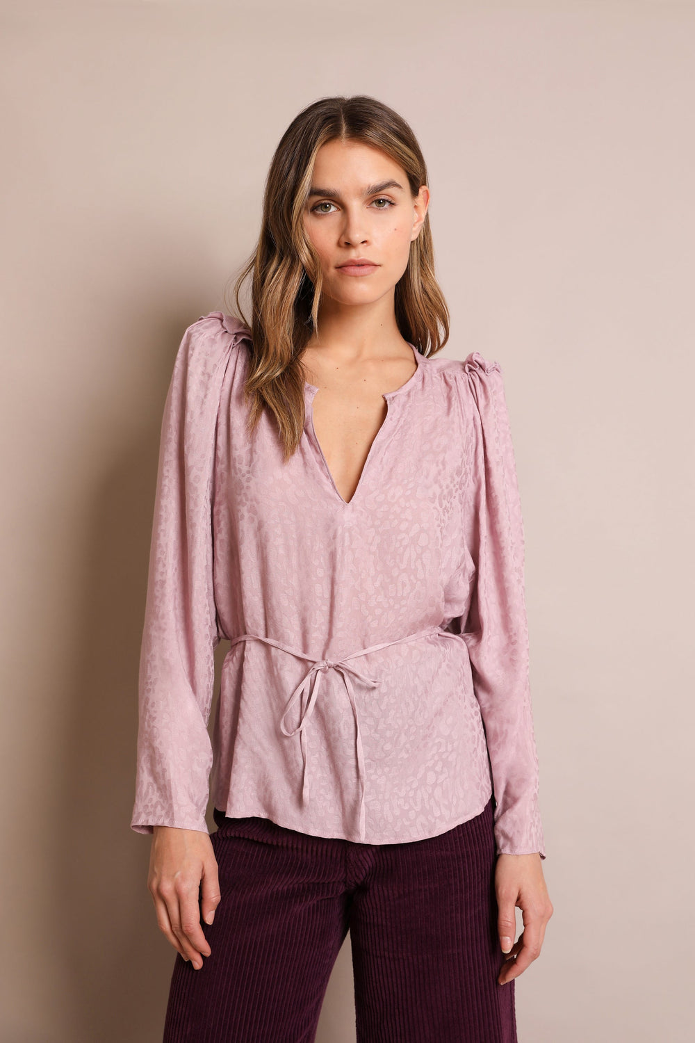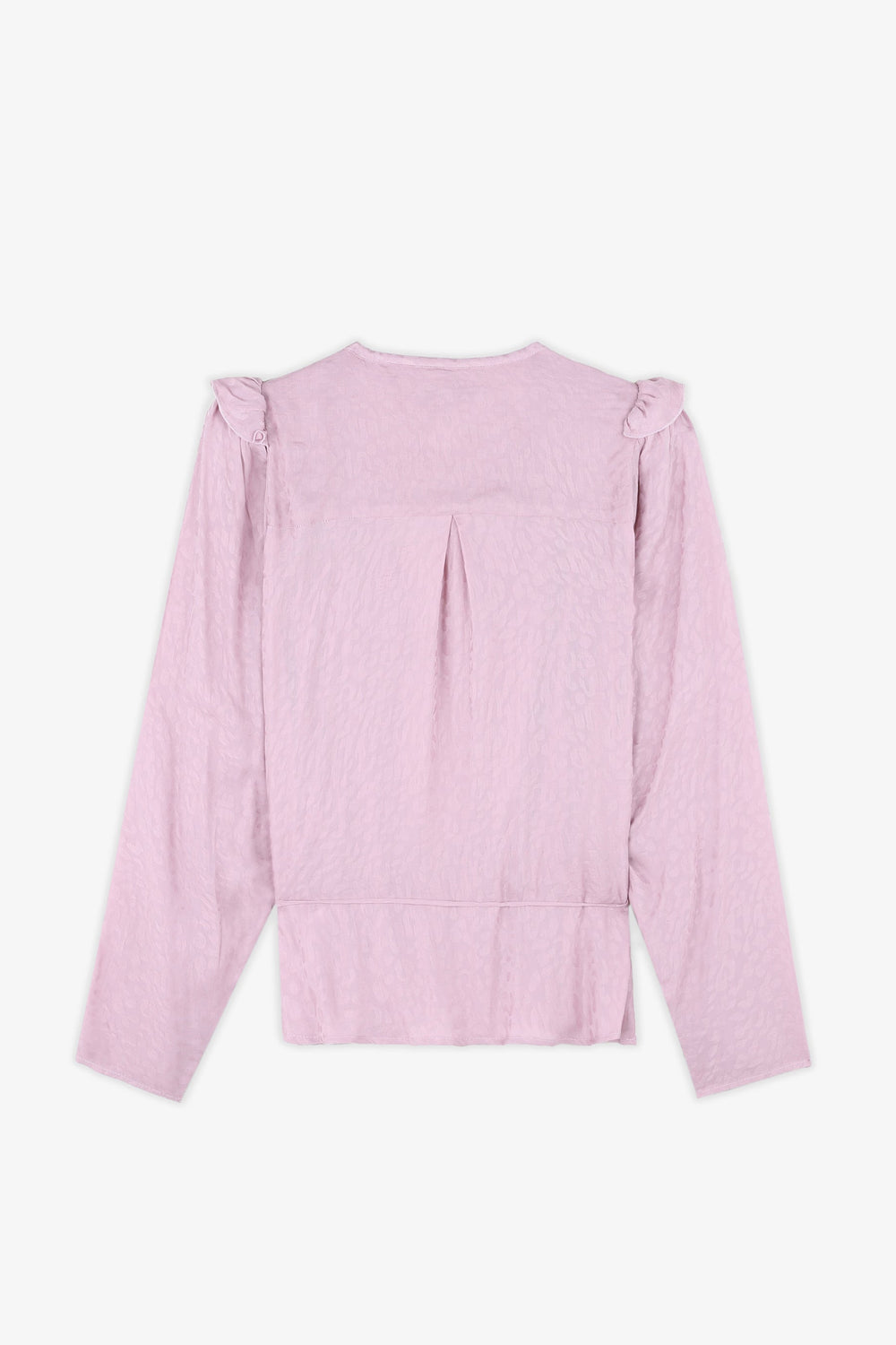 Blusa com estampado jacquard de animal confecionada em tecido fluido. Corte Regular Fit com laçada na cintura, gola com decote em bico e manga comprida acabada em botões. Pormenor de mini folho nos ombros.