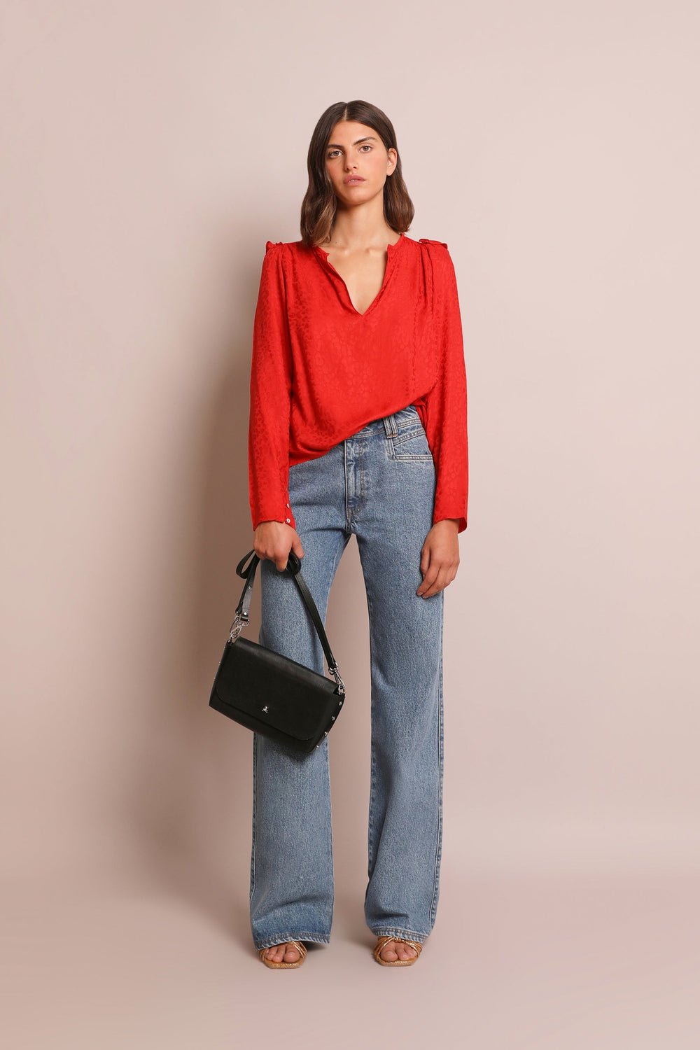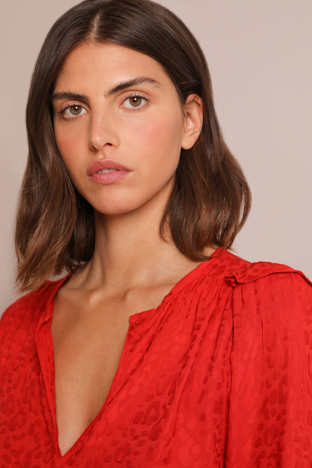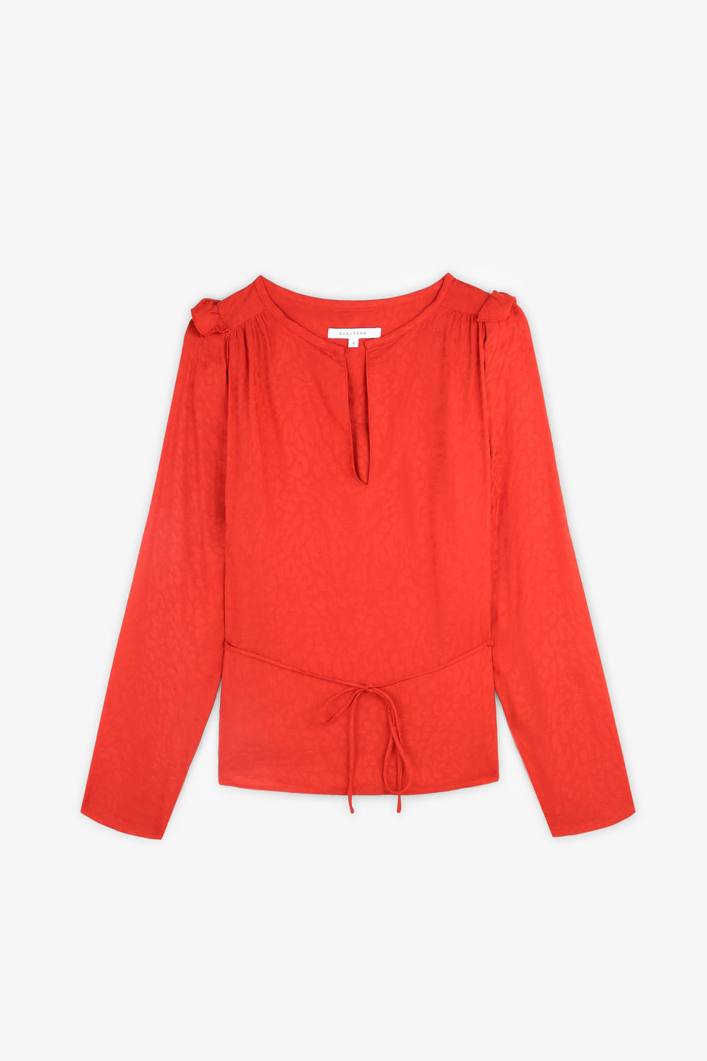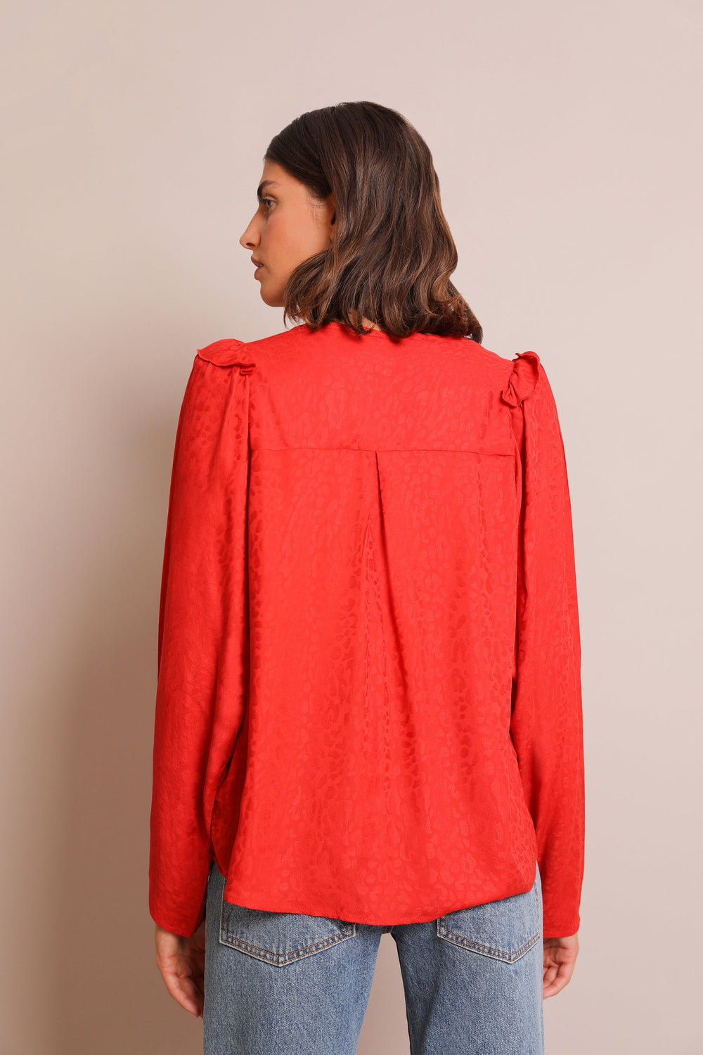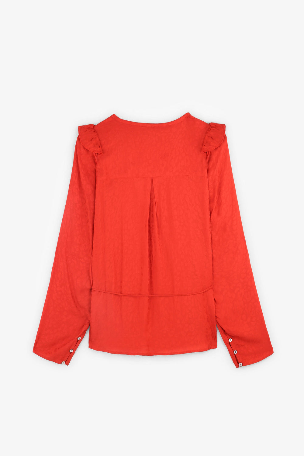 Blusa com estampado jacquard de animal confecionada em tecido fluido. Corte Regular Fit com laçada na cintura, gola com decote em bico e manga comprida acabada em botões. Pormenor de mini folho nos ombros.