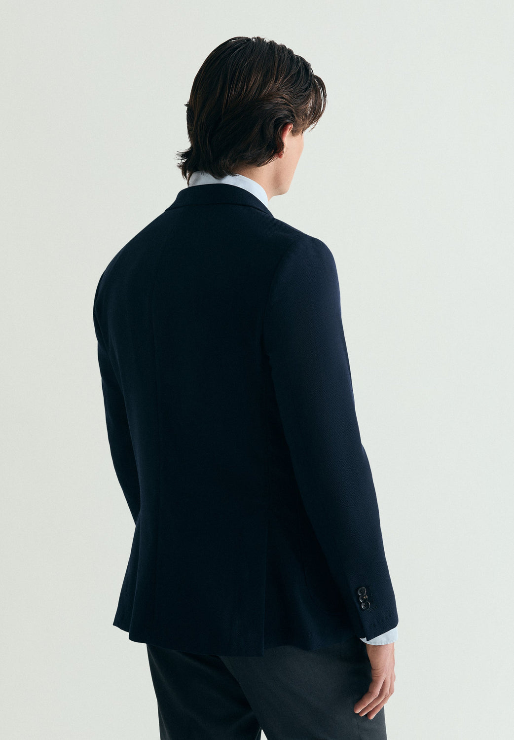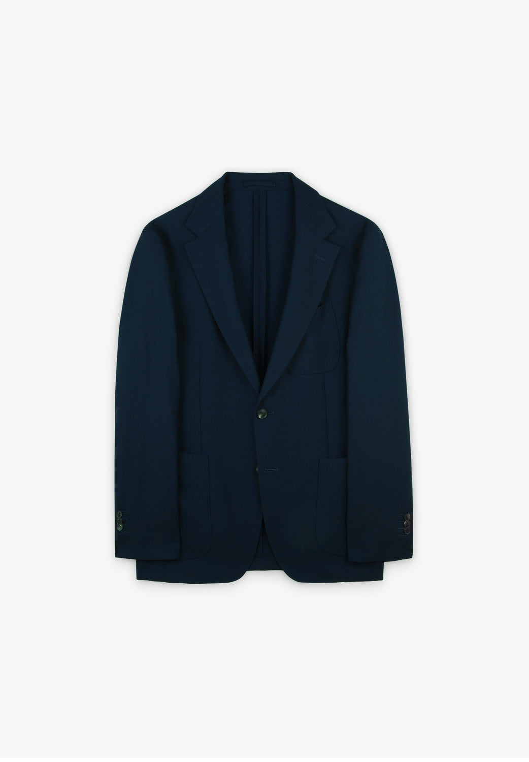 Blazer liso azul marinho confecionado em tecido de lã da casa Marzotto. Com um corte Regular Fit e uma gola com lapela entalhada. Aperta com botões, não tem forro e tem bolsos de remendo. A manga tem uma ombreira semi-ajustada e termina em ilhós práticos.