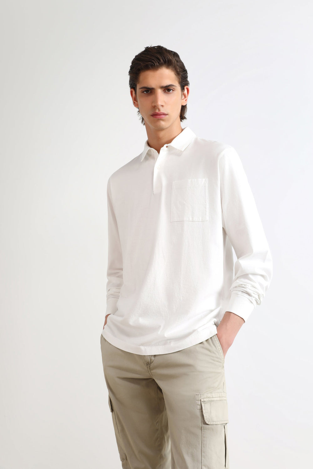 Camisa polo com tecido tipo t-shirt e bolso.