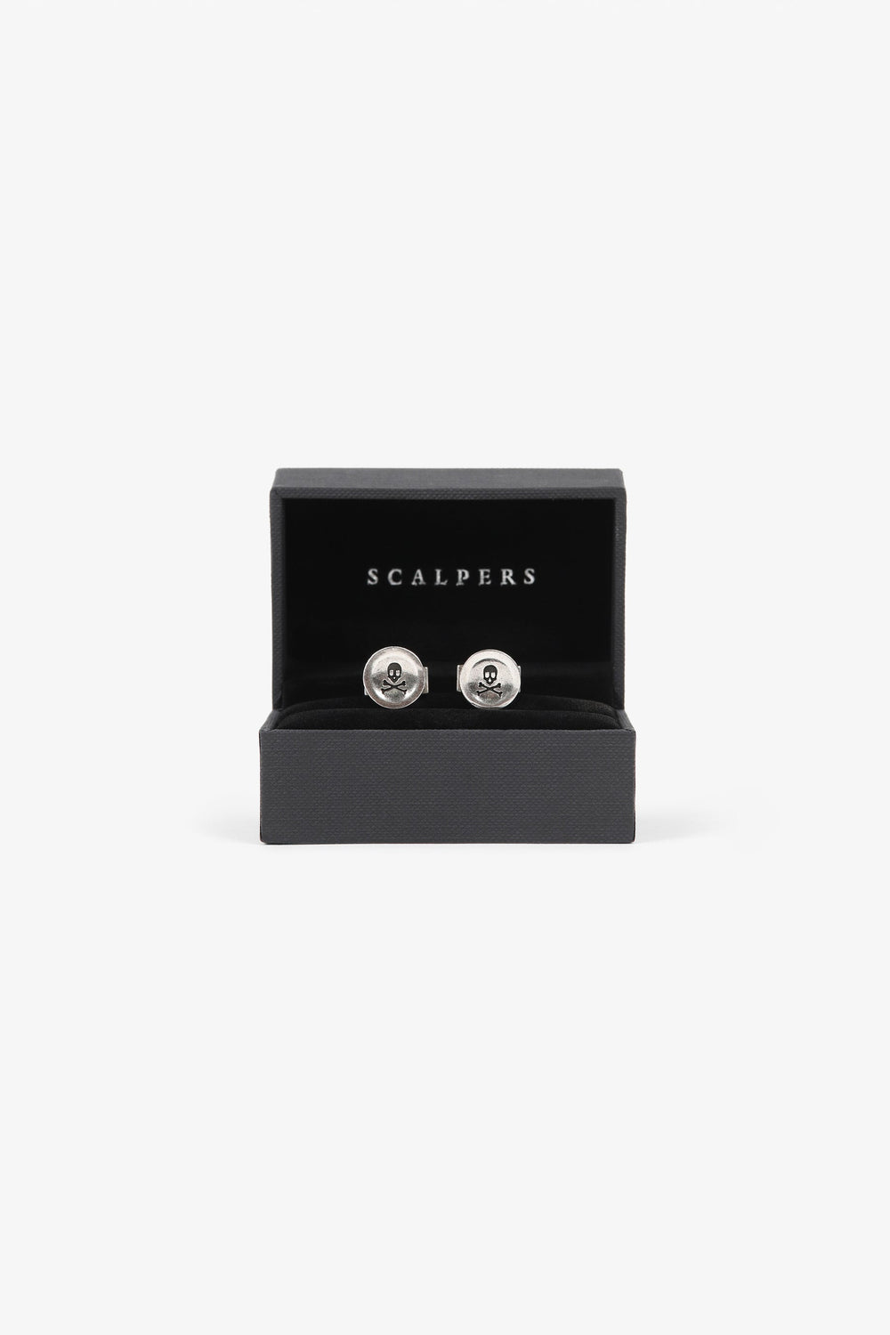 Botões de punho redondos em tom de prata com o crânio gravado na frente e Scalpers nas costas.