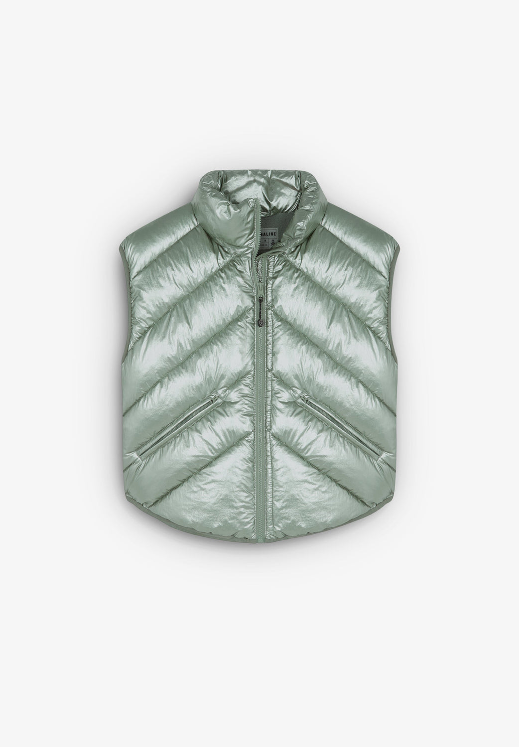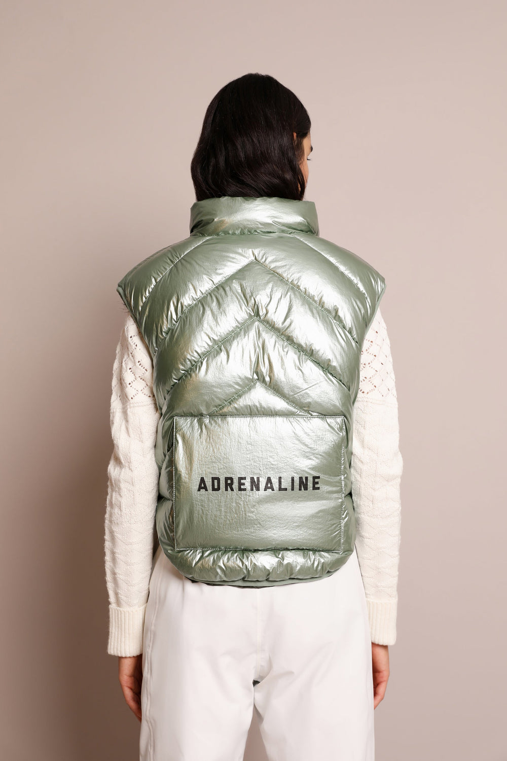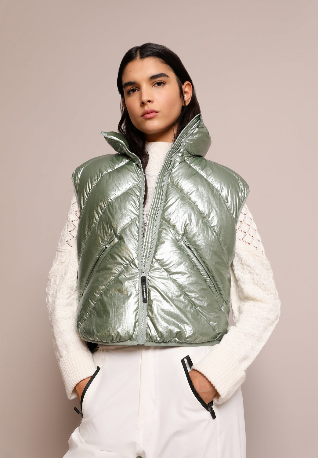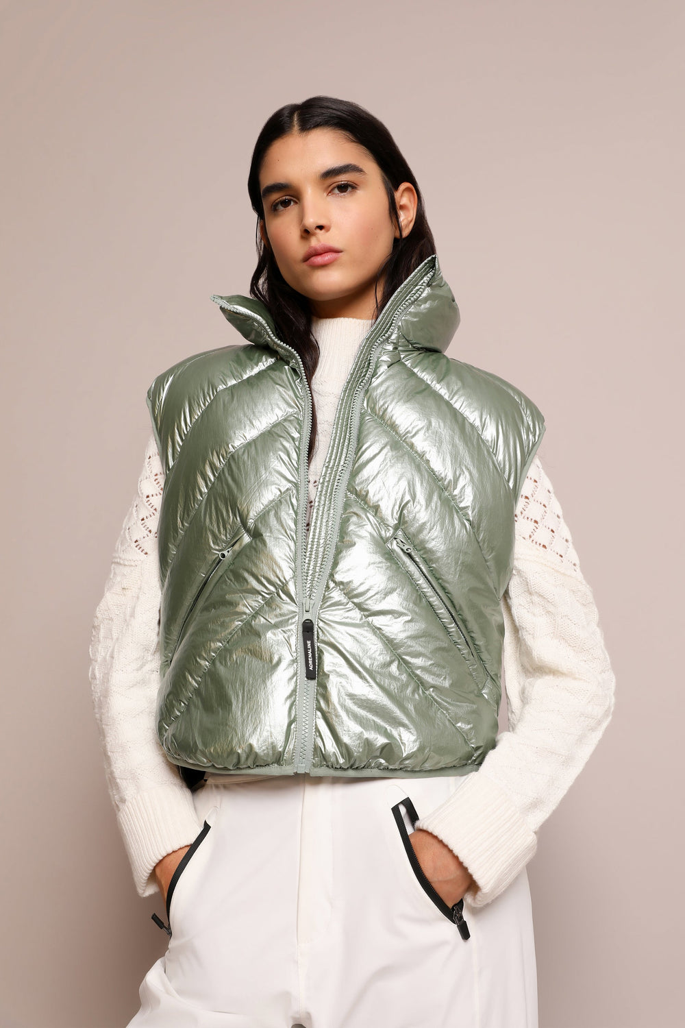 Colete metálico feito de tecido técnico. Encaixe regular, gola alta. Fecho de correr. Bolsos laterais. Detalhe do painel traseiro com logótipo.