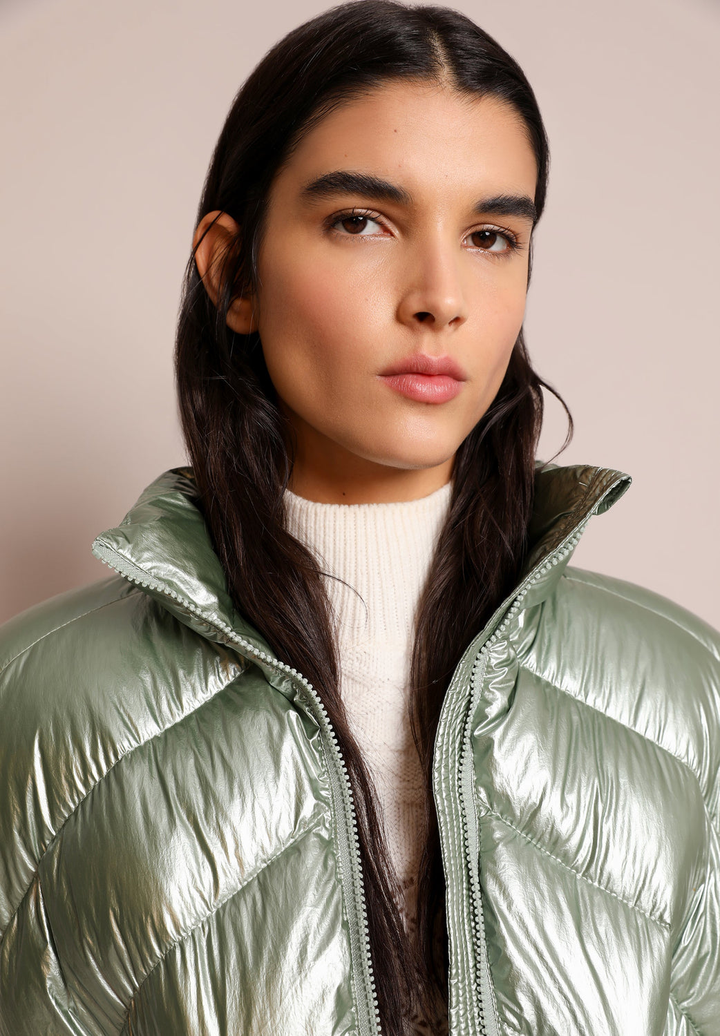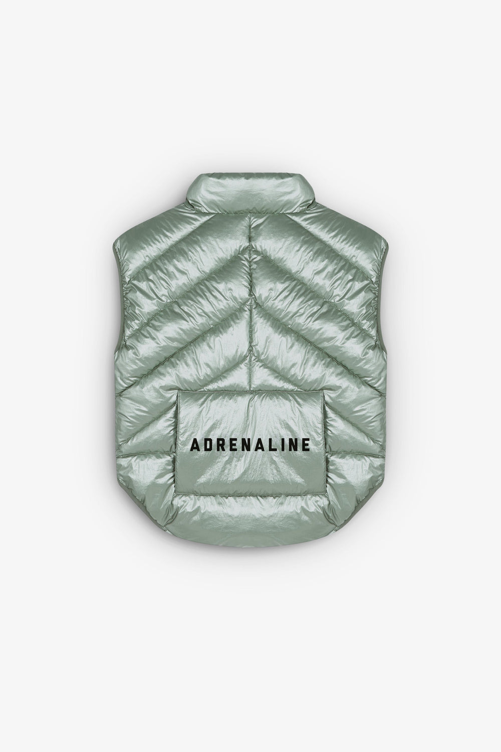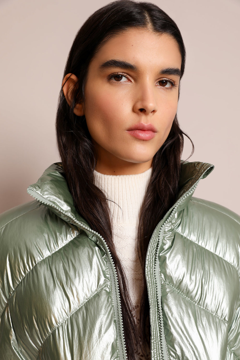 Colete metálico feito de tecido técnico. Encaixe regular, gola alta. Fecho de correr. Bolsos laterais. Detalhe do painel traseiro com logótipo.