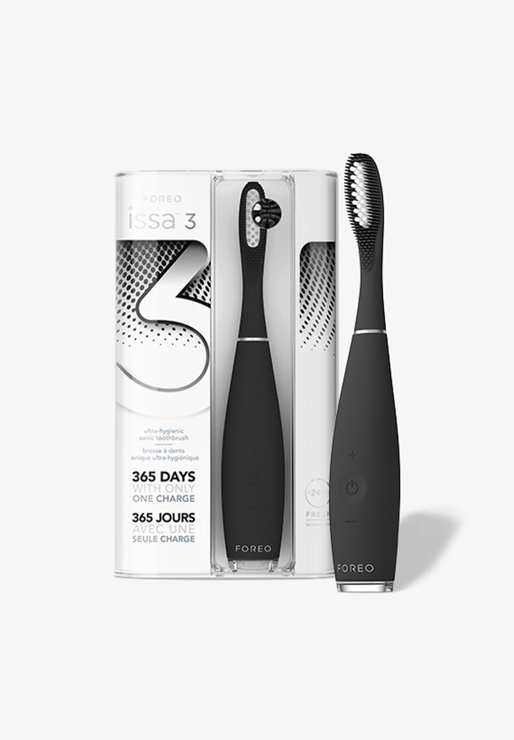 Escova de dentes ISSA 3 da Foreo é o maior avanço dos últimos 70 anos na higiene bucal. A sua cabeça de escovagem híbrida combina silicone, que massaja com suavidade as gengivas, com polímero PBT, que elimina a acumulação de placa. Além disso, o seu limpador de língua e boca mantém a tua boca limpa durante mais tempo.
