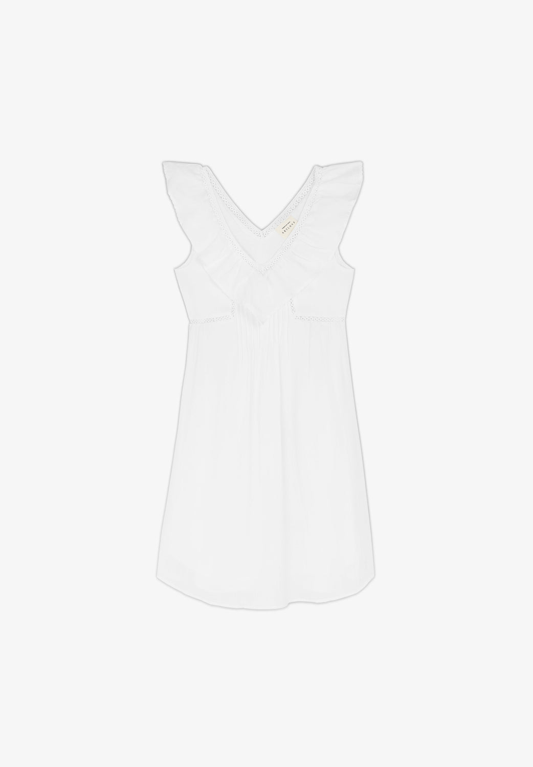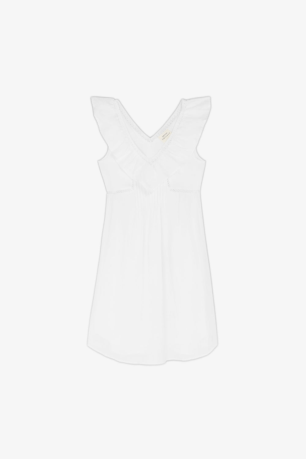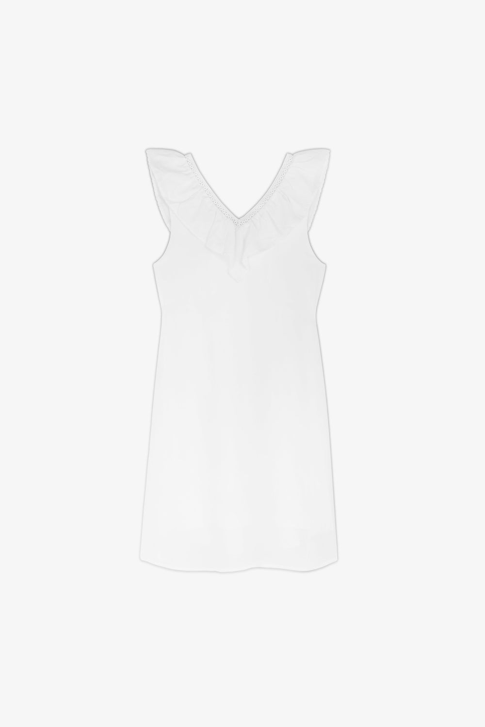 - Cuello en V con volantes.