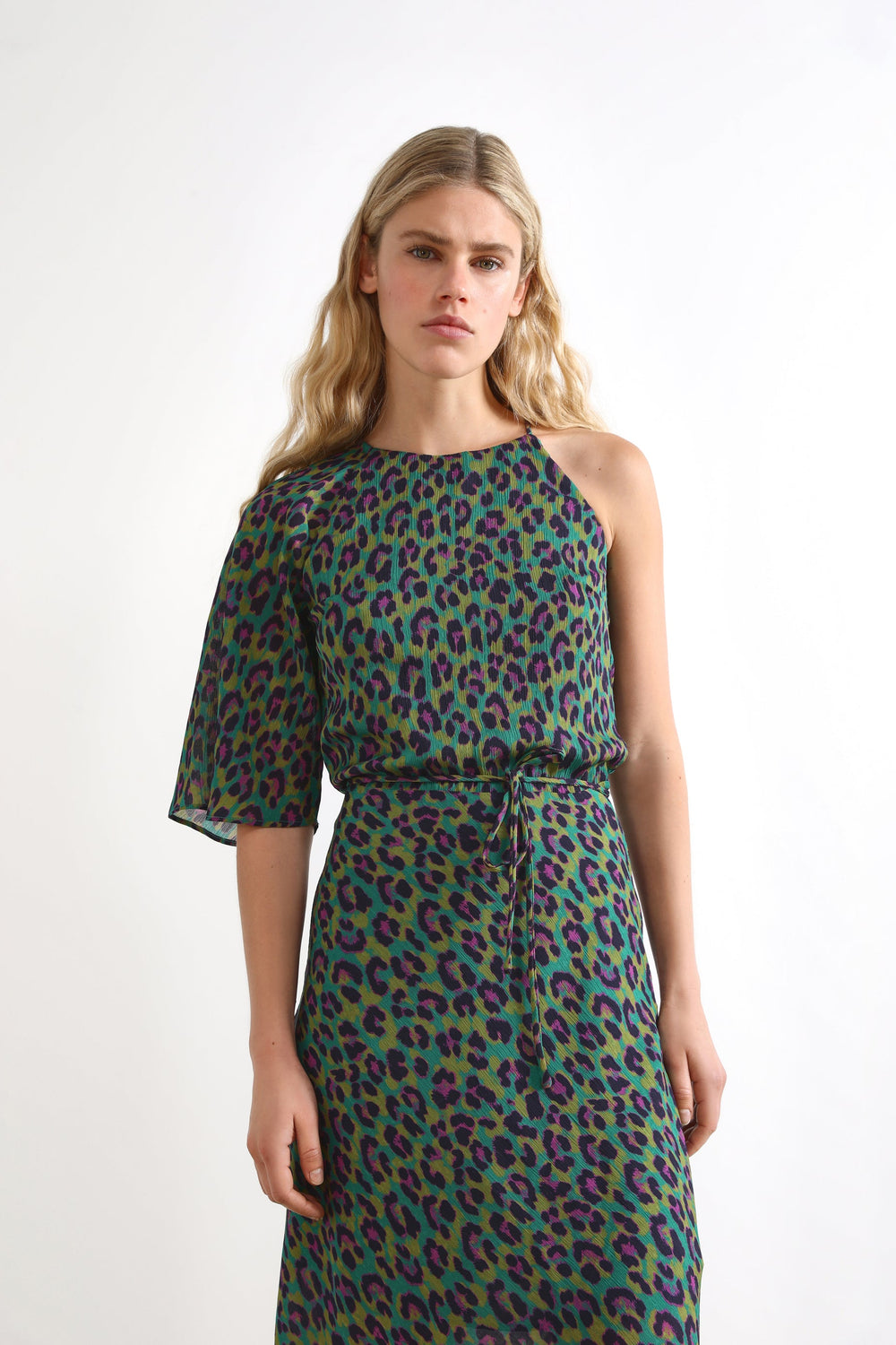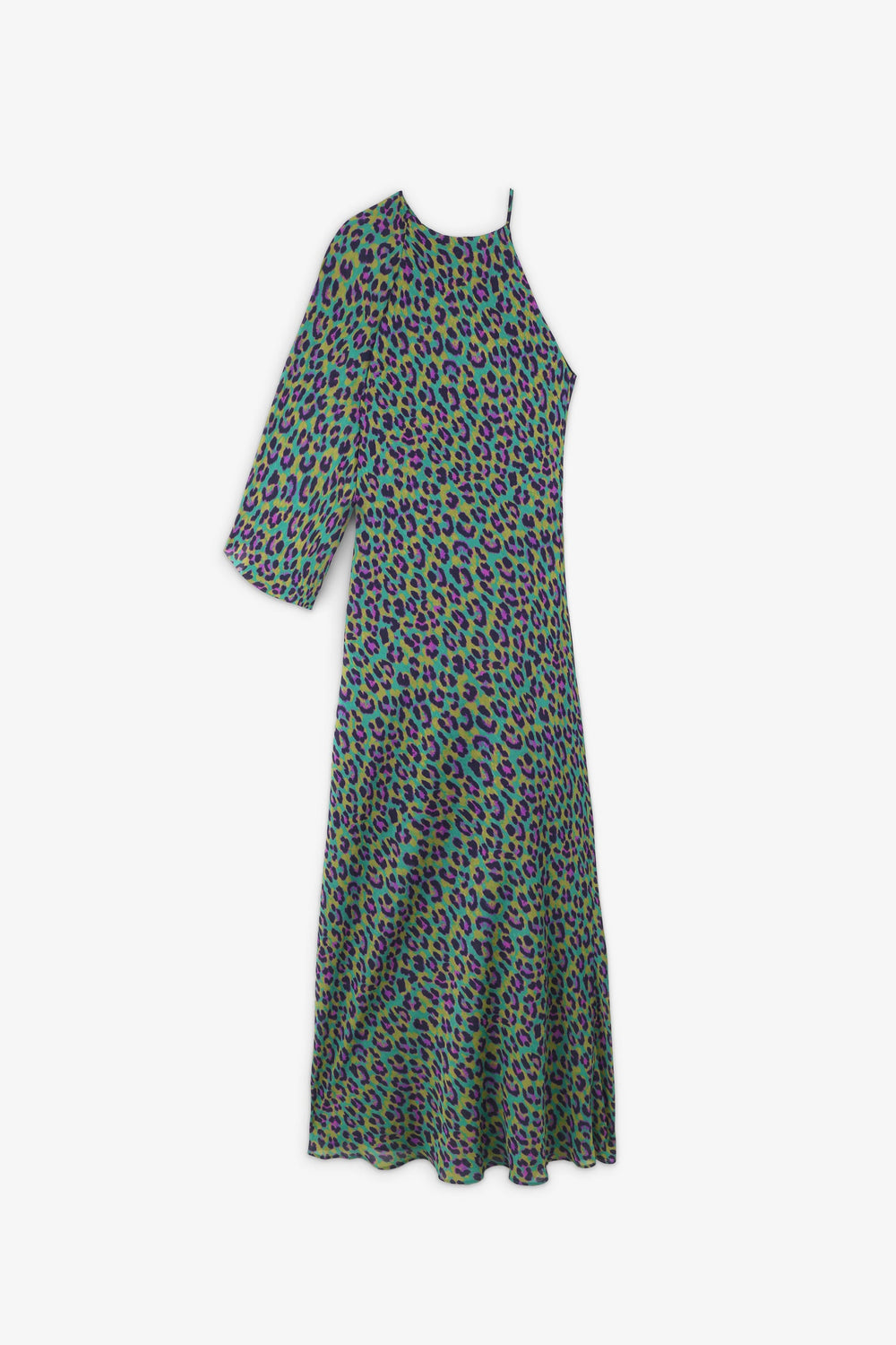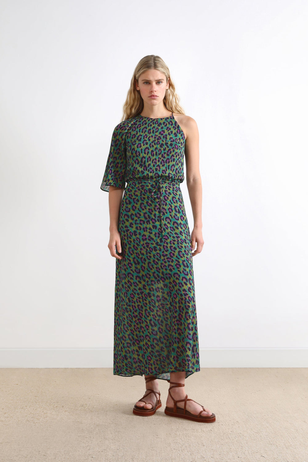 VESTIDO COMPRIDO ASSIMÉTRICO COM ESTAMPADO ANIMAL