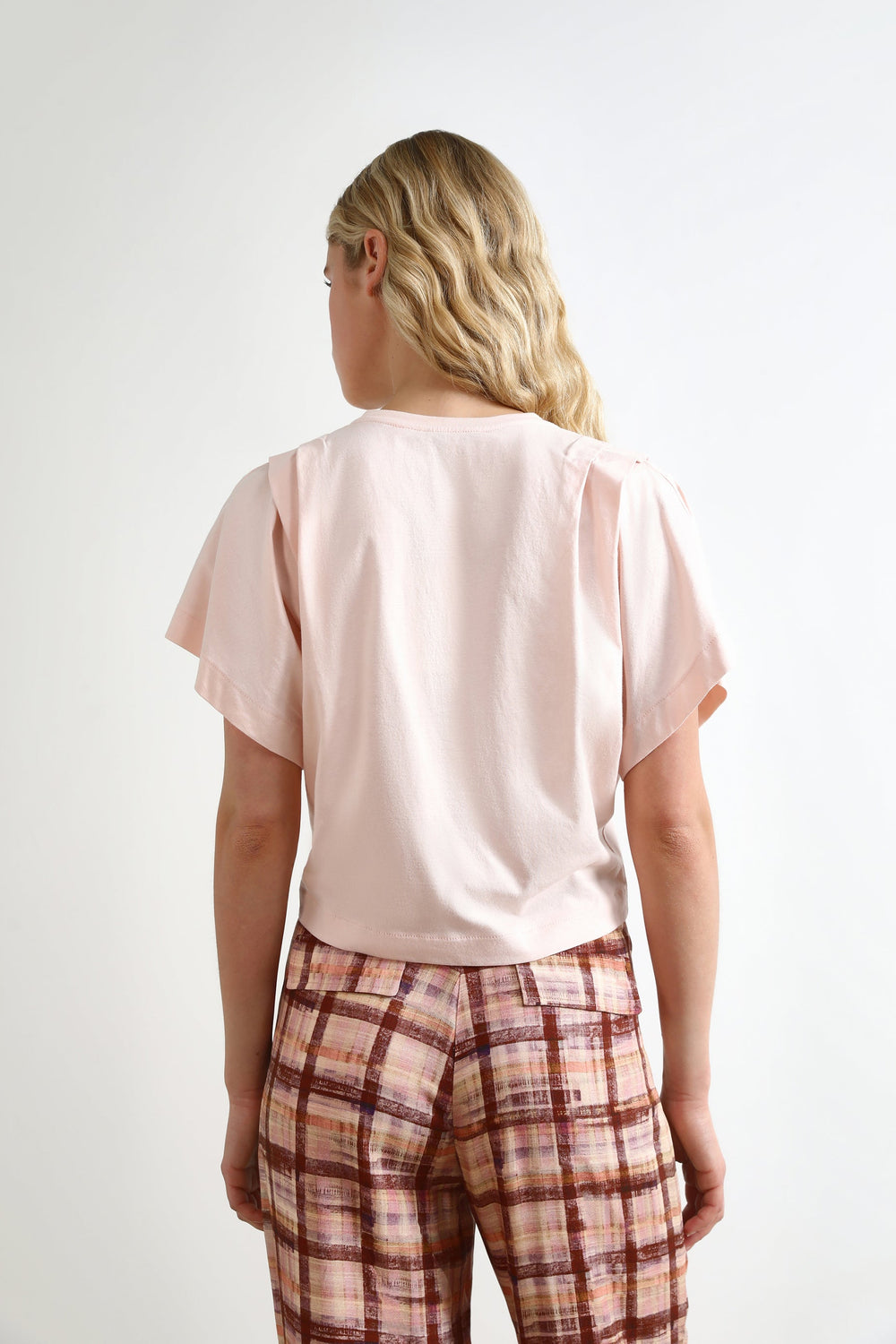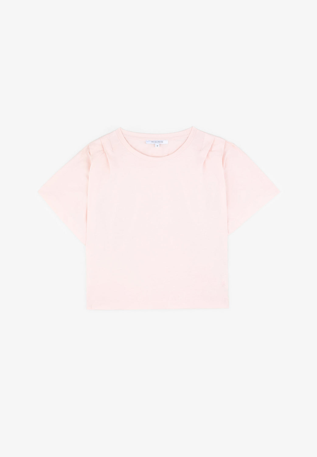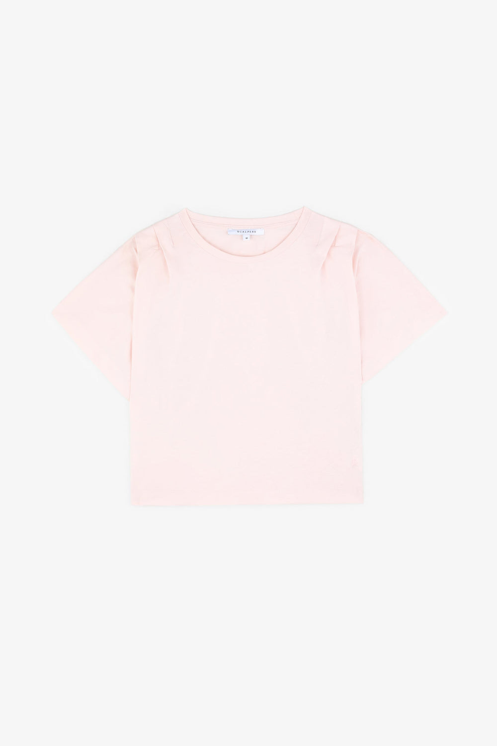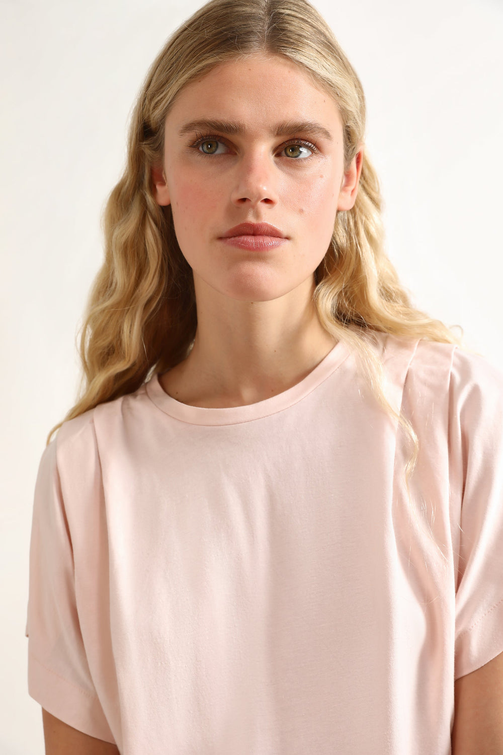 T-shirt lisa com pormenor de ombro ligeiramente subido.