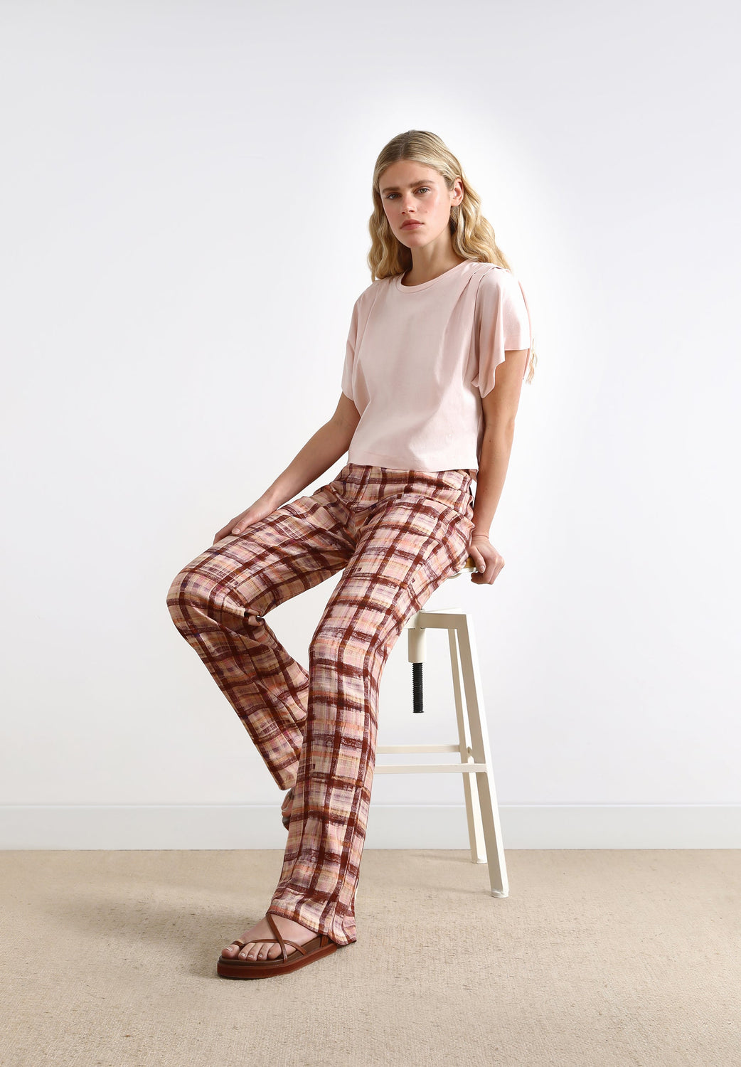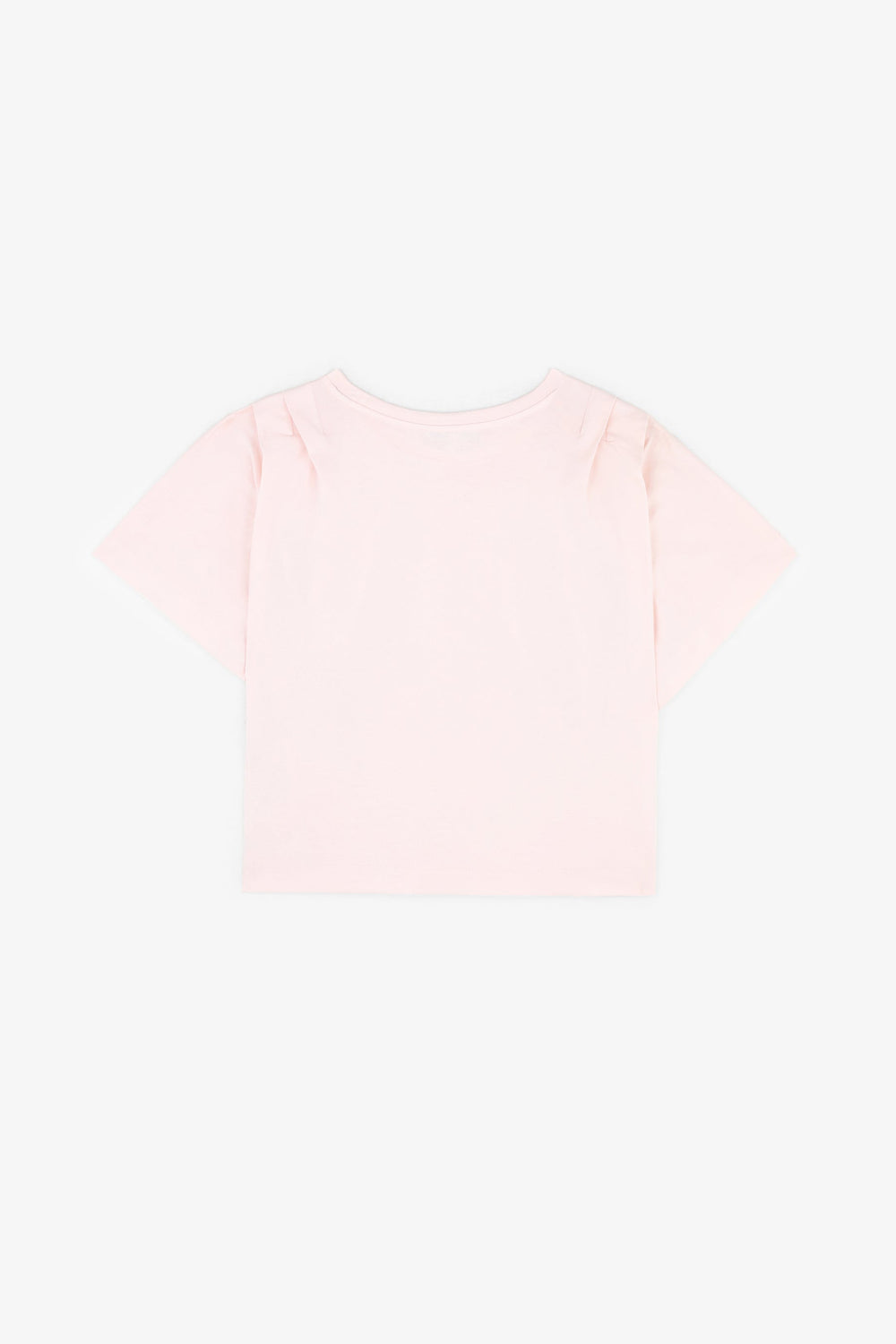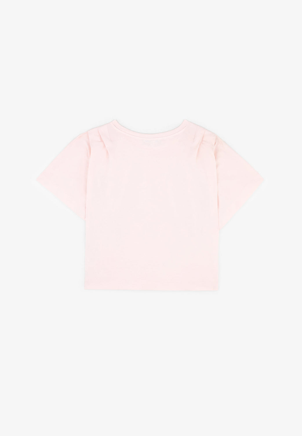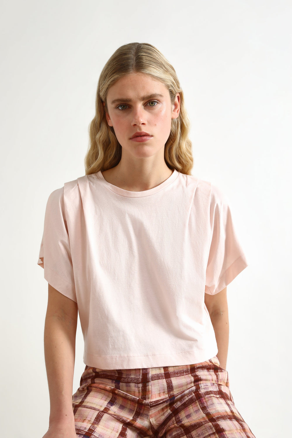 T-shirt lisa com pormenor de ombro ligeiramente subido.