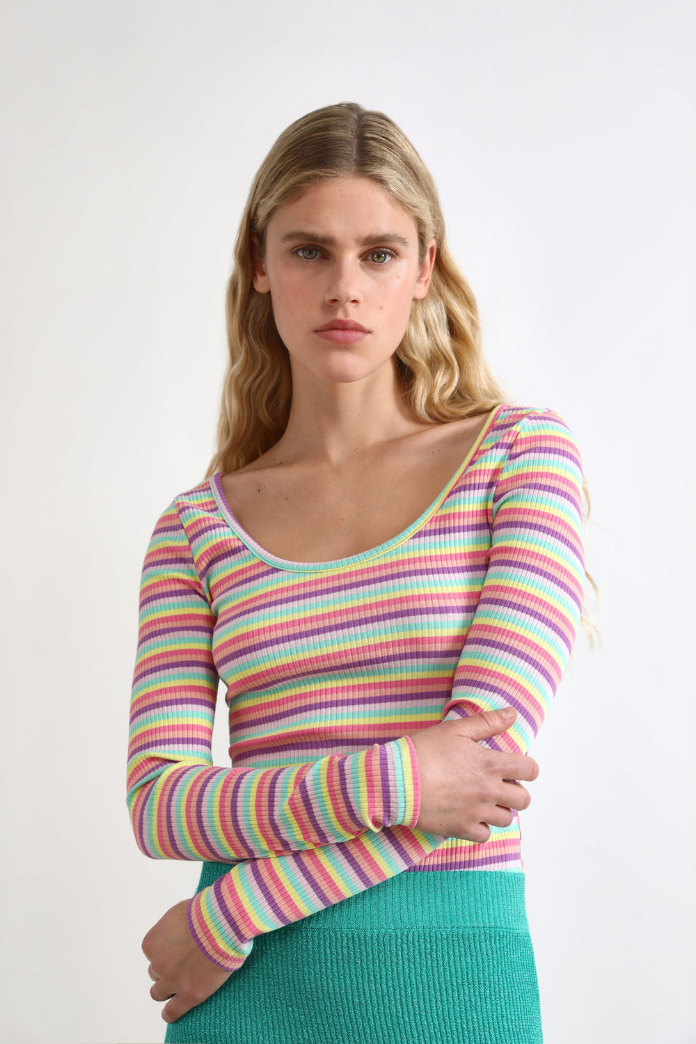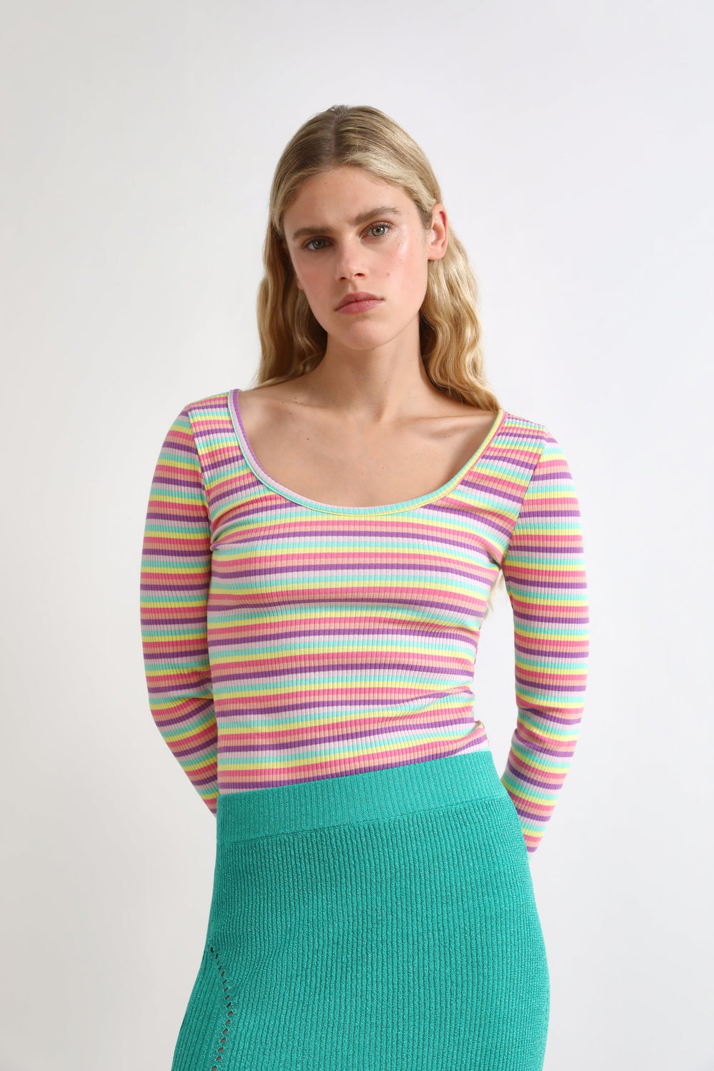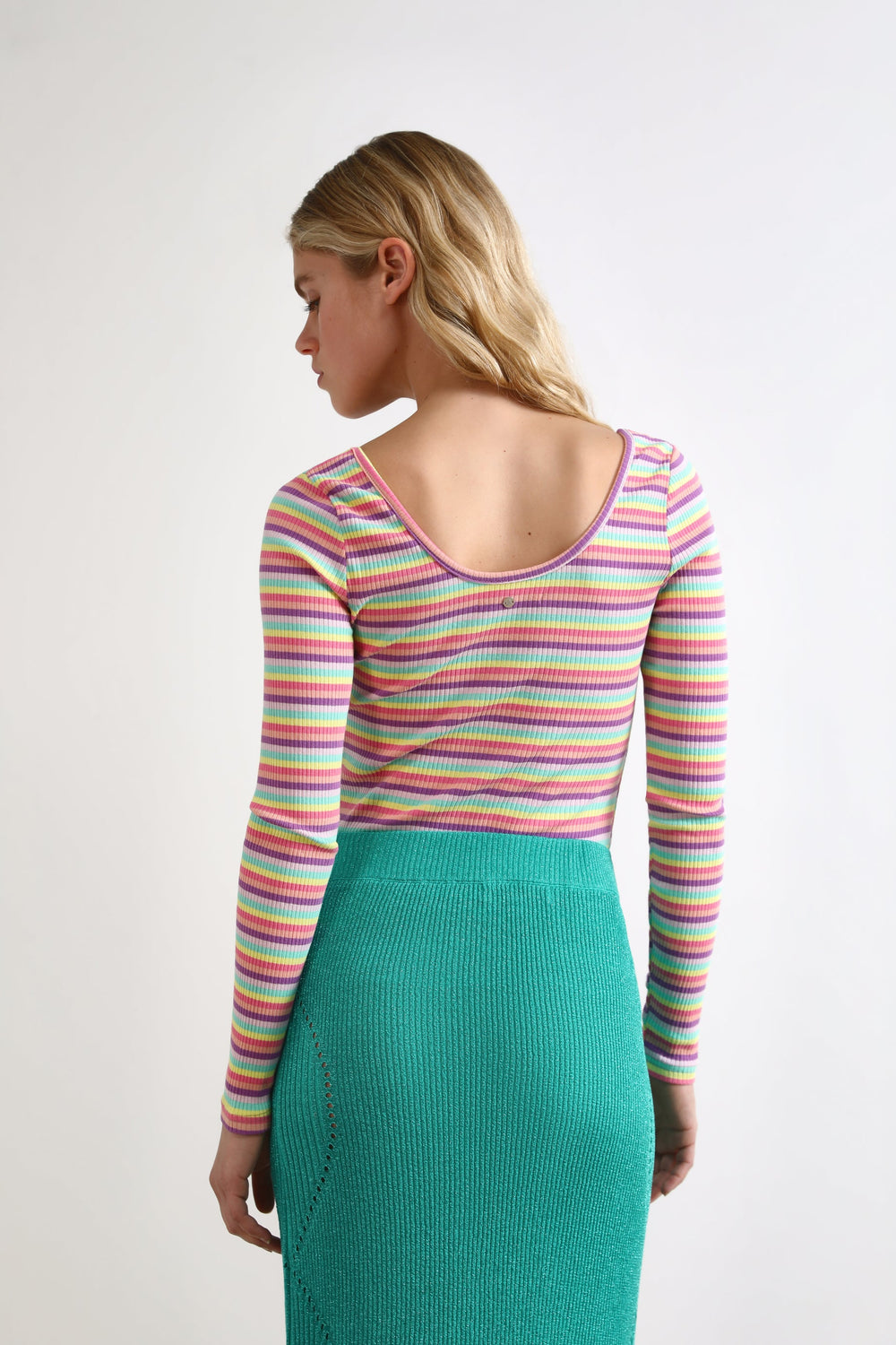 T-shirt básica com riscas multicolor.