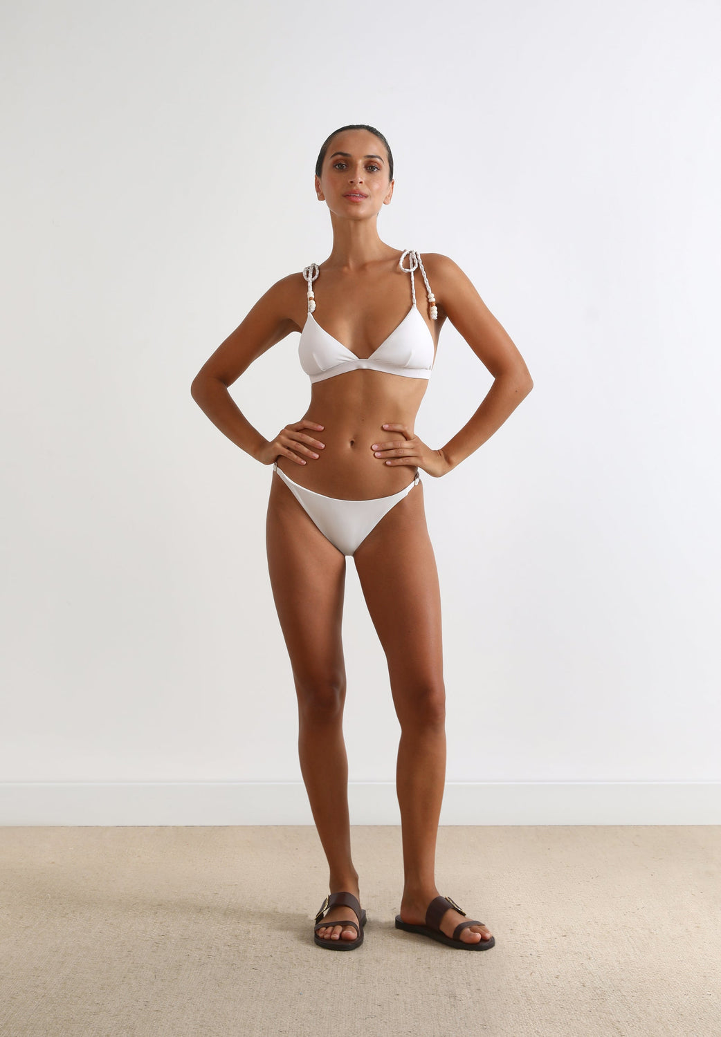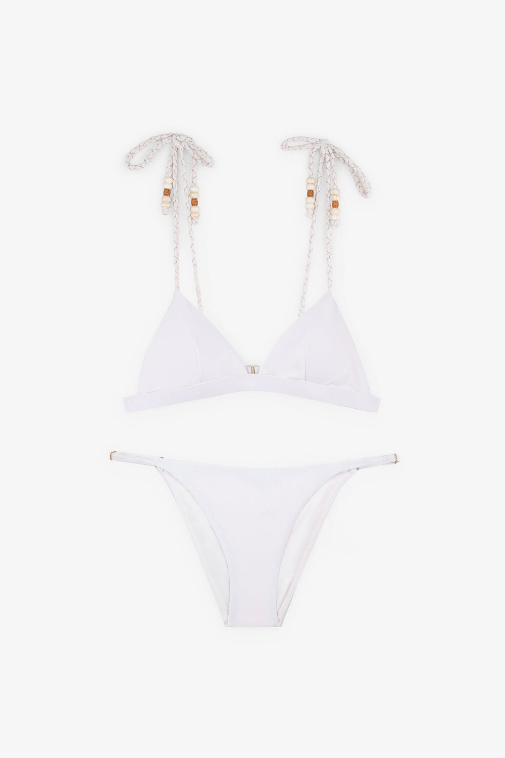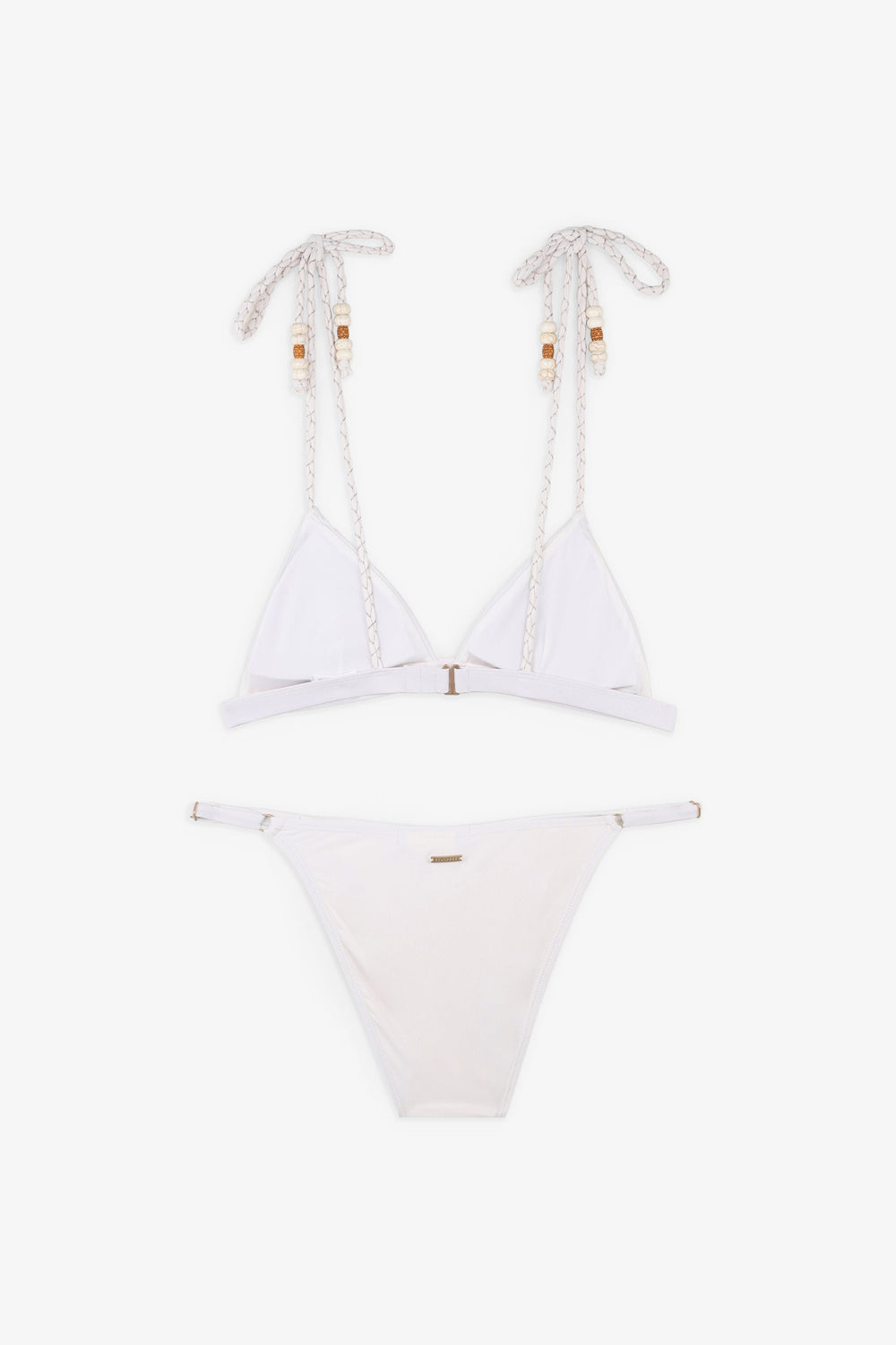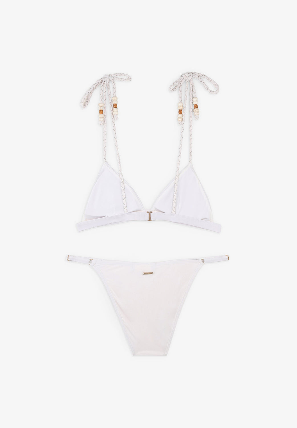 - Parte de cima com fecho traseiro de alfinete, alças com laço terminadas em beading