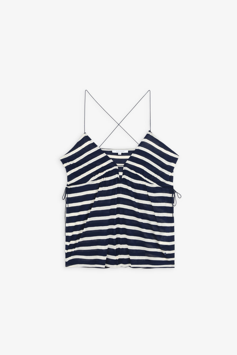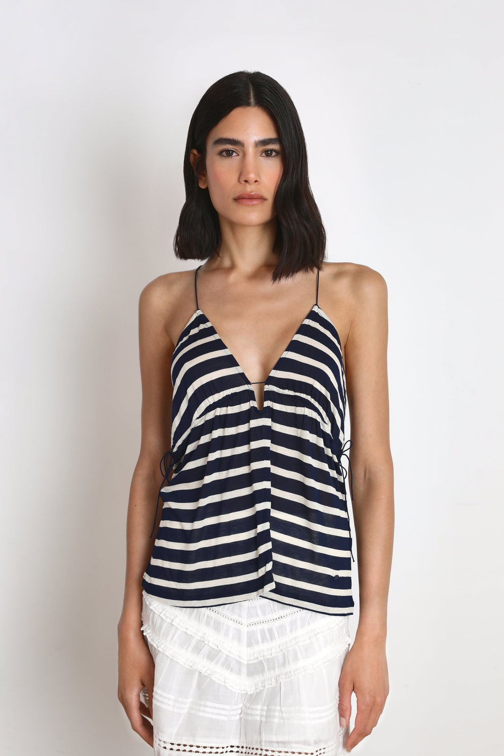 - Laços laterais para ajustar decote