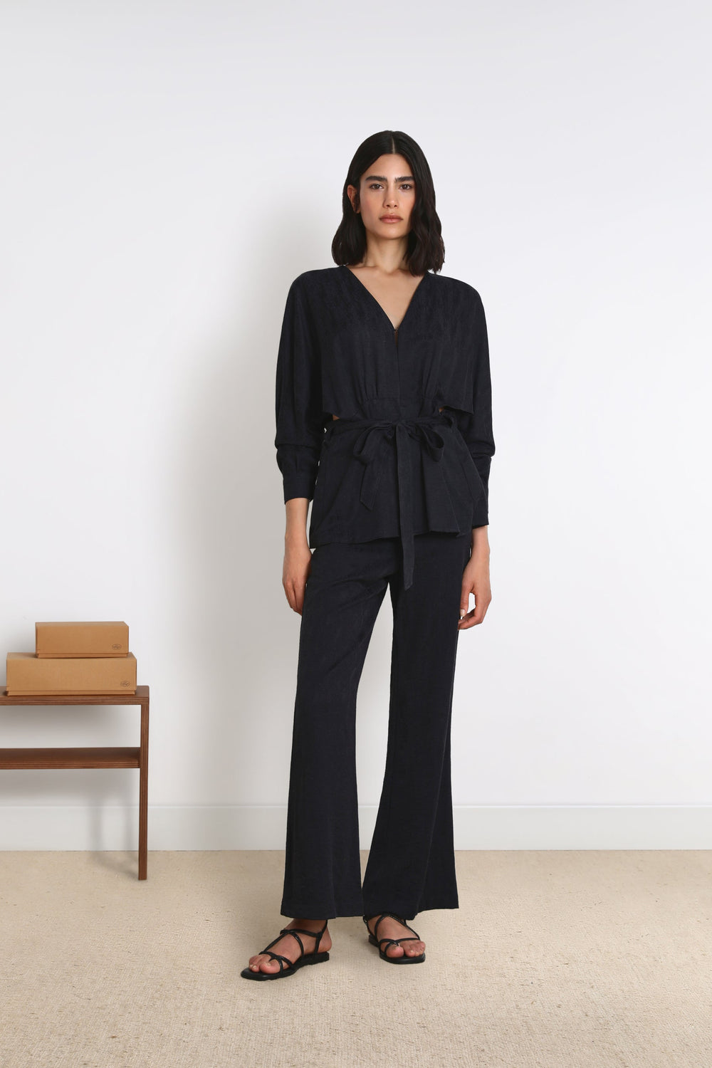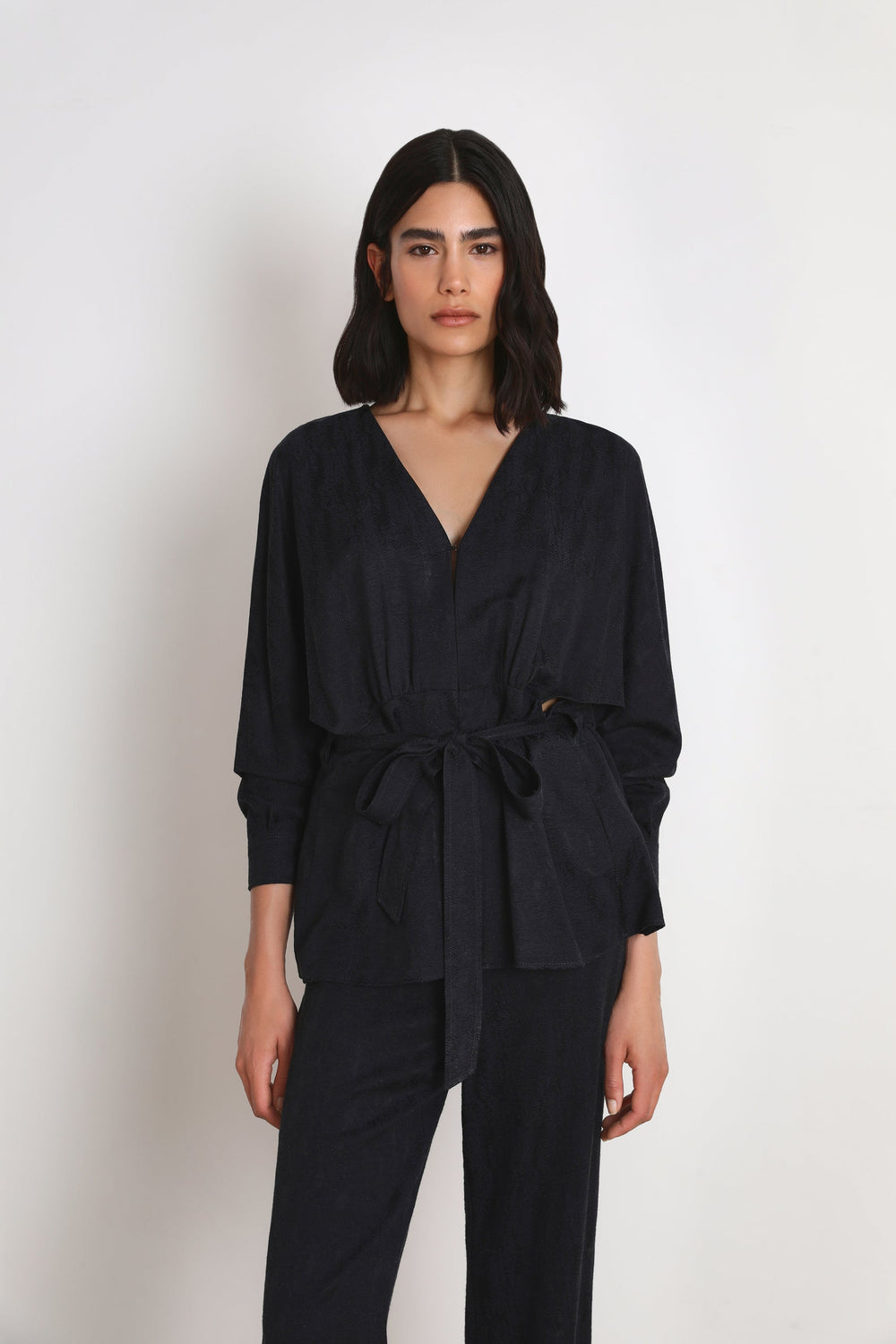 Cafetã fluido em tecido de jacquard.