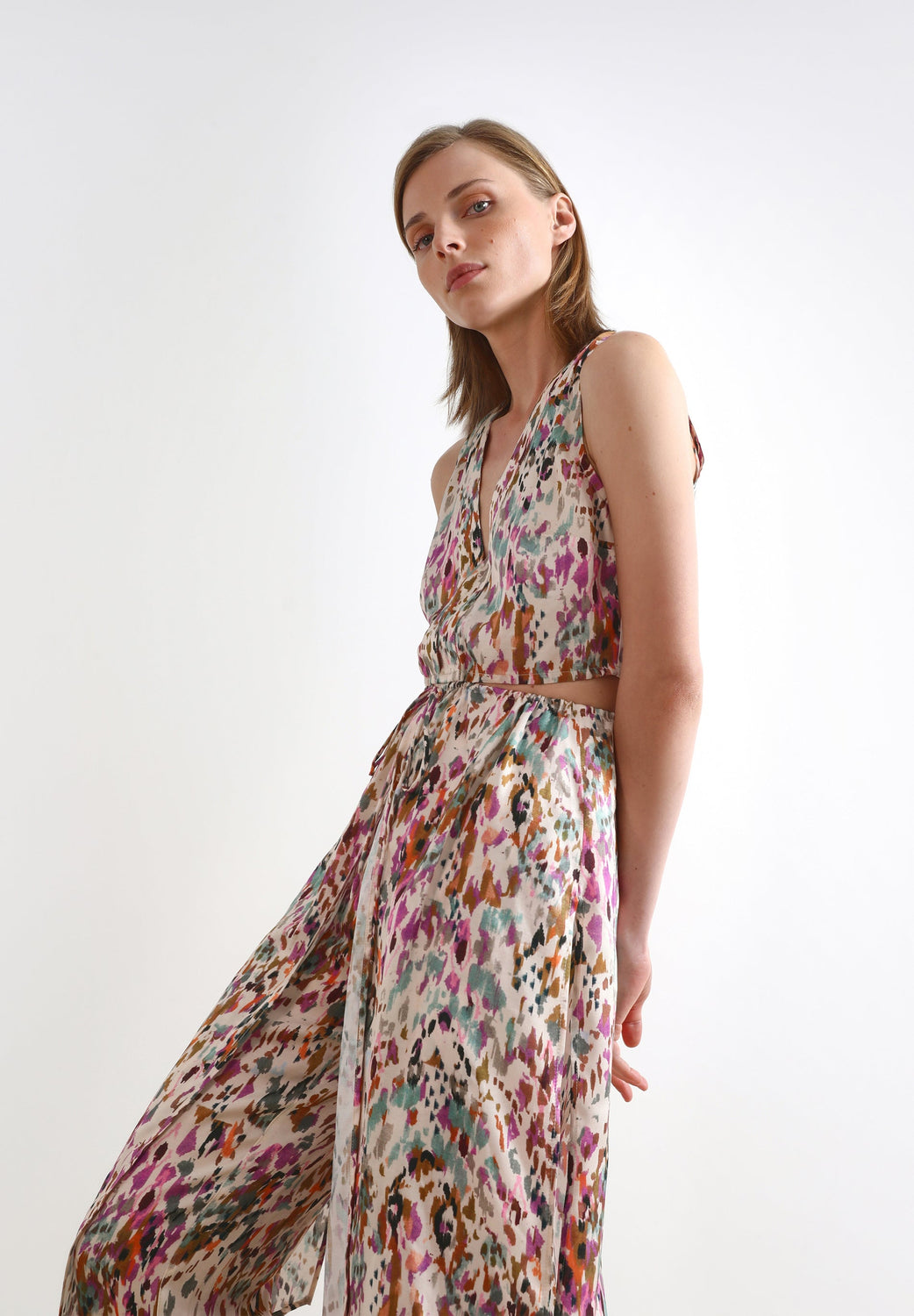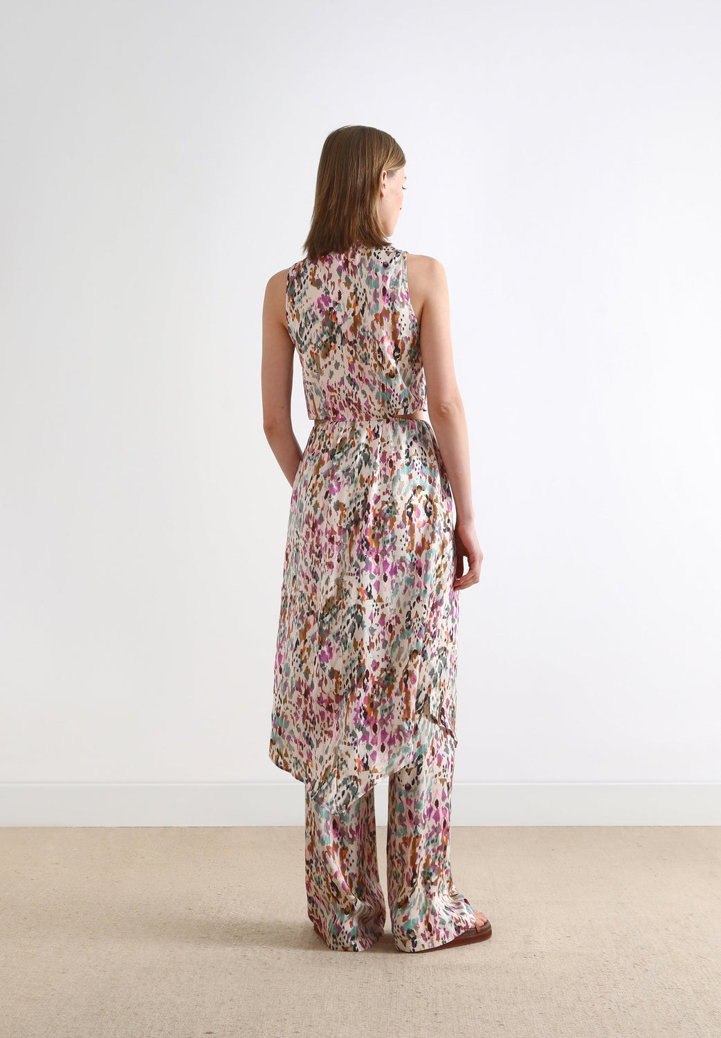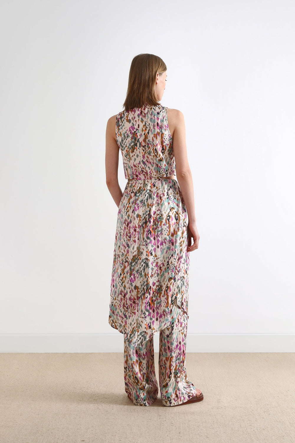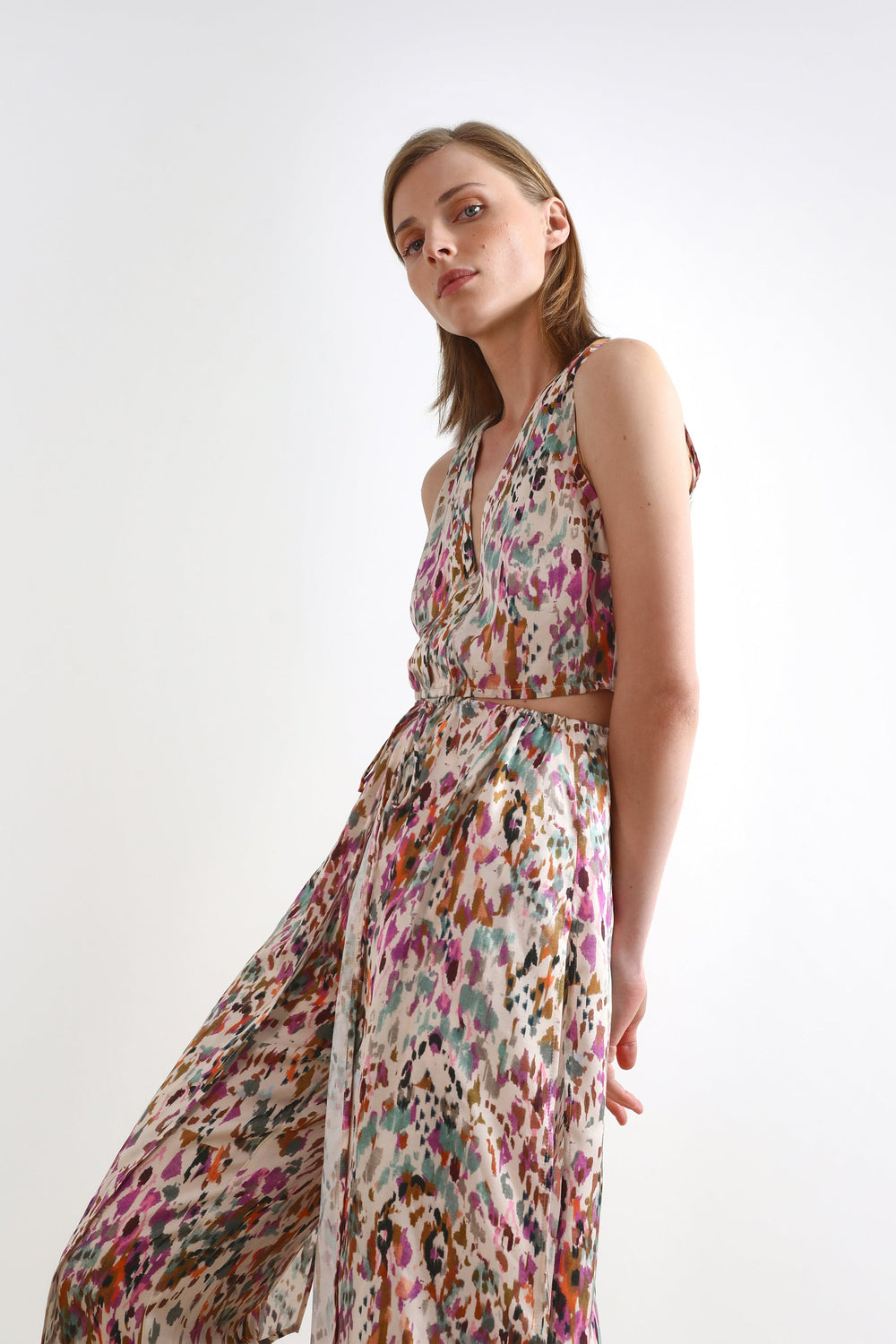 Top comprido com padrão multicolor.