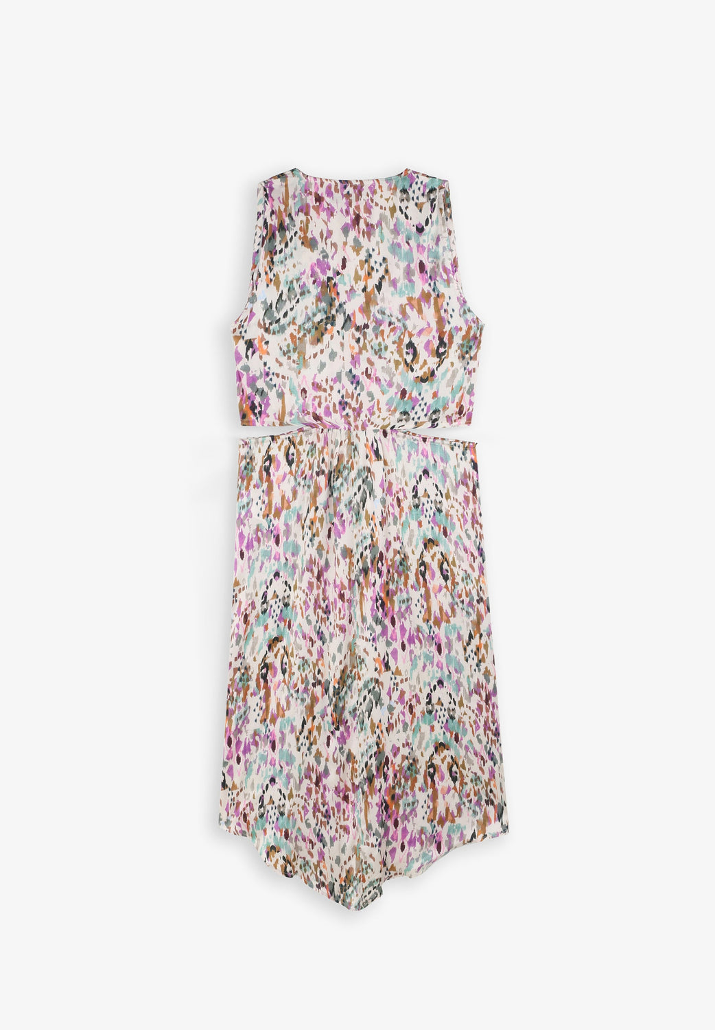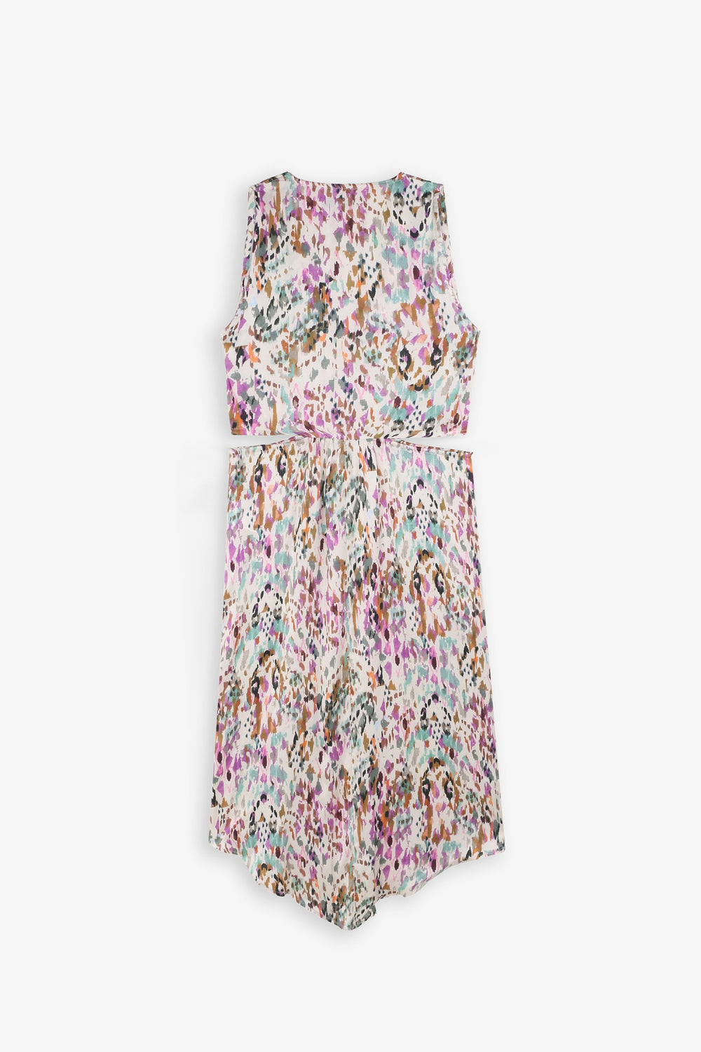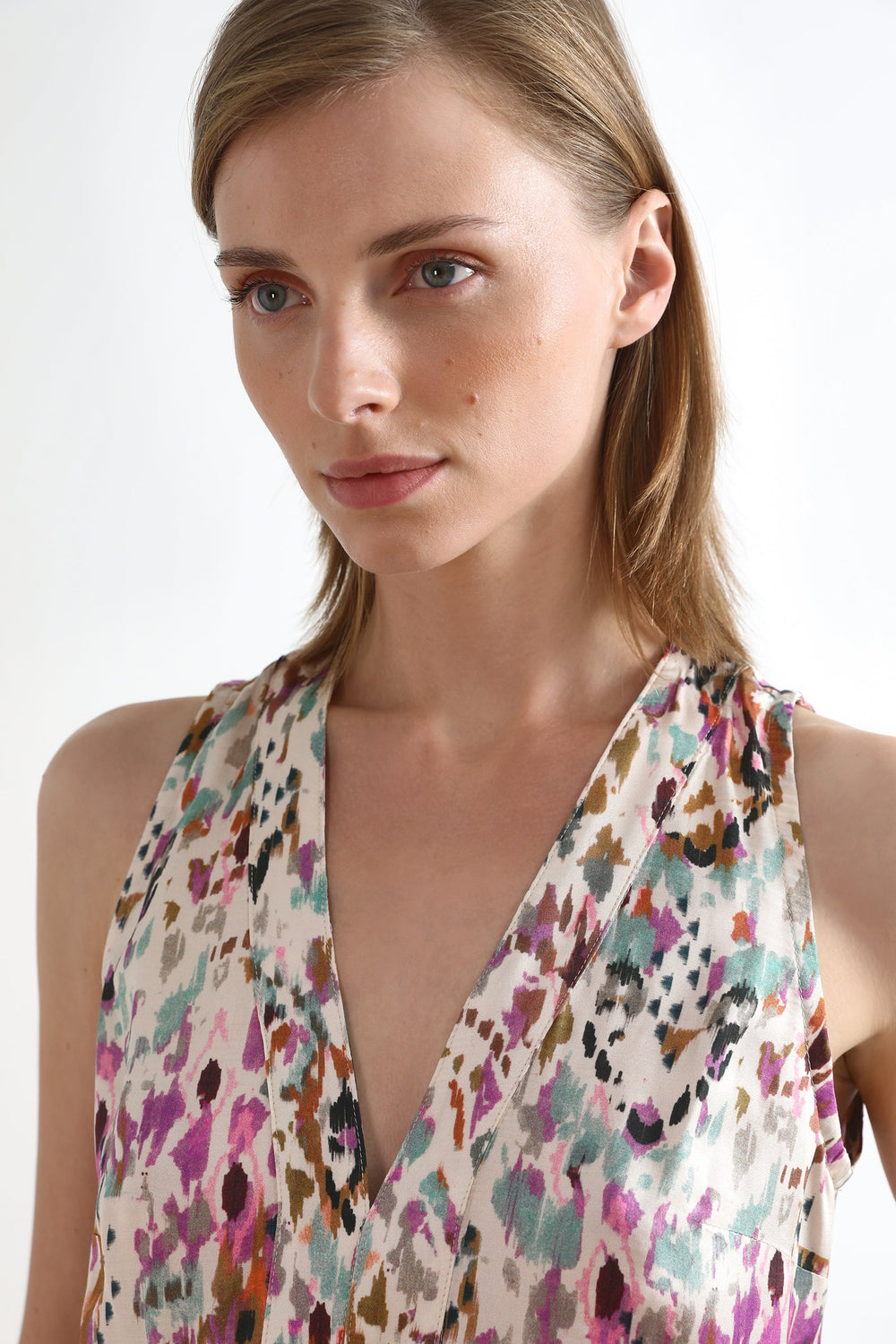 Top comprido com padrão multicolor.