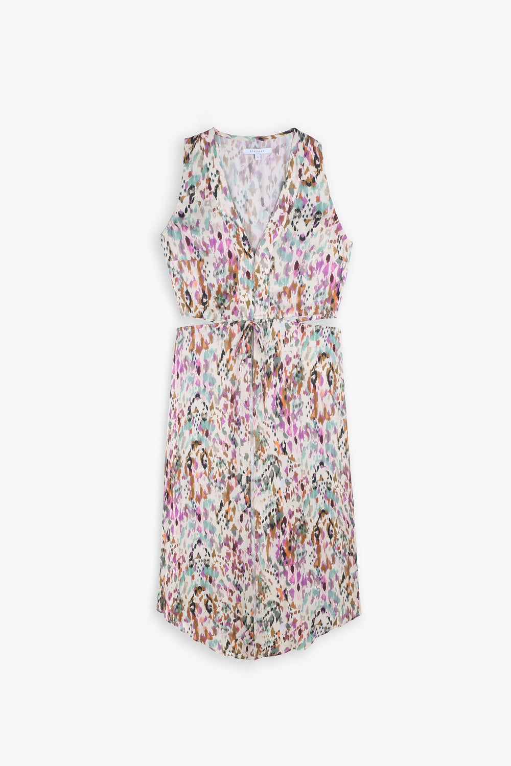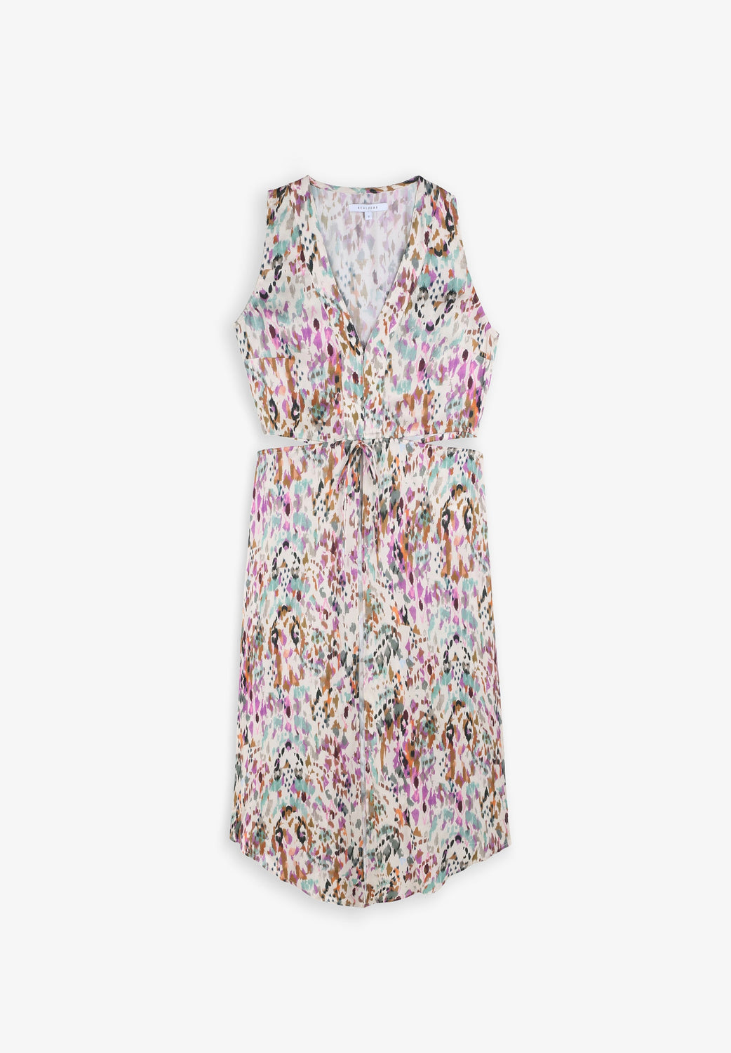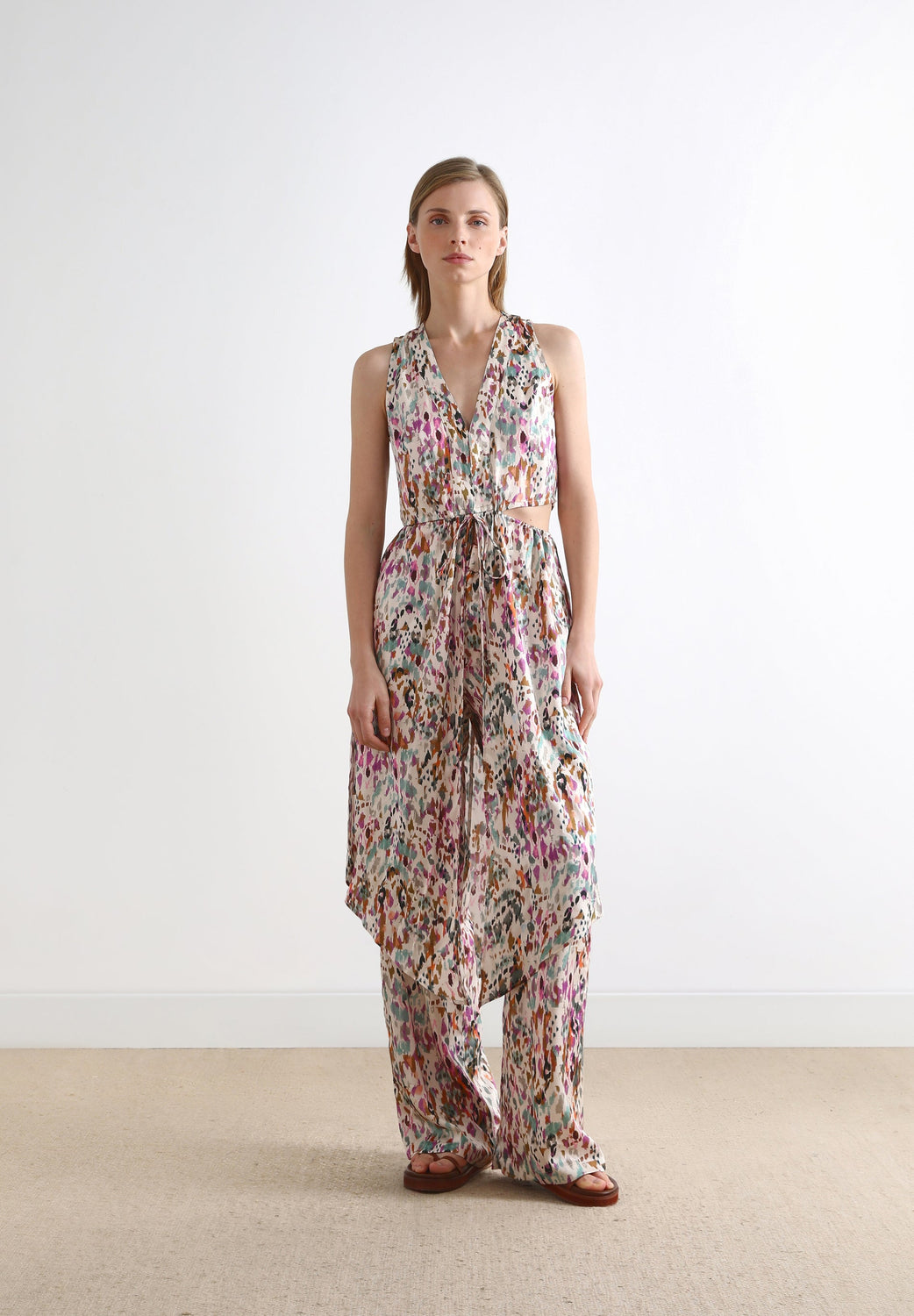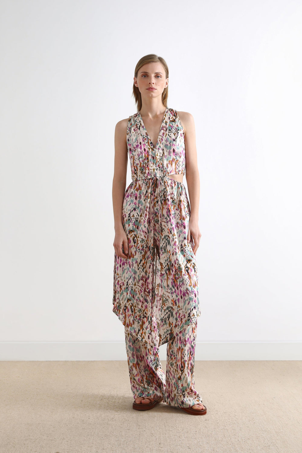 Top comprido com padrão multicolor.